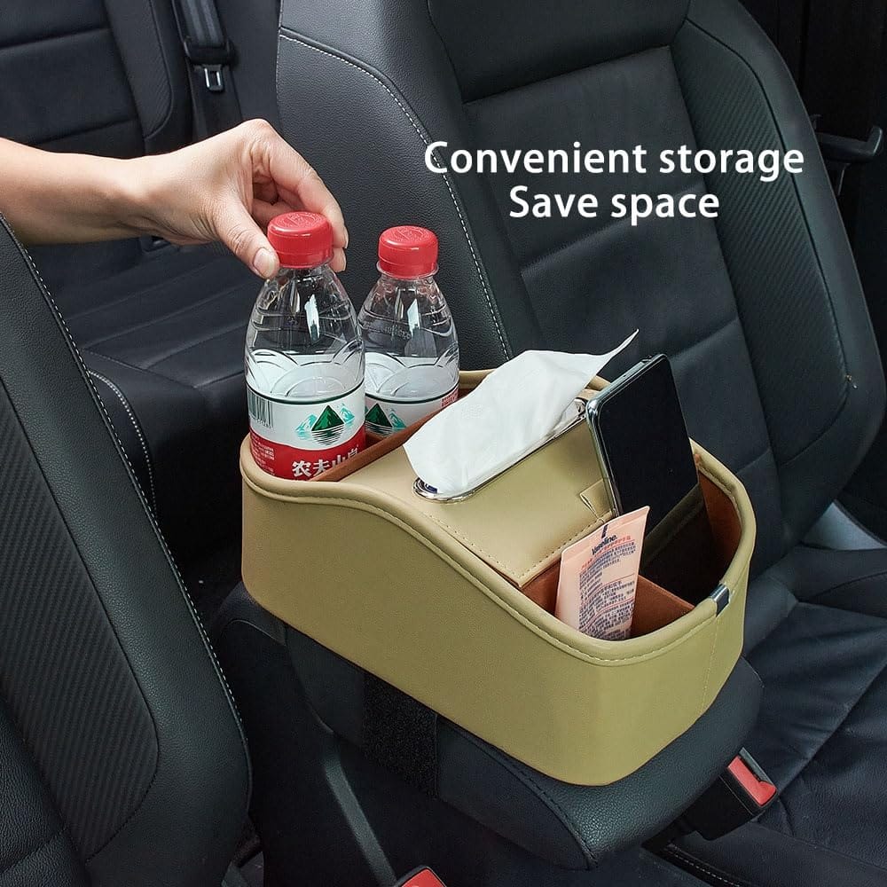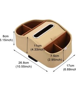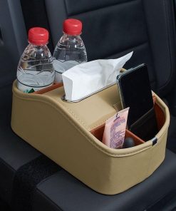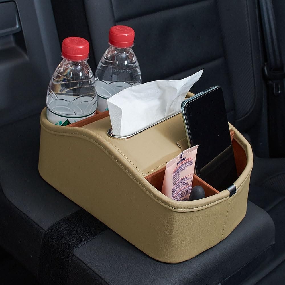 Un organizador multifuncional de coche y maletero que le ayudará a despejar el suelo y los asientos de su coche. Compacto suficiente para caber en su guantera o simplemente deslizado bajo un asiento para un almacenamiento fácil cuando no está en uso. Hecho de cuero de alta calidad y tablero de PVC grueso, resistente y a prueba de agua. Adecuado para asientos delanteros o traseros de cualquier tipo de vehículo. Equipado con V-elcro en la parte inferior para fijación, no hay necesidad de preocuparse por que se caiga durante la conducción. Tamaño de 10.55×6.69×3.15 pulgadas, vasos, pañuelos y artículos varios se almacenan en compartimentos separados para un uso fácil y no parecen desordenados. Material: cuero. Color: Beige. Incluye: 1 x Organizador de Asiento de Coche