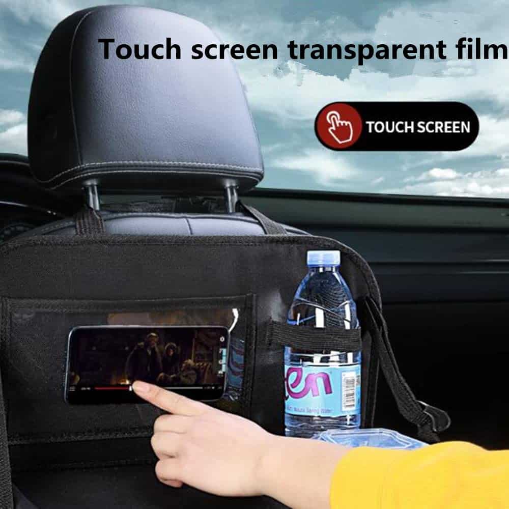 1. ORGANIZADOR DE ALMACENAMIENTO DE VARIOS BOLSILLOS: Este bolsillo colgante alargado para coche cuenta con múltiples compartimentos para almacenar ordenadamente juguetes, meriendas, tabletas y elementos esenciales, manteniendo tu vehículo libre de desorden.