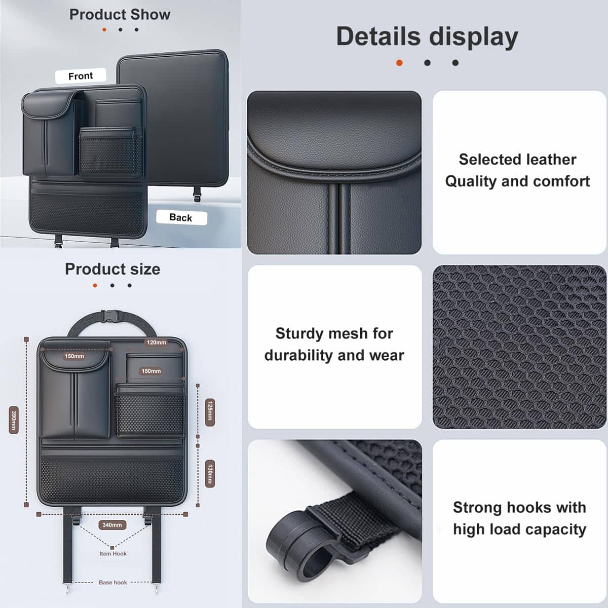 1. PU PREMIUM DE ALTA CALIDAD: El organizador de respaldo de asiento de coche está hecho de cuero PU de alta calidad. Impermeable y resistente al desgaste, suave y cómodo, forro a prueba de humedad, se puede usar durante mucho tiempo. La atención al detalle y la mano de obra fina le dan una calidad y apariencia excepcionales. Textura de alta calidad, hermosa y práctica. Muy fácil de limpiar, simplemente limpie con una toalla húmeda.