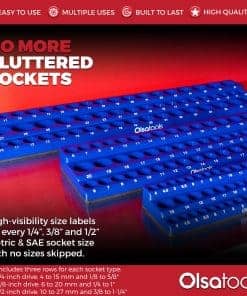 1. ¡HAZ TU TRABAJO MENOS FRUSTRANTE EN MINUTOS – Nuestros Organizadores Magnéticos de Enchufes evitan la frustración de ordenar el caos de los enchufes sueltos! Estos organizadores pueden almacenar hasta 264 de tus enchufes de acople de 1/4″, 3/8″ y 1/2″ en acople métrico y SAE. ¡Las marcas de tamaño fáciles de leer facilitan la selección del tamaño correcto de enchufe!