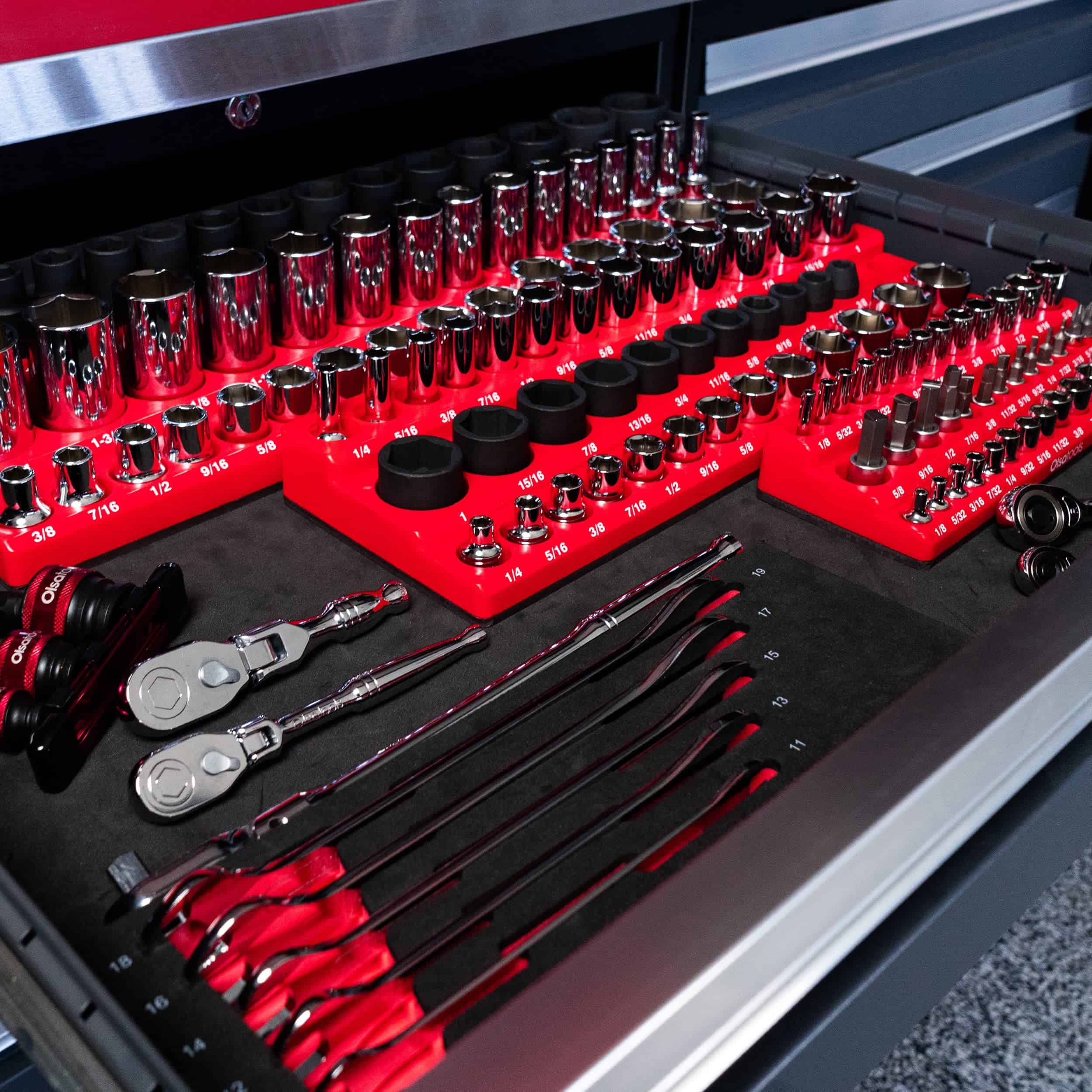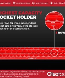 Haga su trabajo menos frustrante en minutos con nuestro organizador de enchufes magnéticos que ahorra la frustración de ordenar el caos de los enchufes sueltos. El organizador puede almacenar hasta 45 de sus enchufes SAE de 1/2 pulgada. ¡Las etiquetas de tamaño fáciles de leer facilitan la búsqueda del tamaño de enchufe correcto! Almacene sus enchufes en su cajón o montelo en el lateral de su caja de herramientas. La base magnética resistente mantiene sus enchufes en la bandeja y asegurados a cualquier superficie de acero (SÍ, incluso boca abajo). Este porta cuenta con etiquetas de tamaño de alta visibilidad para una selección rápida de enchufes. Montaje sin arañazos para proteger las superficies pintadas, construimos este organizador magnético de enchufes con una base magnética RECUBIERTA DE CAUCHO que nunca rayará ninguna superficie de acero donde lo monte. Por lo tanto, adelante y montelo en su caja de herramientas o armario de acero, sin preocupaciones. Si has estado buscando un organizador magnético de bandeja de enchufes que pueda contener TRES juegos de enchufes CROMADOS o DE IMPACTO en profundos y poco profundos, entonces tu búsqueda ha terminado. Incluye el rango de tamaño más popular para los enchufes métricos de 1/2 pulgada de 10 mm a 27 mm sin omitir ningún tamaño. La confianza de OLSA TOOLS: Nuestro compromiso con la calidad es la razón por la cual fanáticos de las herramientas como tú siguen regresando a nosotros por más. Todos los organizadores de enchufes de Olsa Tools están respaldados por una que protege su inversión contra cualquier defecto de fabricante. Además, la patente de este innovador organizador magnético de enchufes de 3 filas está actualmente en proceso y estamos esperando ansiosamente su aprobación. Agradecemos su apoyo.