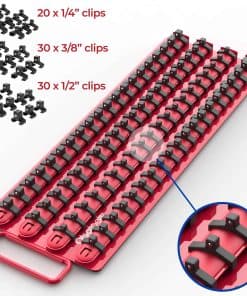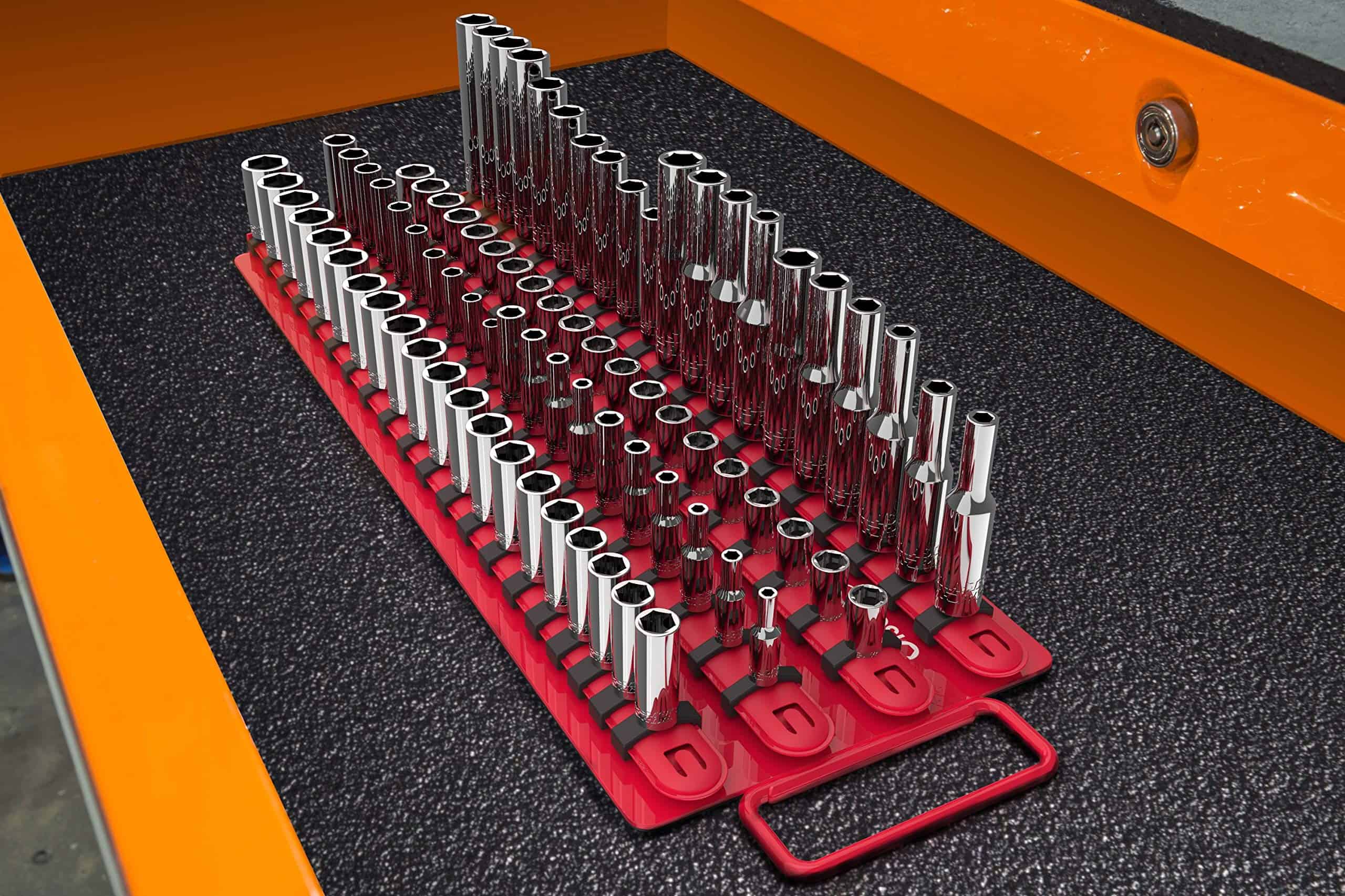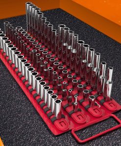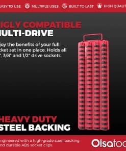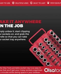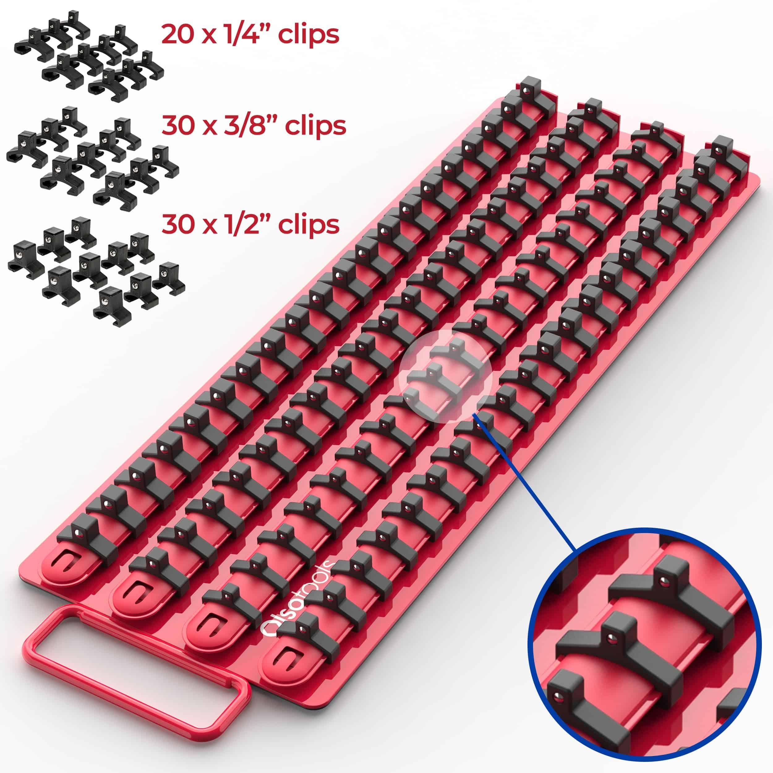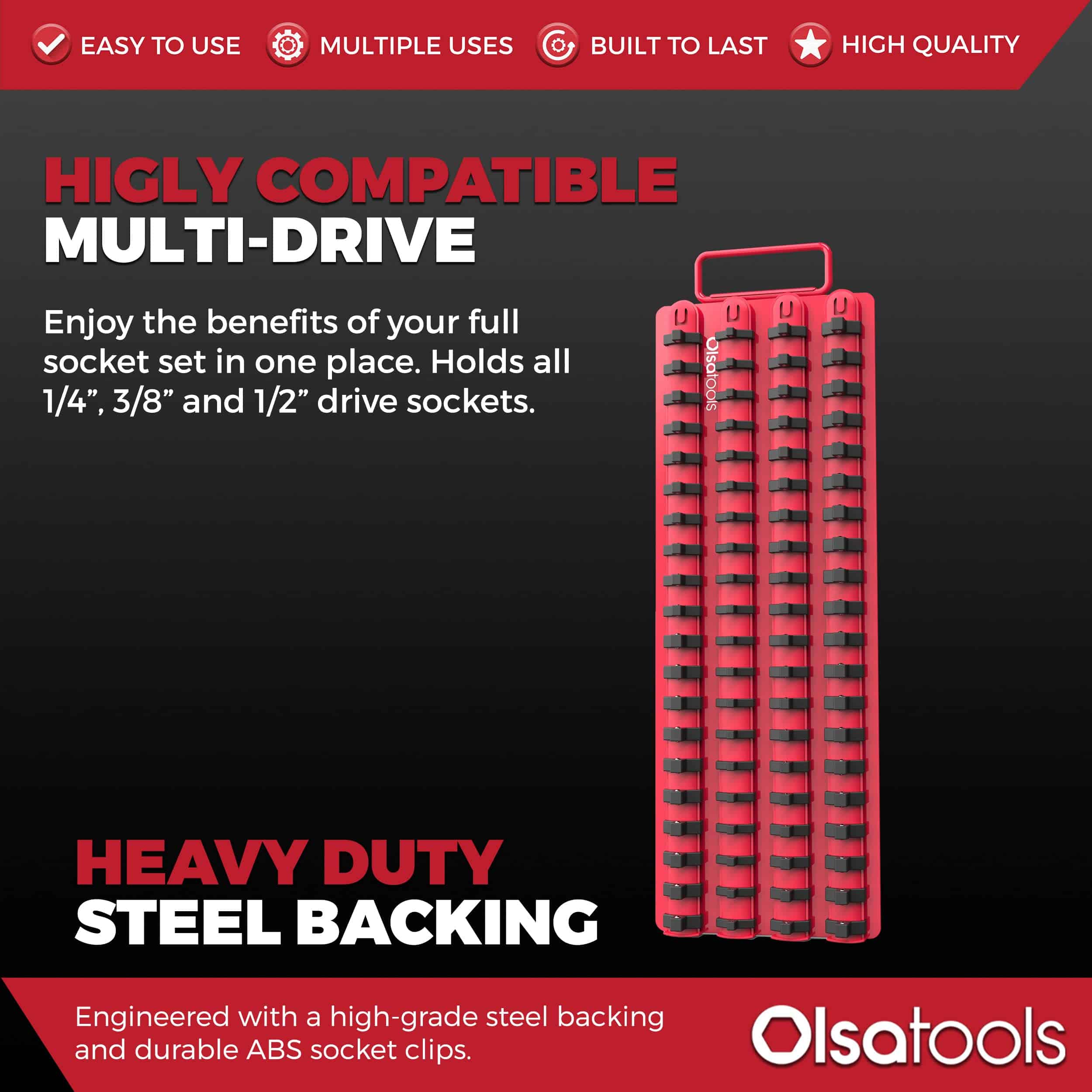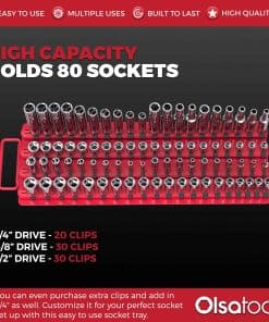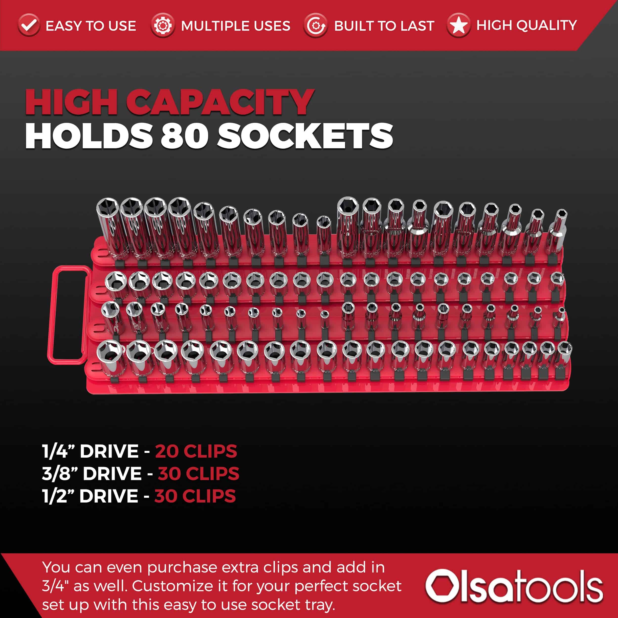 Stop letting your productivity be affected by having to constantly dig around your toolbox to find the right socket for the job. The spring-loaded socket clips securely organize a total of 80 of your sockets: 20 x 1/4 Inch drive, 30 x 3/8 Inch drive, 30 x 1/2 Inch drive sockets. Perfect for impact, chrome, deep, and shallow sockets. The Olsa Tools portable socket holder tray can hold 1/4, 3/8 and 1/4 inch drives. You can even purchase extra clips and add in 3/4 Inch as well. Customize it for your perfect socket set up. Finally, get started with organizing your pile of messy sockets with this easy-to-use socket tray. The Olsa Tools portable socket tray is so easy to use that youll get your messy sockets organized in minutes while saving space in your toolbox. Simply unbox it, start clipping your sockets on, and grab the handle so that you can take your socket tray anywhere. Engineered with a high-grade steel backing and durable ABS socket clips, you can have 100% confidence that your sockets well be held firmly and securely. No doubt that this tray for sockets will last you for years on end.