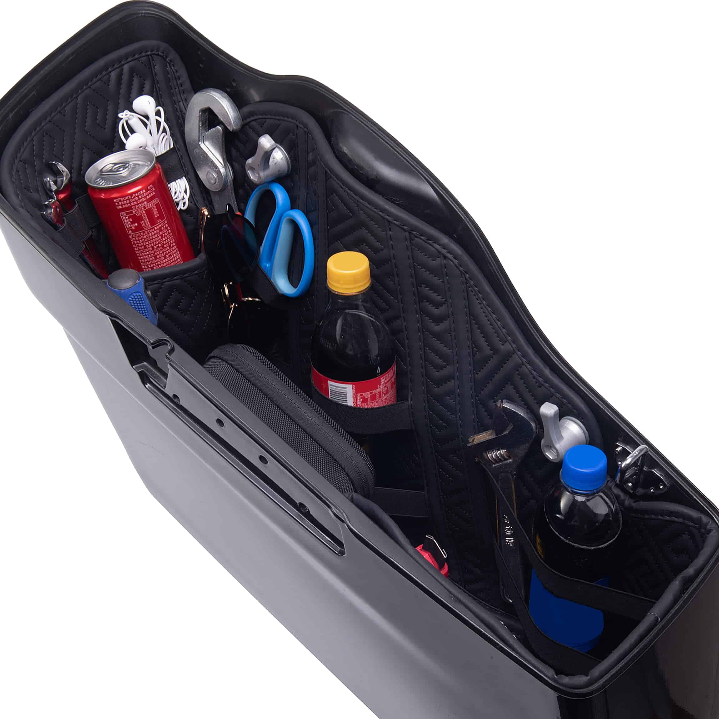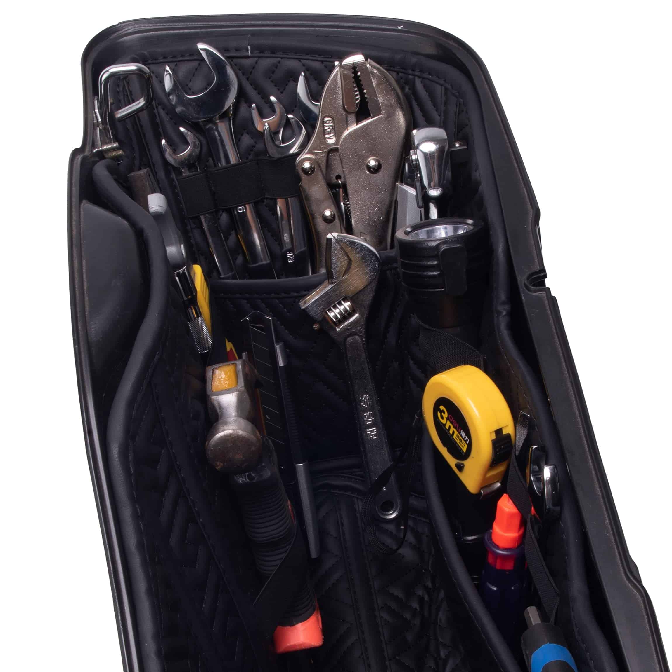Organizador de forro de alforjas Harley 2 en 1. Los forros de bolsas Harley están construidos con cuero sintético de alta calidad y cuentan con bolsillos de almacenamiento para sostener sus herramientas personales. El diseño de una sola pieza permite una fácil extracción para limpieza y mantenimiento.