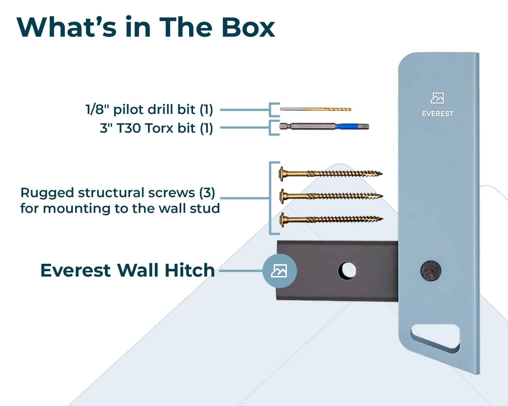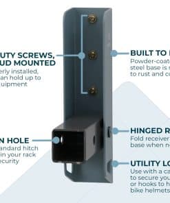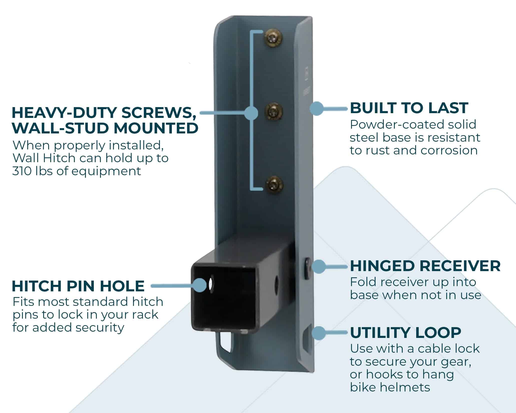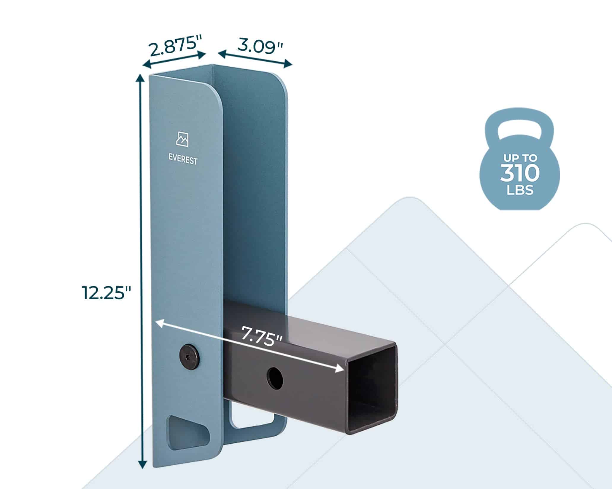 El Organizador de Pared Everest Hitch está fabricado con construcción de acero sólido recubierto de polvo que se destaca de nuestra competencia con un peso máximo de asombrosos 310 lbs. y capacidades de plegado. Pase de su paseo en bicicleta o remolque en su viaje de vacaciones directamente a su pared de garaje para un almacenamiento seguro. Esta unidad incluye el montaje así como el adaptador de enganche, lo que le permite pasar de 1 1/4 a 2 pulgadas todo en uno. La instalación sencilla solo requiere golpear el centro de su montante de pared con nuestros (3) tornillos estructurales resistentes que se proporcionan con una broca piloto y una broca Torx para asegurar que su receptor esté listo. Nuestro impresionante soporte de pared para rack de bicicleta de garaje almacena fácilmente todo tipo de racks y si usted tiene un rack de bicicletas montado en enganche, rack de esquí o portaequipajes entonces este es un artículo imprescindible para su garaje.
