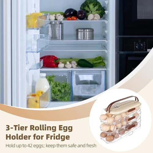 2. Gran Capacidad y Diseño Eficiente de Espacio: Diseñado para aprovechar al máximo el espacio de tu nevera, este compacto organizador de huevos mide aproximadamente 13 x 8.5 x 6.5 pulgadas, permitiéndote almacenar hasta 42 huevos sin abarrotar los estantes de tu nevera. Su capacidad de apilamiento vertical garantiza que puedas mantener tus huevos organizados, haciendo que tu nevera luzca ordenada y bien arreglada.