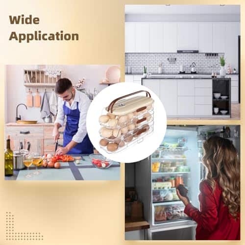 1. Diseño Automático de Rodado: Este dispensador de huevos cuenta con un inteligente diseño de auto rodado, asegurando que tus huevos se deslicen sin esfuerzo hacia adelante para un acceso fácil. La leve inclinación ingeniosamente diseñada evita que algún huevo se atasque, permitiendo una recuperación suave en todo momento. Olvídate de los días en los que tenías que alcanzar los huevos en cajas endebles.