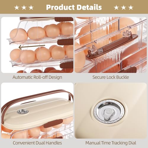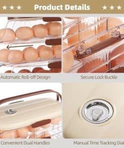 4. Dial Manual de Seguimiento de Tiempo: Este organizador de huevos está equipado con un dial de seguimiento de tiempo, proporcionando una solución práctica para monitorear la frescura de los huevos. Simplemente ajusta el dial para llevar un control de cuándo fueron almacenados los huevos. Esta característica es perfecta para garantizar la seguridad de tu familia al mantener siempre huevos frescos a mano para tus recetas favoritas.
