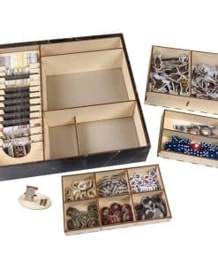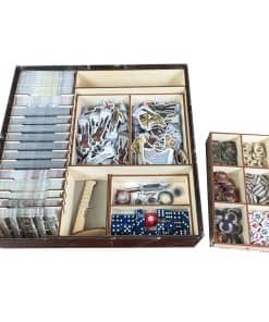 No tienes tiempo para una configuración larga cuando los zombies se están acercando. Comienza a luchar más rápido con nuestro Organizador de Undead Winter compatible con la caja de juego de Dead of Winter. Todas las piezas del juego están contenidas en bandejas extraíbles que facilitan la configuración. El carril de cartas es lo suficientemente ancho para cartas enfundadas e incluimos 13 separadores para dividir cada tipo de carta. NOTA: No es compatible con Warring Colonies. CAPACIDAD DE CARTAS (con Separadores de Stock) Sin funda: 761 Sleeves de «Premium» de 0.1mm: 446 Fundas de 0.04mm: 593 CAPACIDAD DE CARTAS (Sin Separadores) Sin funda: 894 Sleeves de «Premium» de 0.2mm: 523 Fundas de 0.04mm: 696 Las capacidades son aproximadas y se basan en el grosor promedio de la carta y de la funda. Los resultados reales pueden variar. La sección de cartas de este organizador está dividida y etiquetada para el juego base y es compatible con fundas estándar de 0.04mm y fundas premium de 0.1mm. Esto no es adecuado para fundas más gruesas como Dragon Shield. Dimensiones de la fila de cartas: 9.93″ x 3.77″ x 2.3″ (252mm x 96mm x 58mm) Dimensiones: 11.32″ x 11″ x 2.3″ (287.5mm x 279mm x 58mm) Notas sobre las cartas enfundadas: Las imágenes muestran todas las cartas enfundadas en fundas Mayday Premium Sleeves (MDG7077). Debido al espacio adicional necesario para las fundas premium, los espacios de separación de las cartas están preestablecidos para ti. Los grabados en el lado de la pared indican qué cartas ocupan cada ranura. Este organizador está diseñado para el juego original de Dead of Winter. Si buscas un organizador diseñado para Dead of Winter: The Long Night, por favor consulta nuestro Organizador Long Winter (ORG069). Este producto es un kit que requiere montaje. Recomendamos el uso de pegamento de madera (se vende por separado). Debido a diferencias en la fabricación, impresión y edición, los tamaños de las cajas pueden variar y puede que no sean compatibles con la versión para la que fueron diseñados nuestros kits. Por favor mide el interior inferior de tu caja de juego para confirmar la compatibilidad con las dimensiones del organizador mencionadas anteriormente.