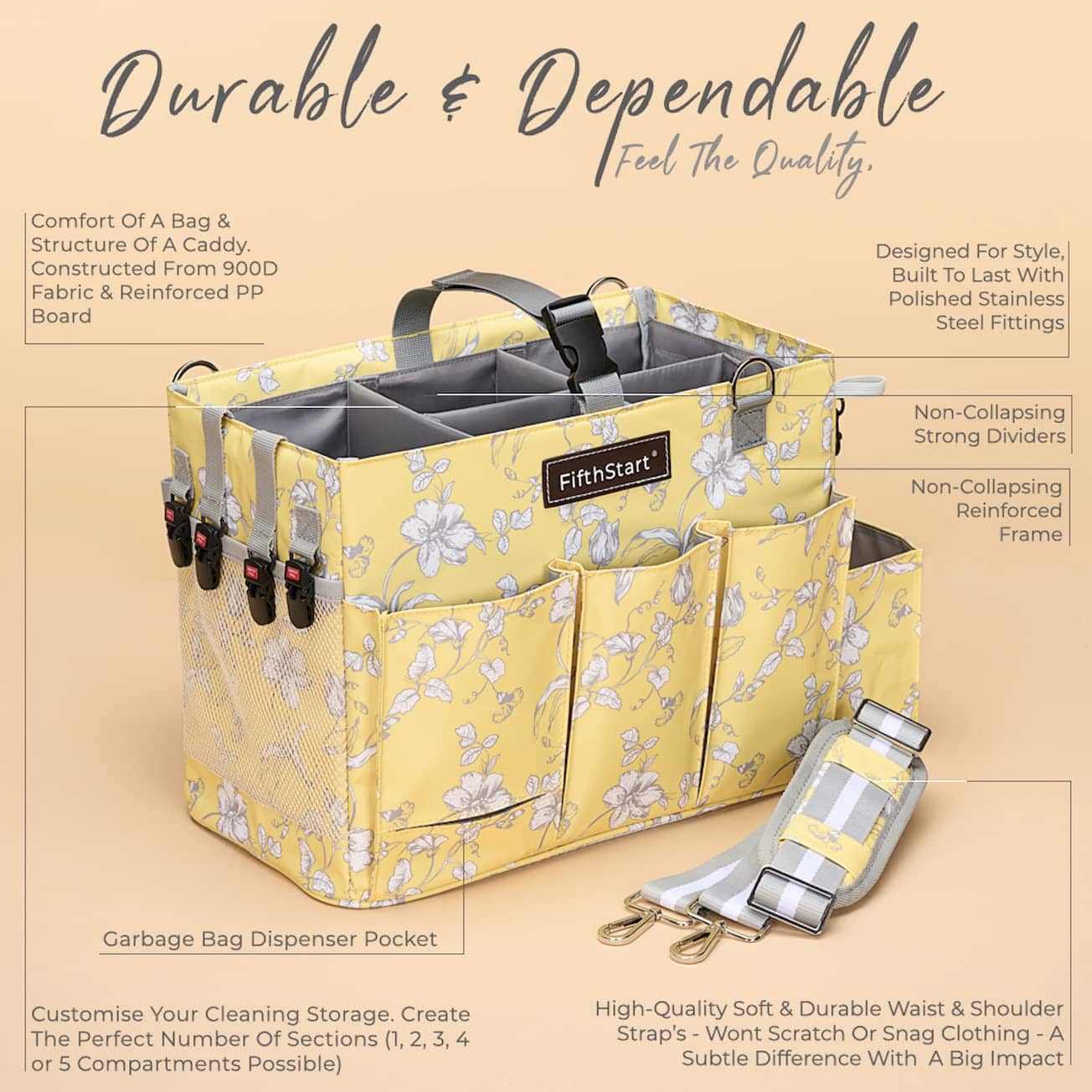 3. Máximo espacio de almacenamiento: Nuestro organizador de suministros de limpieza tiene 5 divisores internos ajustables y 4 bolsillos exteriores, brindando un máximo espacio de almacenamiento para tus suministros, sin ruidos constantes. Incluye un dispensador de bolsas mini y clips de cocodrilo para mayor conveniencia.