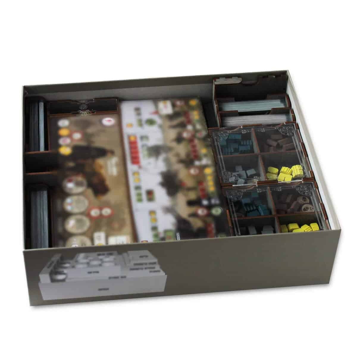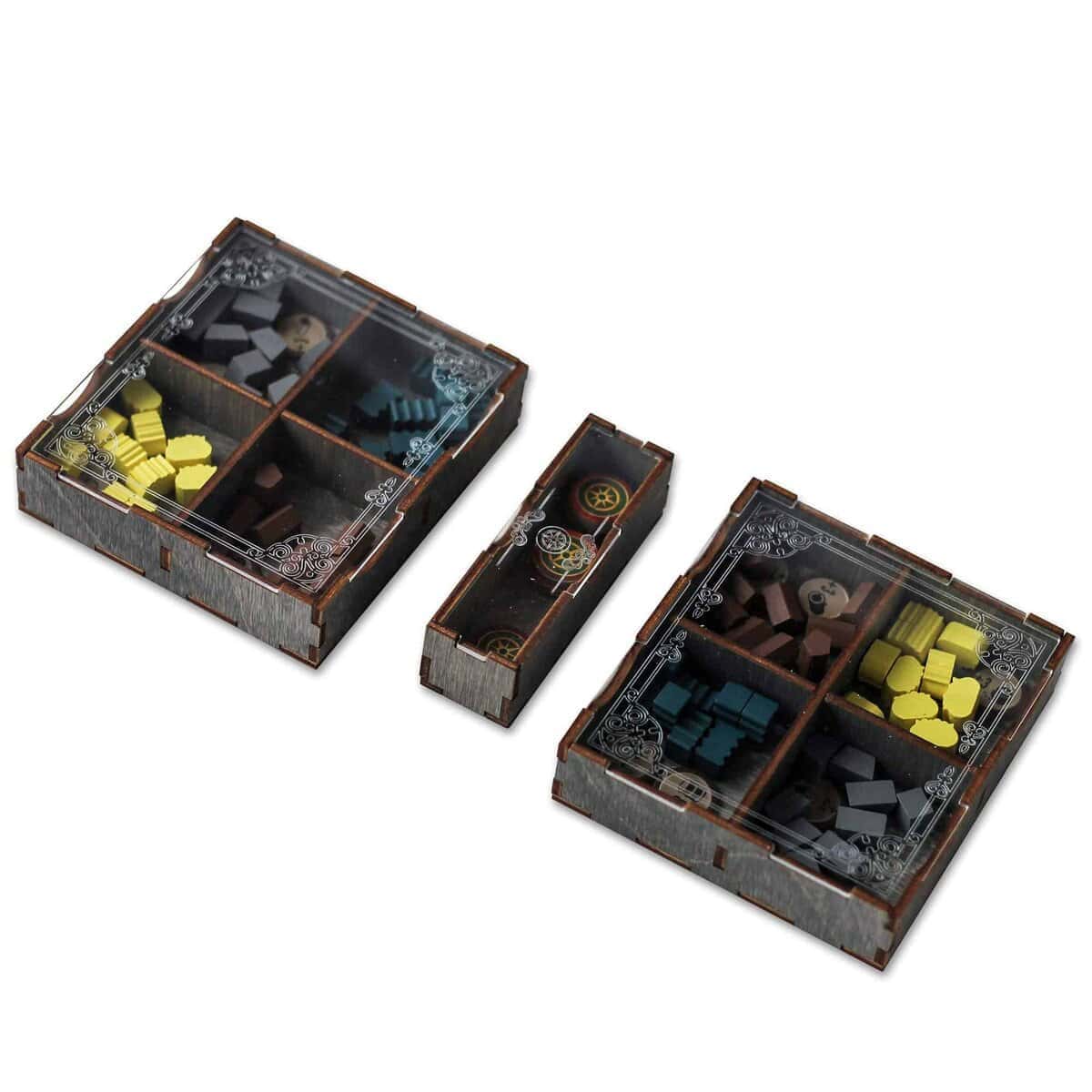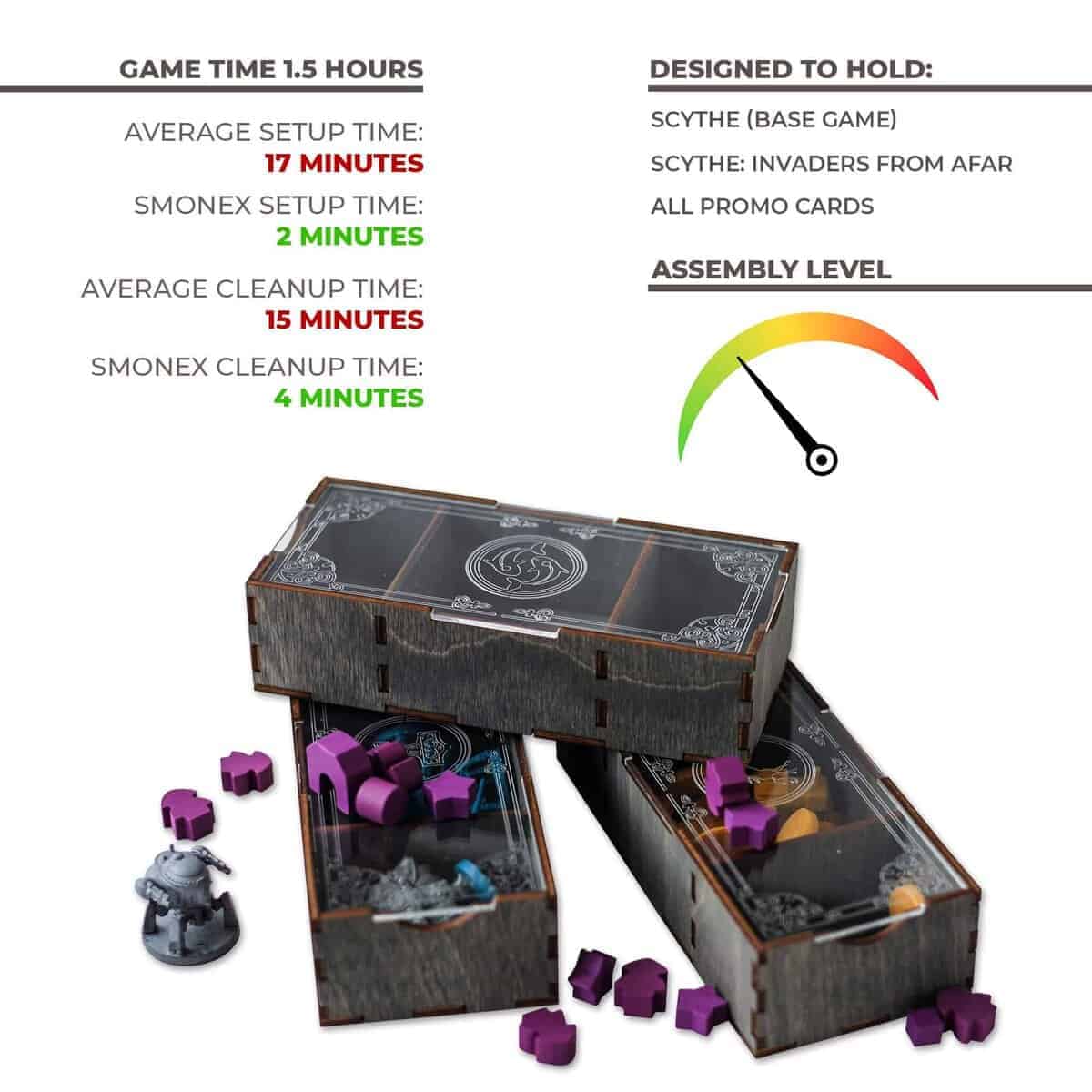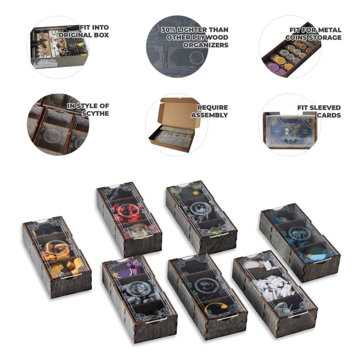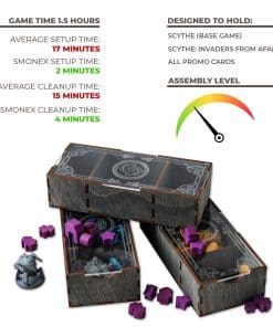 La misión principal de Smart One Box (Smonex) es una caja realmente inteligente para todo. Nosotros nos encargaremos de la seguridad y el almacenamiento de tus juegos de mesa y tú los disfrutas. Nuestro equipo está formado por fanáticos de los juegos, por lo que todos los accesorios, organizadores y complementos que fabricamos son probados empíricamente y por nosotros personalmente. ¡Aprecia la calidad decente de nuestros tableros de jugador y tapetes, organizadores, bandejas, cajas y otros accesorios para juegos de mesa y conviértete en parte de nuestro equipo! Toma bajo control una de las fracciones en la historia alternativa de Europa en los años 20 del siglo pasado y lleva a tu pueblo a la riqueza y la prosperidad! ¡Sumérgete profundamente en el juego de mesa y Smart One Box (Smonex) te ayudará a organizar tu espacio de juego! Nuestro equipo ha creado 18 elementos para el organizador con insertos de acrílico. La caja incluye (el juego de mesa no está incluido y se vende por separado): – siete bandejas de diferentes fracciones con cubiertas de acrílico para mantener a salvo miniaturas, héroes, robots, trabajadores y otros elementos – dos bandejas de recursos donde puedes clasificar fácil y prácticamente recursos: madera, comida, metal y aceite mineral – bandeja de monedas donde puedes almacenar todas las monedas de Scythe – cinco portacartas diferentes con insertos de acrílico para las cartas de Automa, misiones, encuentros, fábrica y batallas – dos soportes de mapas para la fijación del tablero de juego – azulejos de encuentros con cubierta protectora ¡Disfruta tu juego con los organizadores de Smart One Box!