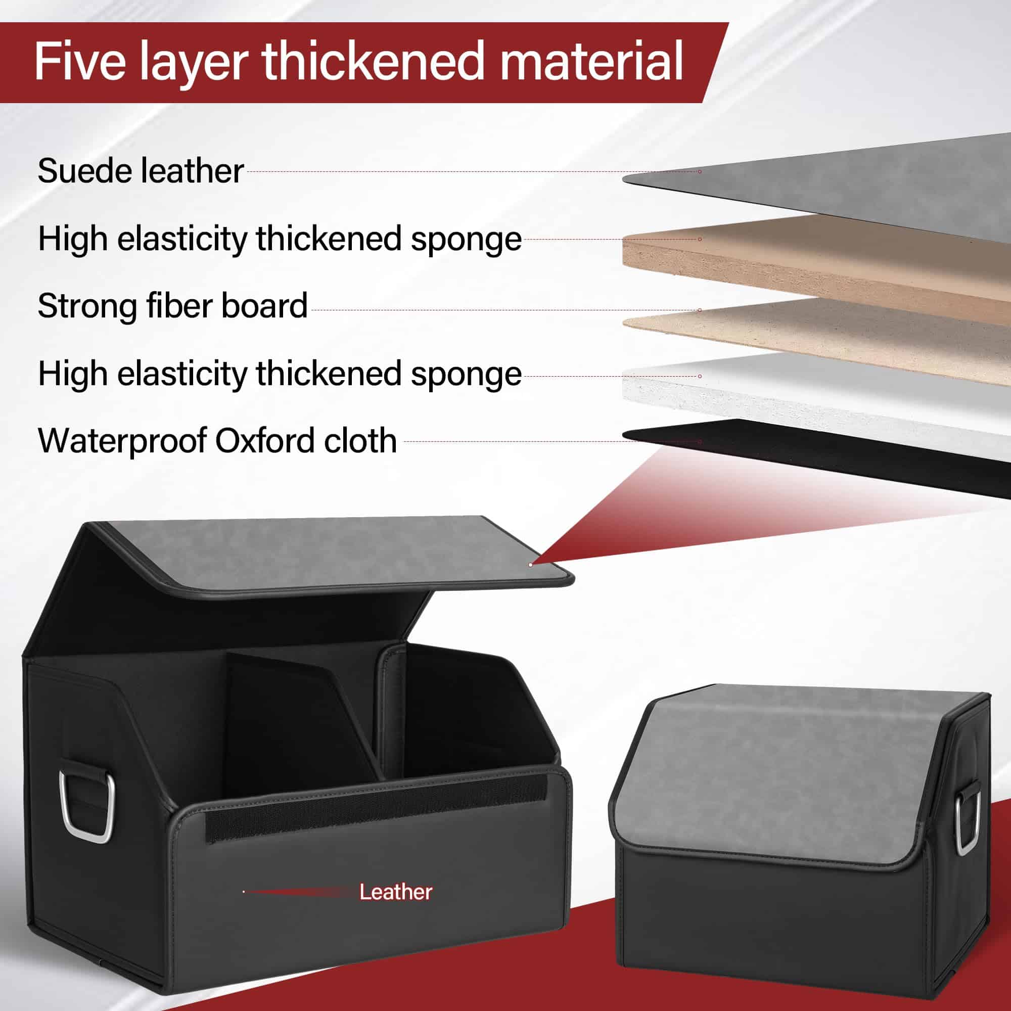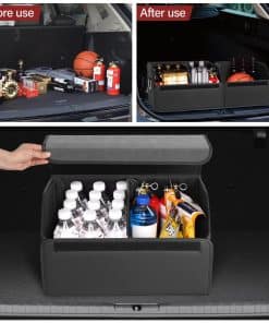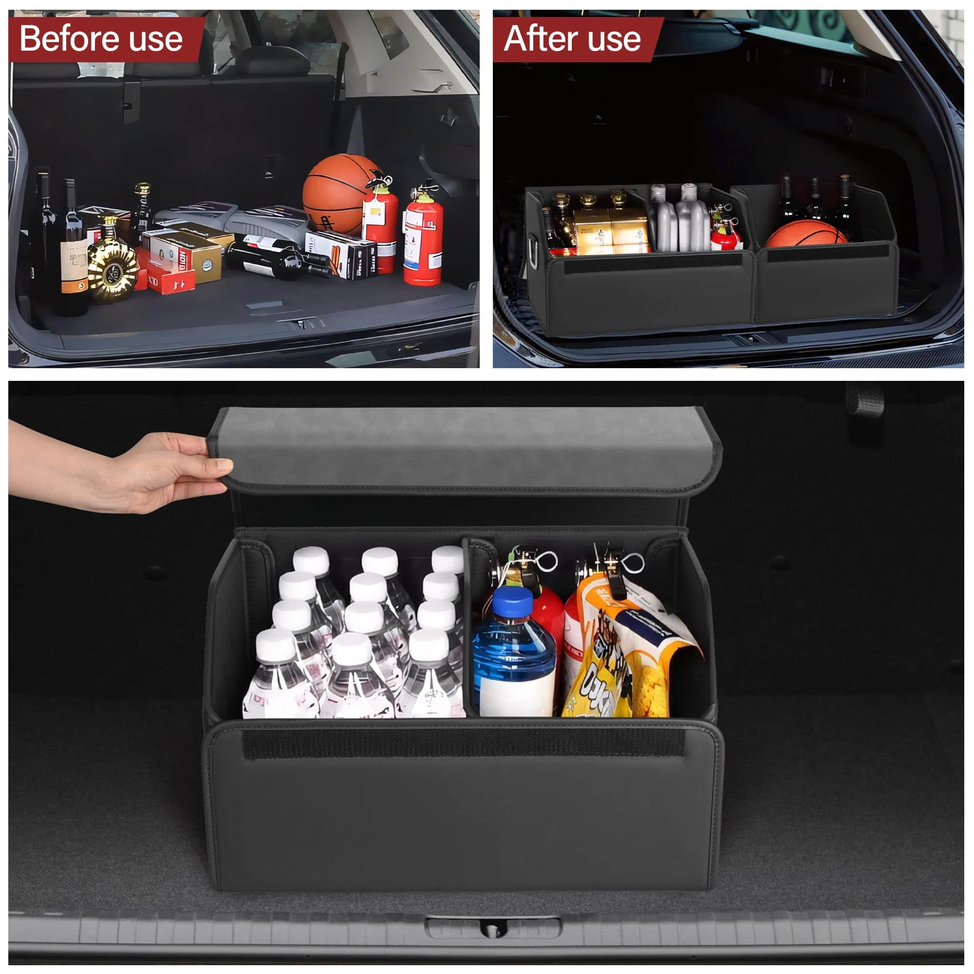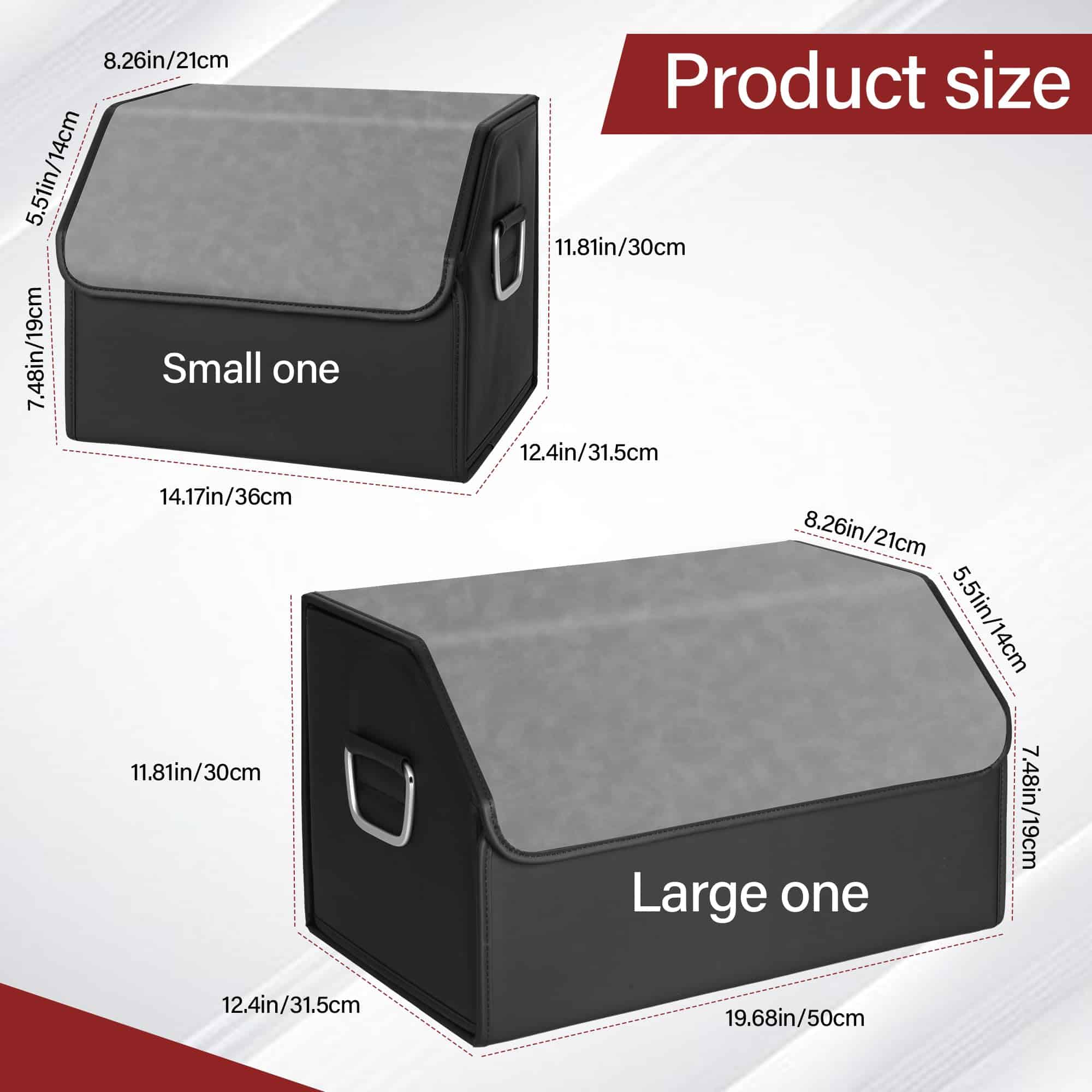Materiales de alta calidad: Este organizador de maletero está hecho de gamuza y cuero premium, con una apariencia elegante y de alta gama, resistente y resistente al desgaste, y no teme ser dañado cuando se coloca en el maletero. Gran capacidad: Este organizador de autos tiene una capacidad enorme y puede contener artículos diversos en el automóvil, como zapatos, balones de baloncesto, comida, agua, etc. También puedes poner ropa, mantas, documentos y otros materiales. Comparado con las bolsas de almacenamiento de maletero generales en el mercado, es mucho más fuerte, especialmente para algunos productos fácilmente dañados. Colocarlo aquí será extremadamente tranquilizador. Multifuncional: Esta caja de almacenamiento no solo se puede utilizar en el automóvil, sino también como una caja organizadora de hogar/oficina. También se puede utilizar como una caja de camping para salidas de fin de semana, con múltiples funciones y escenarios. La caja de almacenamiento de alta calidad mejora tu calidad de vida. Plegable: Esta caja de almacenamiento no ocupa mucho espacio y se puede plegar y almacenar, lo que facilita la instalación cuando se usa. Está instalado con velcro y viene con una cubierta de adsorción magnética, lo que hace que el diseño general sea avanzado y simple. Tamaño: El tamaño del grande es 50 cm x 31.5 cm x 30 cm y el del pequeño es 36 cm x 31 cm x 30 cm.