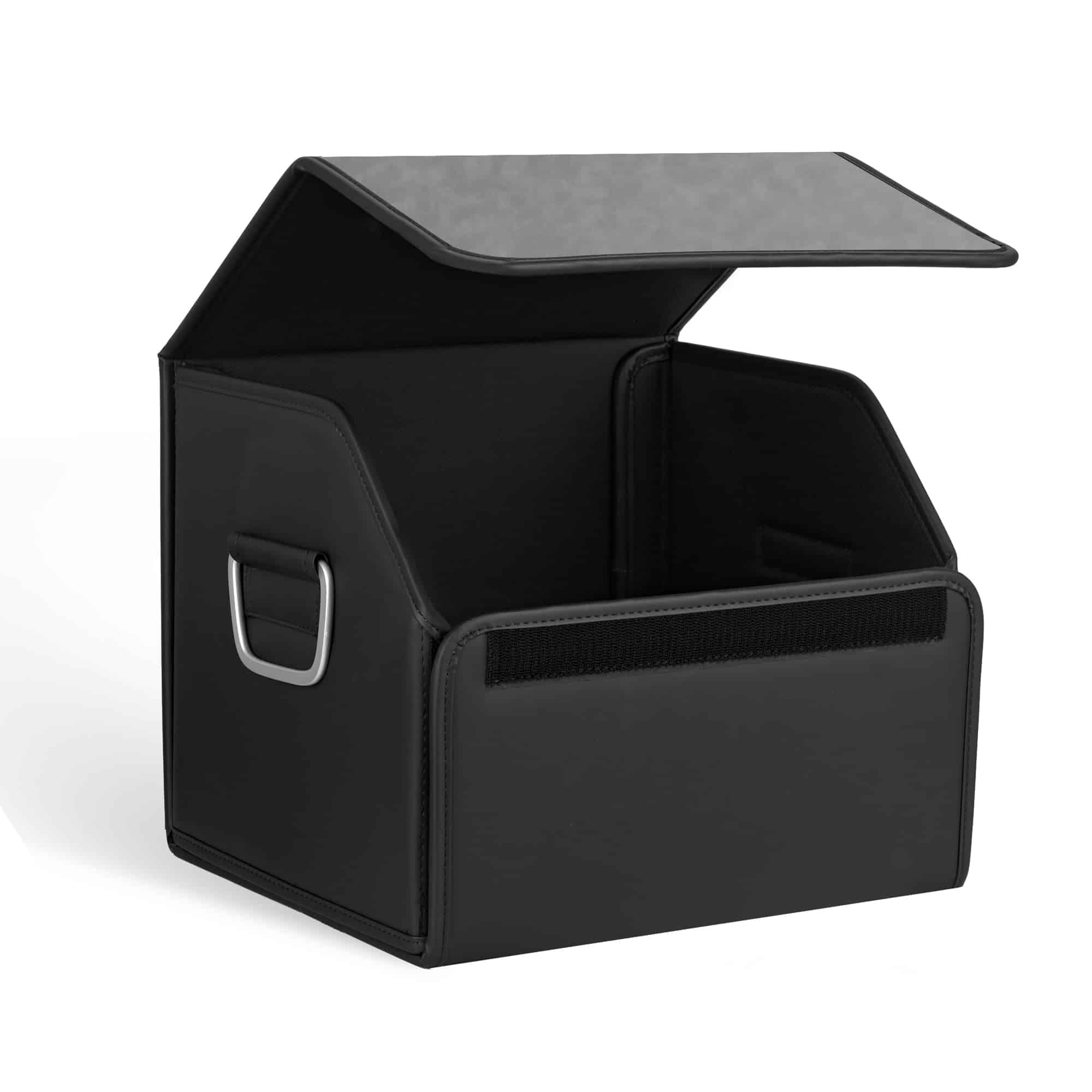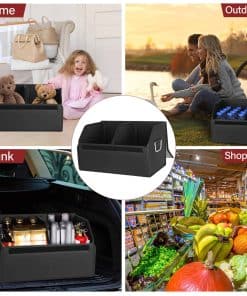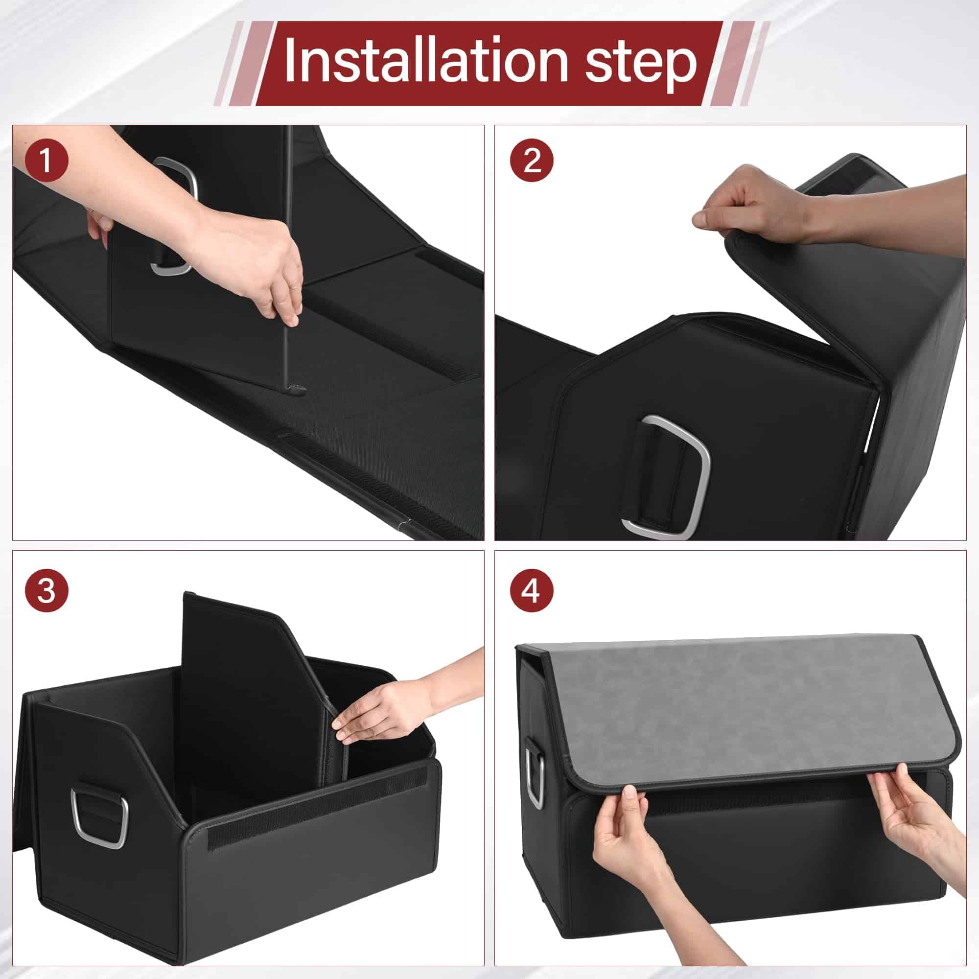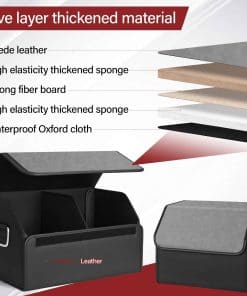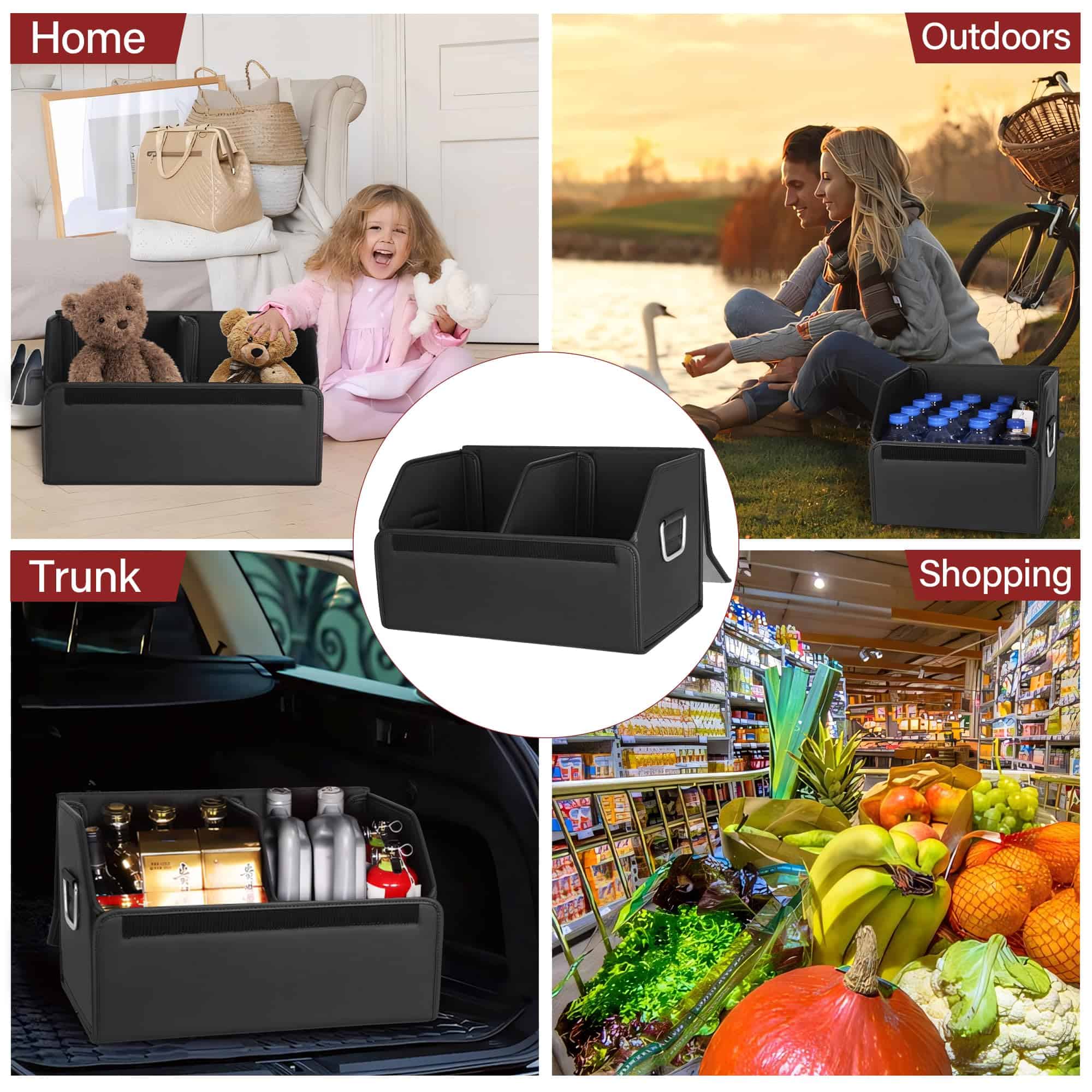 Materiales de alta calidad: Este organizador de maletero está hecho de gamuza y cuero premium, con una apariencia elegante y de alta gama, resistente y resistente al desgaste, y no teme ser dañado cuando se coloca en el maletero. Gran capacidad: Este organizador de autos tiene una capacidad enorme y puede contener artículos diversos en el automóvil, como zapatos, balones de baloncesto, comida, agua, etc. También puedes poner ropa, mantas, documentos y otros materiales. Comparado con las bolsas de almacenamiento de maletero generales en el mercado, es mucho más fuerte, especialmente para algunos productos fácilmente dañados. Colocarlo aquí será extremadamente tranquilizador. Multifuncional: Esta caja de almacenamiento no solo se puede utilizar en el automóvil, sino también como una caja organizadora de hogar/oficina. También se puede utilizar como una caja de camping para salidas de fin de semana, con múltiples funciones y escenarios. La caja de almacenamiento de alta calidad mejora tu calidad de vida. Plegable: Esta caja de almacenamiento no ocupa mucho espacio y se puede plegar y almacenar, lo que facilita la instalación cuando se usa. Está instalado con velcro y viene con una cubierta de adsorción magnética, lo que hace que el diseño general sea avanzado y simple. Tamaño: El tamaño del grande es 50 cm x 31.5 cm x 30 cm y el del pequeño es 36 cm x 31 cm x 30 cm.