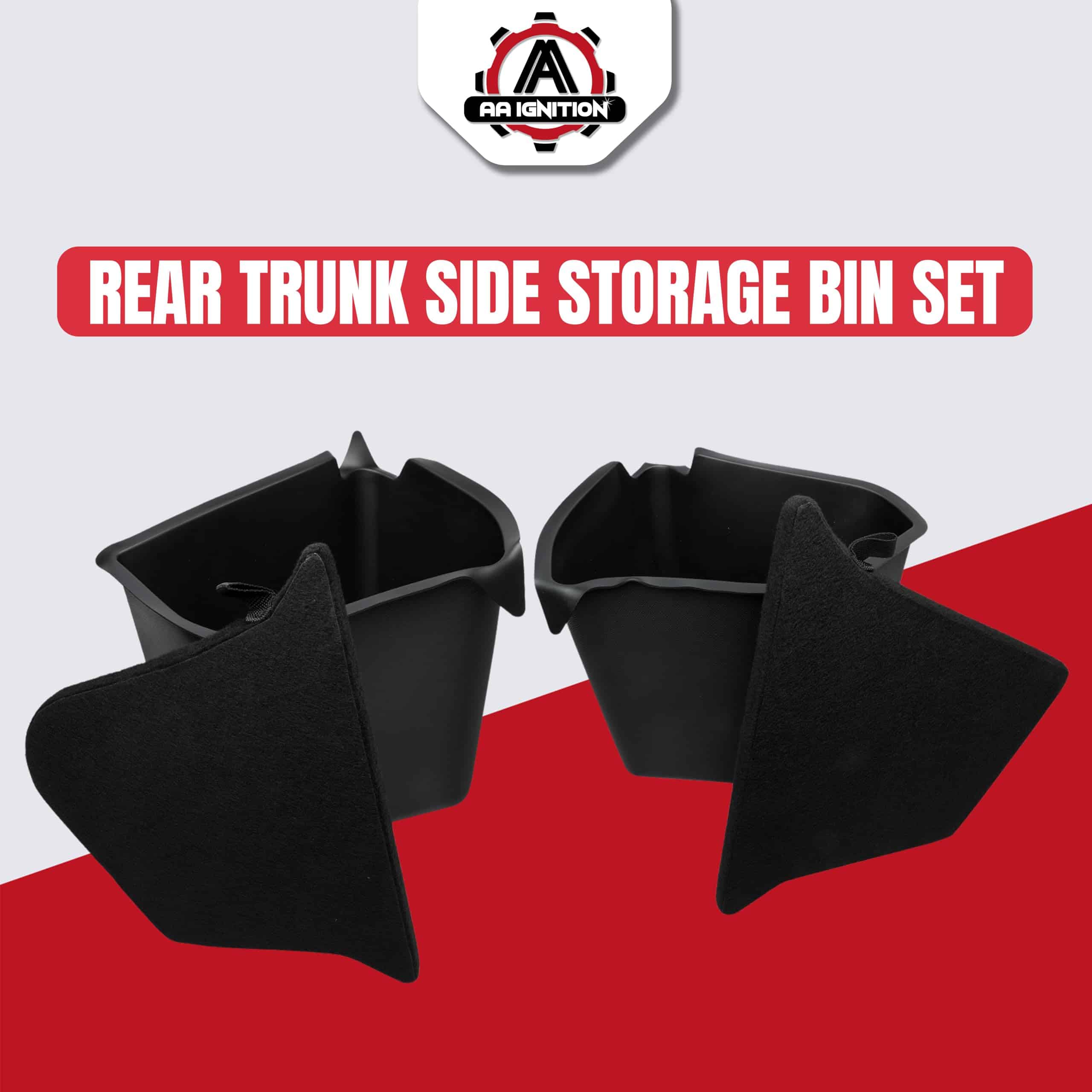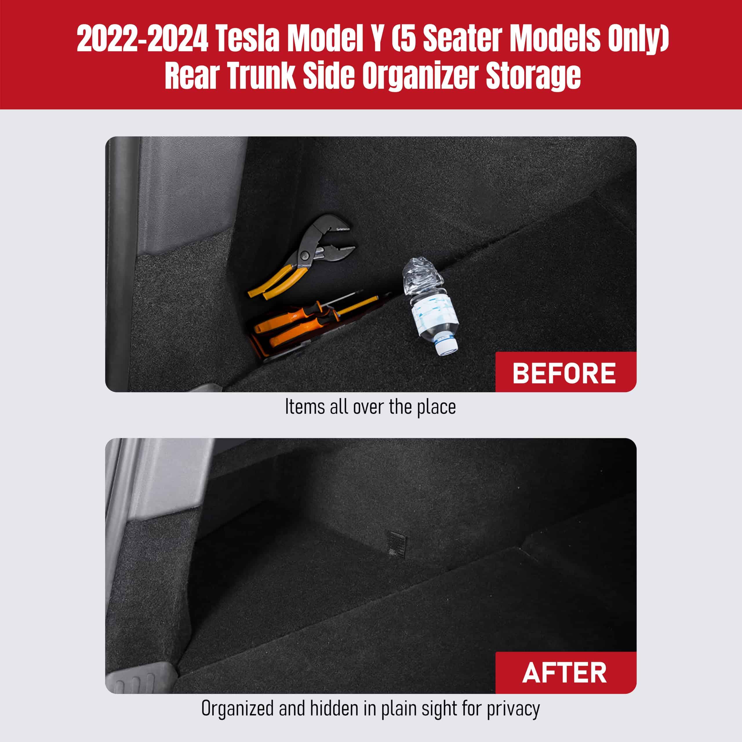1. JUEGO DE ORGANIZADOR DE ALMACENAMIENTO LATERAL DE MALETERO TRASERO – Diseñado específicamente para encajar en los compartimentos laterales del maletero trasero del Model Y y son accesorios prácticos y convenientes para maximizar el espacio de almacenamiento en su vehículo, proporcionando una solución ordenada y organizada para almacenar artículos más pequeños.
