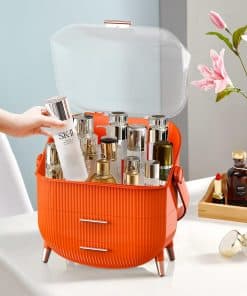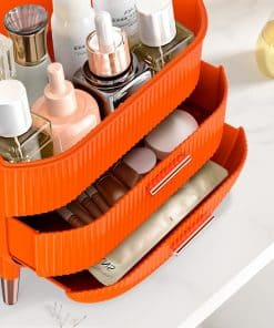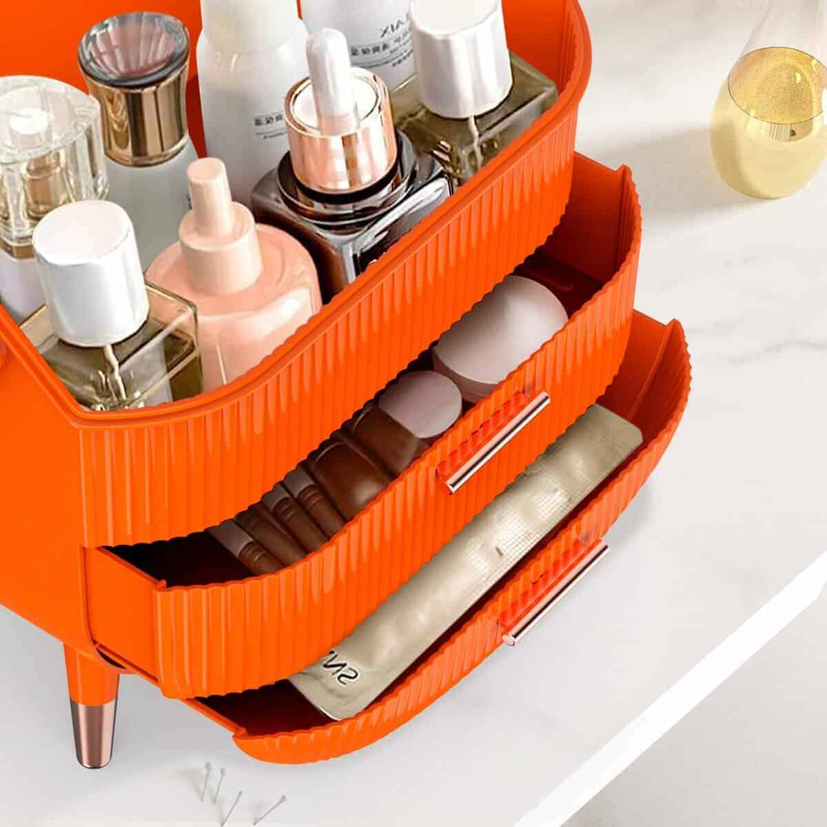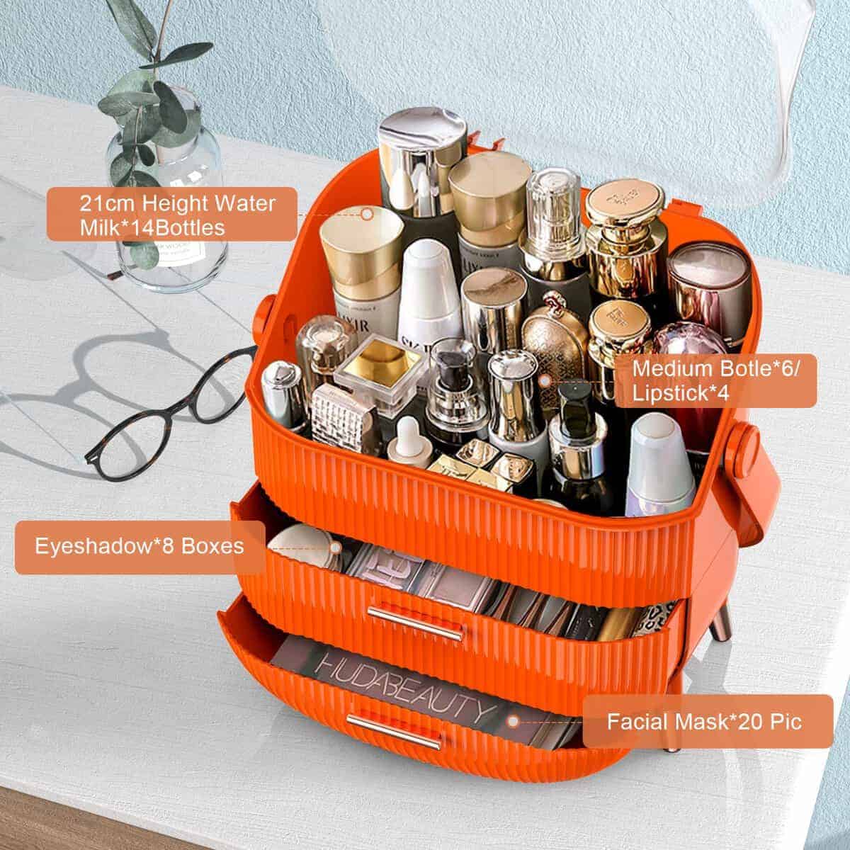 1. Tres capas de almacenamiento de gran capacidad: el organizador de maquillaje de 11,5x7x13,3 pulgadas puede contener botellas altas de crema para el agua, crema que puede contener 10 botellas de altura, 5 botellas de esencia, dos capas de caja de almacenamiento de cajones pueden colocar 5 barras de labios, 4 cajas de sombras de ojos, 5 cajas de polvos, 10 brochas de maquillaje y otros pequeños artículos.