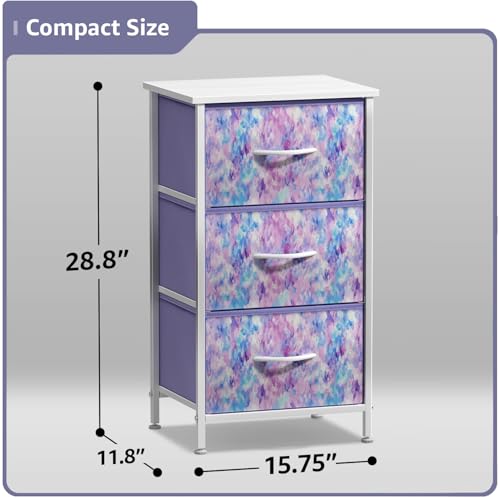 1. Mesita de noche de 3 cajones (Tie-Dye, Azul/Rosa/Morado): El estilo se une a la funcionalidad con nuestra mesa auxiliar ligera, completa con una superficie de madera y cajones de almacenamiento – Combina maravillosamente con la Colección de Muebles Plegables de Sorbus. 2. Mostrar y despejar: La parte superior de madera proporciona una superficie dura para mostrar lámparas, despertadores, libros, gafas, estación de carga y más – Los cajones de la mesita de noche ocultan el desorden, accesorios, gadgets, artículos de aseo, mantas, sábanas, cosméticos, productos para el cabello/belleza, ropa de bebé, lencería, calcetines, documentos, juguetes, mantas, suministros para tejer, etc. 3. Elegante para cualquier habitación: Adecuado para guardería, sala de juegos, dormitorio de niños, preadolescentes, adolescentes, habitación de invitados, armario, pasillo, dormitorio universitario, soluciones para apartamentos pequeños, etc. – Versátil como tocadores para dormitorio, tocador cubo de almacenamiento, tocador de 3 cajones, tocador de armario pequeño, baúl de almacenamiento, tocador de sala de estar, mesitas auxiliares de sofá, almacenamiento de suministros de oficina, mesita de noche para niños, o mesa de guardería para bebés. 4. Cajones extraíbles y plegables: Cajones de tela suave con base reforzada – Asa de agarre fácil para abrir y cerrar silenciosamente – Los cajones extraíbles se pliegan planos para un fácil almacenamiento cuando no están en uso. La unidad entera es portátil, ligera y fácil de trasladar a diferentes espacios – Cada cajón tiene aproximadamente 8 de profundidad. 5. Diseño de moda Tie-Dye: Almacenamiento vertical elegante – Hecho con estructura de acero resistente y parte superior de madera MDF duradera con acabado blanco liso – Hecho de tela no tejida (poliéster) – Limpiar con un paño – Montaje mínimo requerido – Hardware e instrucciones INCLUIDOS – Medidas aproximadas de 15.75 L x 11.8 W x 28.8 H – Los contenedores miden 13.75 x 11 x 8.25 pulgadas.