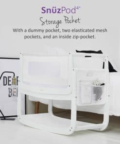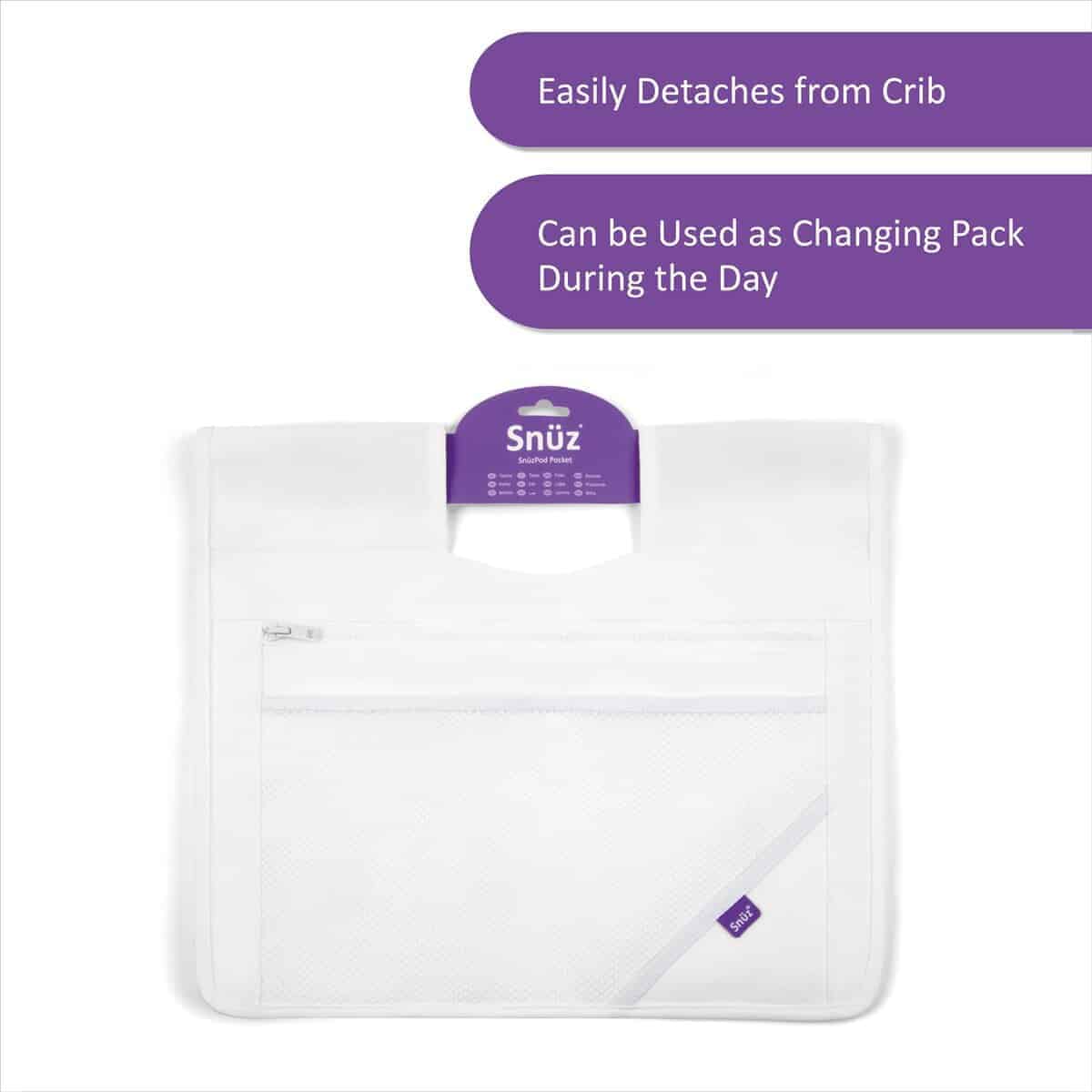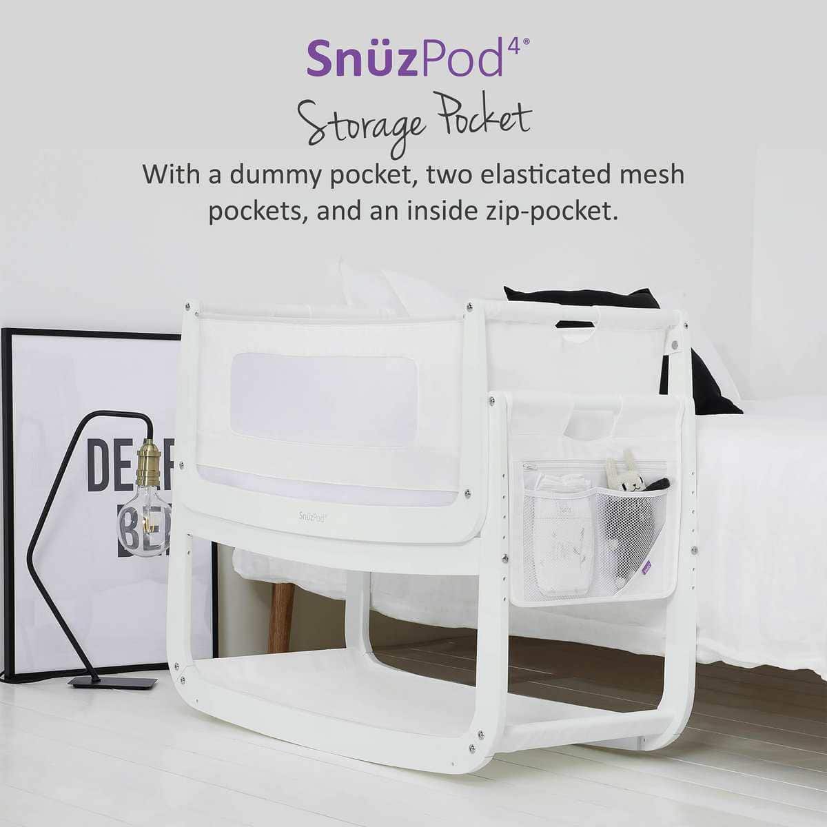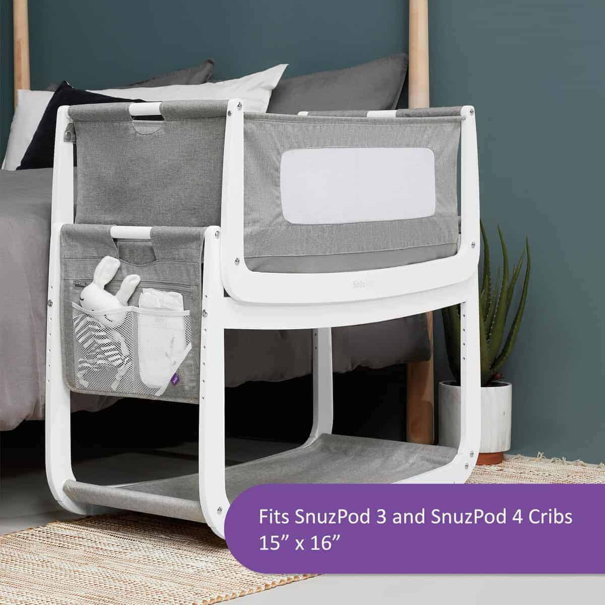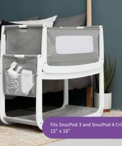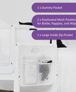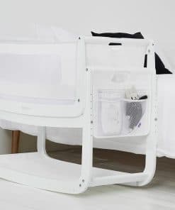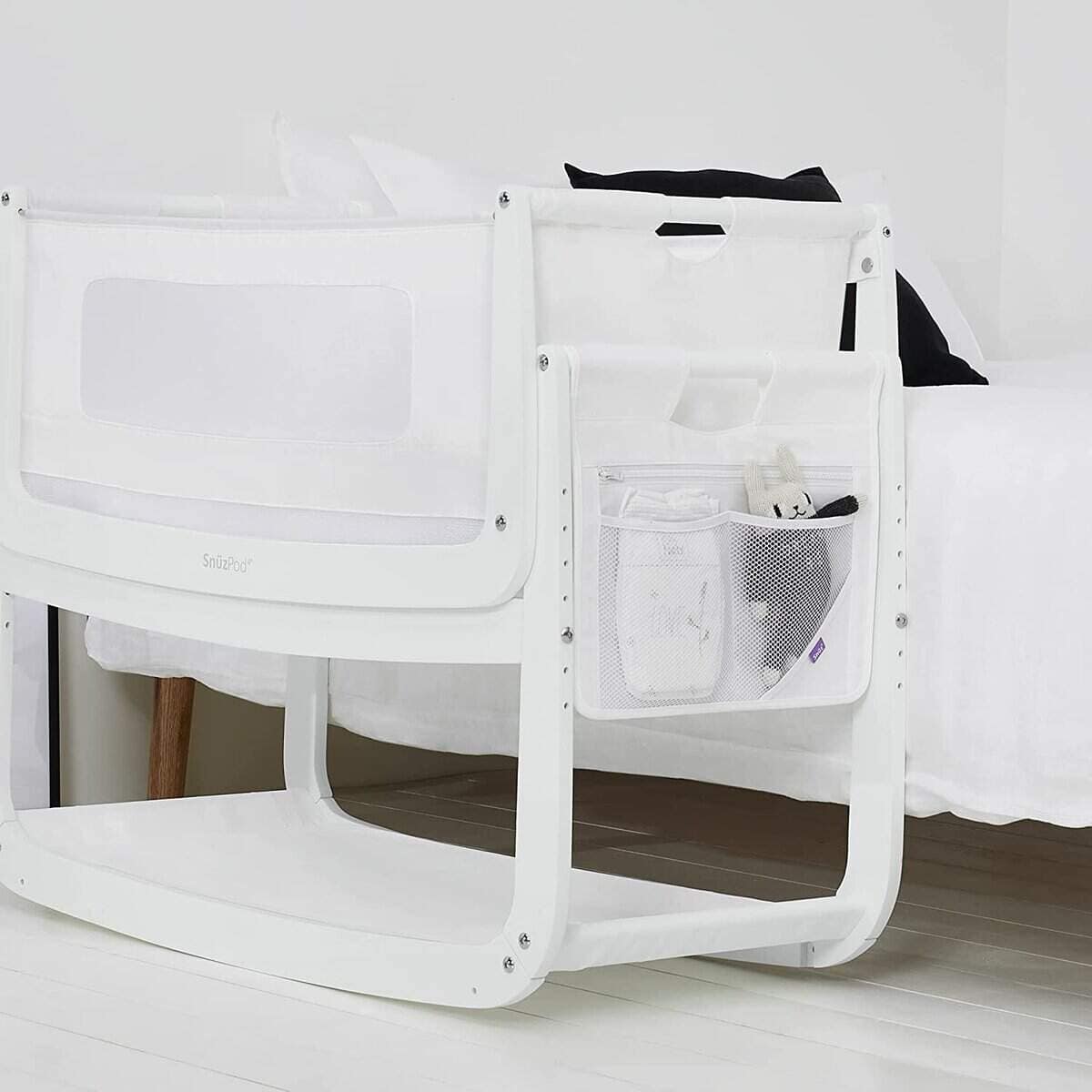 Organizador de pañales colgante en blanco para cunas con múltiples bolsillos para guardar biberones, toallitas y más. Portátil y se puede usar como bolso cambiador. Hecho de tela de lona lavable a mano, duradero y de larga duración. Ideal para crear el ambiente de sueño definitivo para tu bebé, con el SnuzPod Storage Pocket que hace que la hora de la siesta sea más fácil para los padres y los bebés cansados. Mantén los elementos esenciales de la noche cerca con un bolsillo para el chupete, dos bolsillos de malla para el biberón, pañales y toallitas, y un bolsillo grande con cremallera. Diseño elegante y portátil que satisface todas tus necesidades de día y noche. Puede desengacharse fácilmente de la cuna de tu bebé en la guardería y usarse como un bolso cambiador durante el día en casa y en movimiento. Tamaño de 14 x 16, perfecto para las cunas SnuzPod y la mayoría de las cunas estándar. Galardonado por Made for Mums y Junior Design Awards por su calidad superior y diseño elegante.