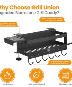 3. Funcionalidad mejorada con soporte de toallas de papel y ganchos dobles incorporados: Nuestro caddy de parrilla para parrilla cuenta con un soporte de toallas de papel incorporado, proporcionando comodidad y facilidad de limpieza. El diseño mejorado de ganchos dobles garantiza estabilidad, permitiéndote organizar tus utensilios de cocina sin tambalearse ni caerse. Es una adición fantástica a tu parrilla Blackstone, haciendo que las fiestas de barbacoa sean más rápidas y agradables!.