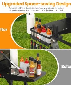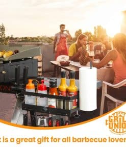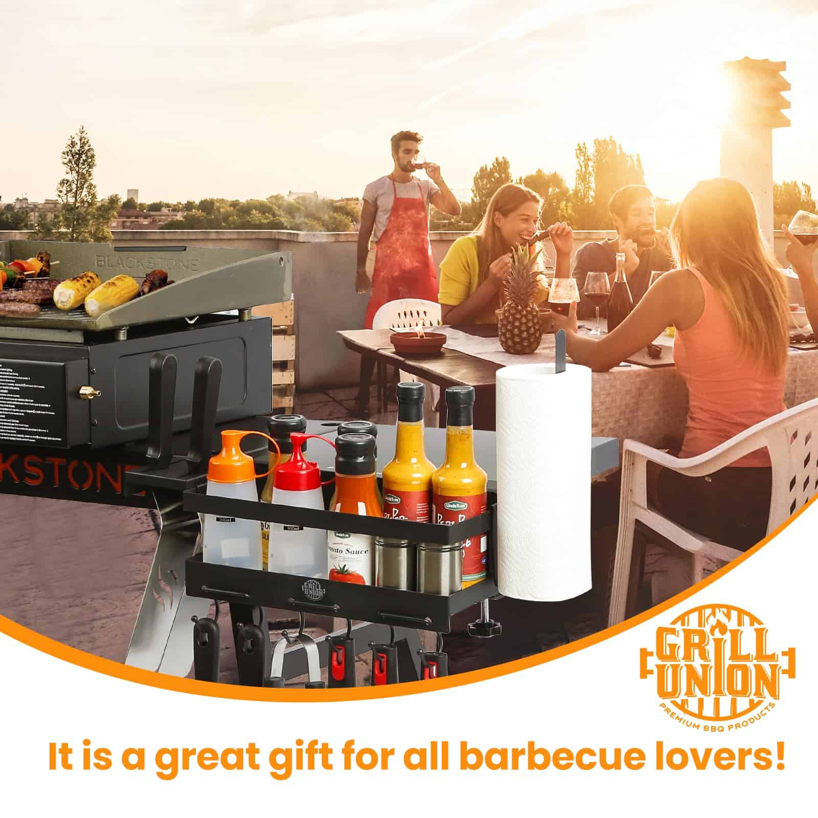 4. Parrilla al aire libre organizada: Con el organizador de caddy de parrilla Grill Union, puedes mantener todos tus esenciales de parrilla al alcance de la mano. Di adiós a volcar condimentos o buscar utensilios. Este caddy mantiene todo perfectamente organizado y fácilmente accesible cada vez que lo necesites. Ya sea que estés cenando una barbacoa, haciendo un picnic, un viaje de campamento o un evento de tailgating, este soporte de herramientas de parrilla mejorado es imprescindible para todos los entusiastas de la barbacoa!.