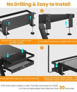 5. Garantía de satisfacción del 100%: Respaldamos la calidad de nuestro caddy para parrilla Grill Union. No requiere perforación y se puede instalar fácilmente en solo dos simples pasos, en menos de 30 segundos. Si tienes algún problema o dificultad en la instalación, nuestro equipo de servicio dedicado está aquí para ayudarte. ¡Tu satisfacción es nuestra máxima prioridad!