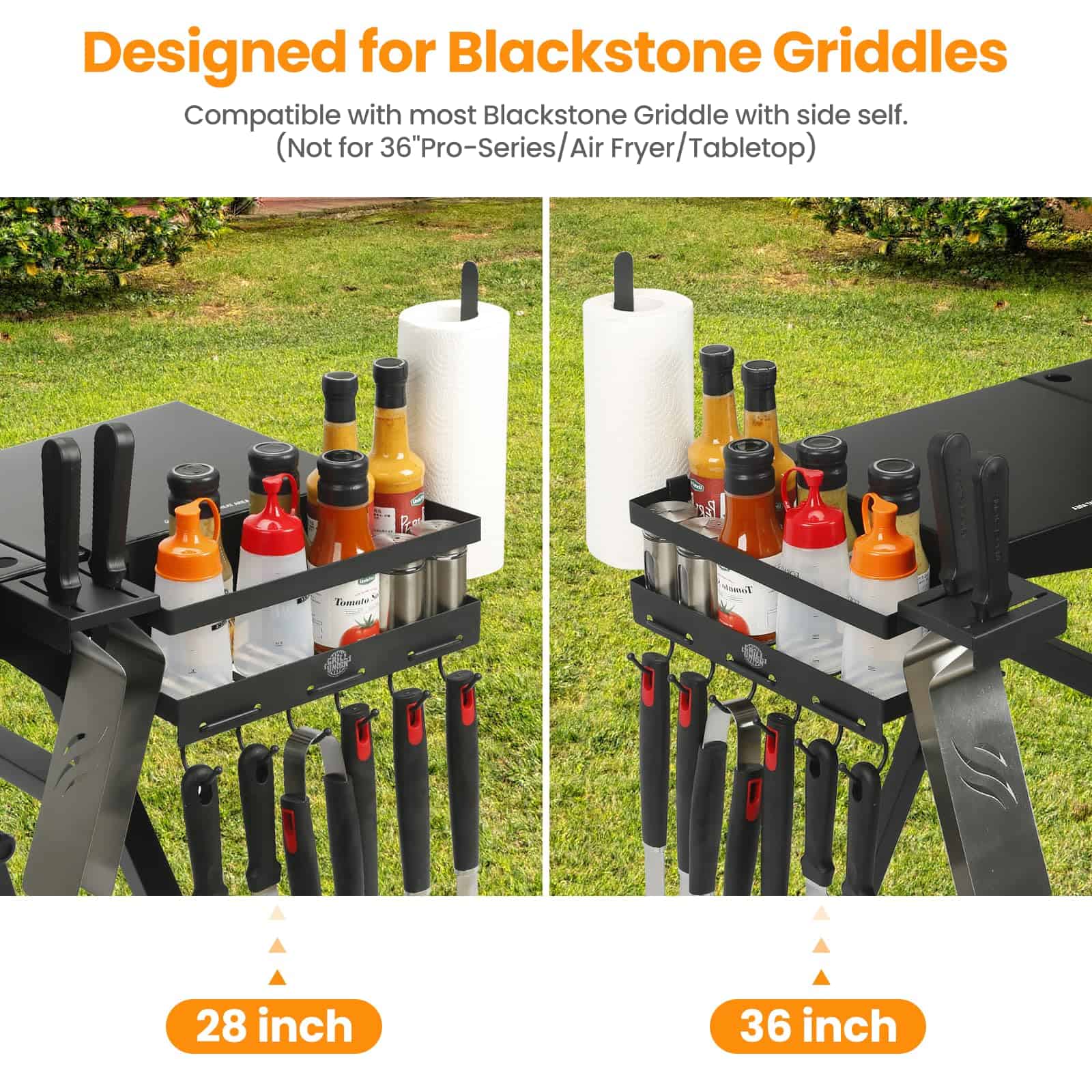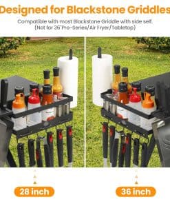 2. Compatibilidad perfecta con parrillas Blackstone: Nuestro caddy para parrilla BBQ está específicamente diseñado para adaptarse a las parrillas de parrilla Blackstone. Es compatible con parrillas de 28″ y 36″, así como con las parrillas de 17″ y 22″ con un estante lateral. Por favor ten en cuenta que los elementos de plástico no deben colocarse cerca de los quemadores de las parrillas de 17″/22″ para evitar que se derritan. (No apto para modelos Pro-Series/air fryer/tabletop de 36″).