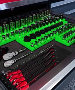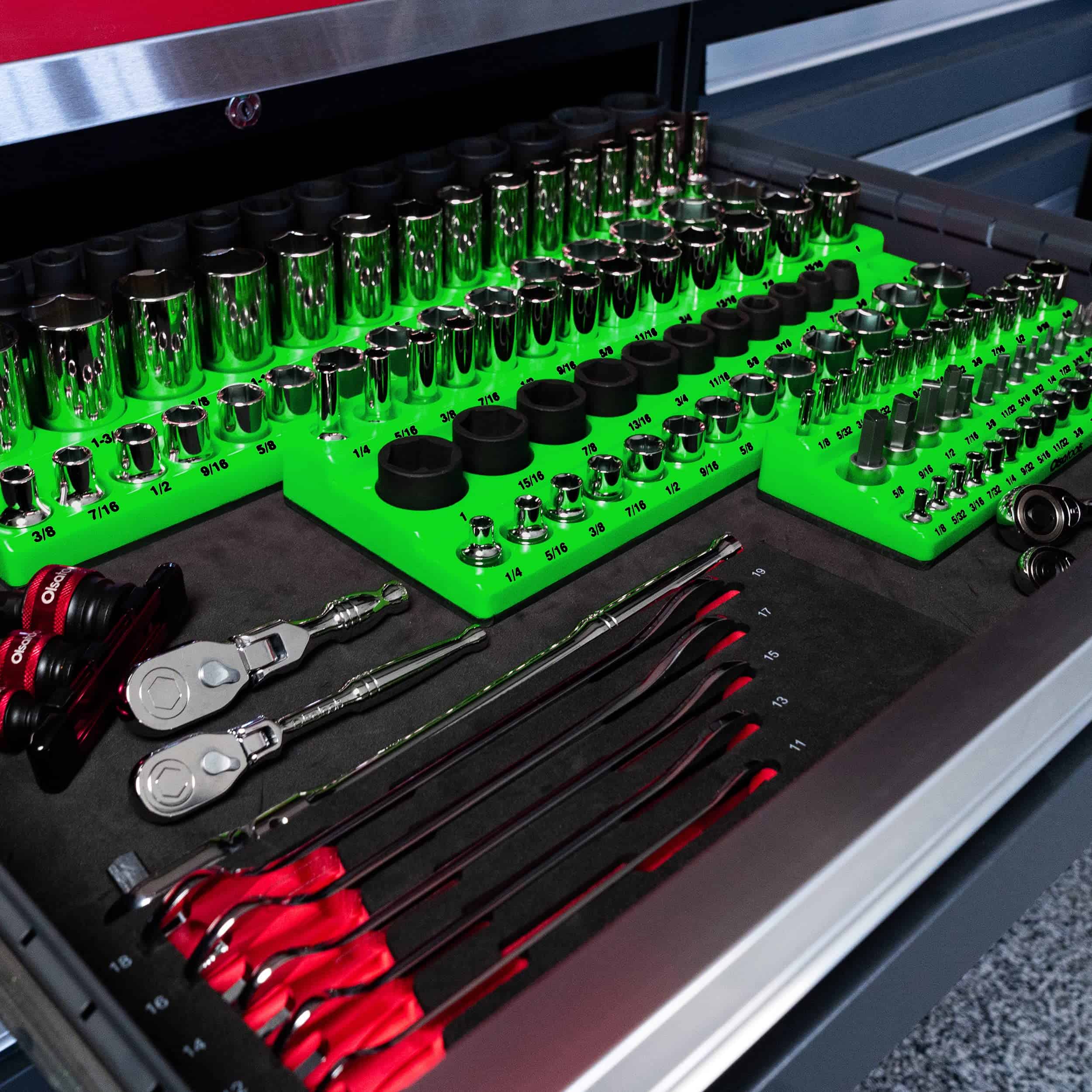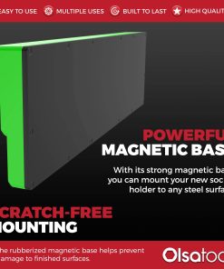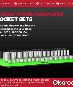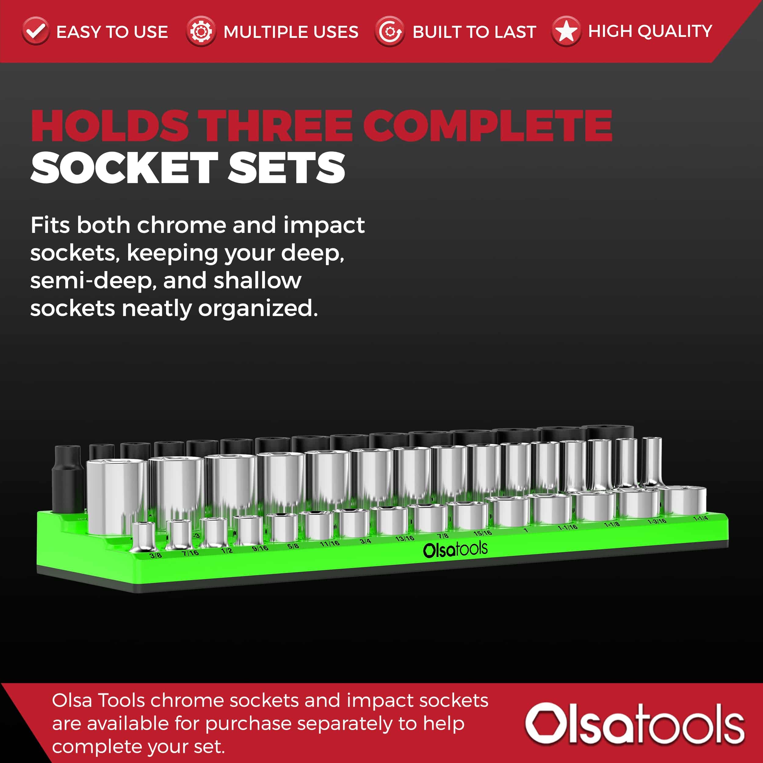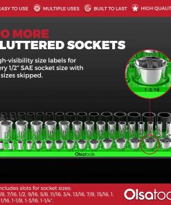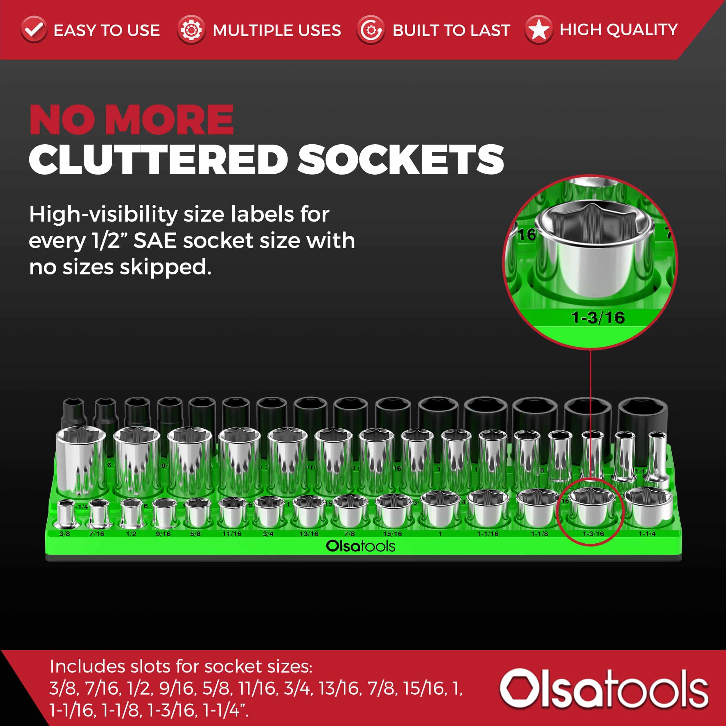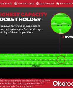 1/2 pulgada, 3 filas – Capacidad para 45 sockets. SAE Verde, Grado Profesional. Haga su trabajo menos frustrante en minutos con nuestro organizador de sockets magnéticos. Guarde sus sockets en su cajón o móntelos en el lateral de su caja de herramientas. La base magnética fuerte mantiene sus sockets en la bandeja y asegurados a cualquier superficie de acero, incluso boca abajo. Este organizador cuenta con marcas de tamaño fáciles de leer para una rápida selección de sockets. Montaje sin rayones con una base magnética de goma para proteger las superficies pintadas. Compatible con todos los sockets, incluidos los juegos de sockets de cromo o de impacto en profundidad y superficiales. Incluye el rango de tamaño más popular para sockets métricos de 1/2 pulgada de 10 mm a 27 mm sin omitir tamaños. La garantía de calidad de Olsa Tools respalda todos los organizadores de sockets. La patente de este organizador magnético de 3 filas está en proceso y se espera su aprobación. Agradecemos su apoyo.
