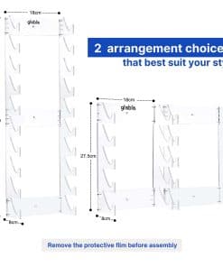 Tu soporte ajustable se puede montar de 2 formas diferentes. El primer estilo es solo 1 pieza vertical alta que sostiene hasta 10 pares de baquetas. El segundo estilo es separar las 2 piezas principales para que cada una de las bases sostenga 5 pares de baquetas cada una. Este soporte está diseñado para colocarse en una mesa o estante para exhibición o colgarlo en la pared.