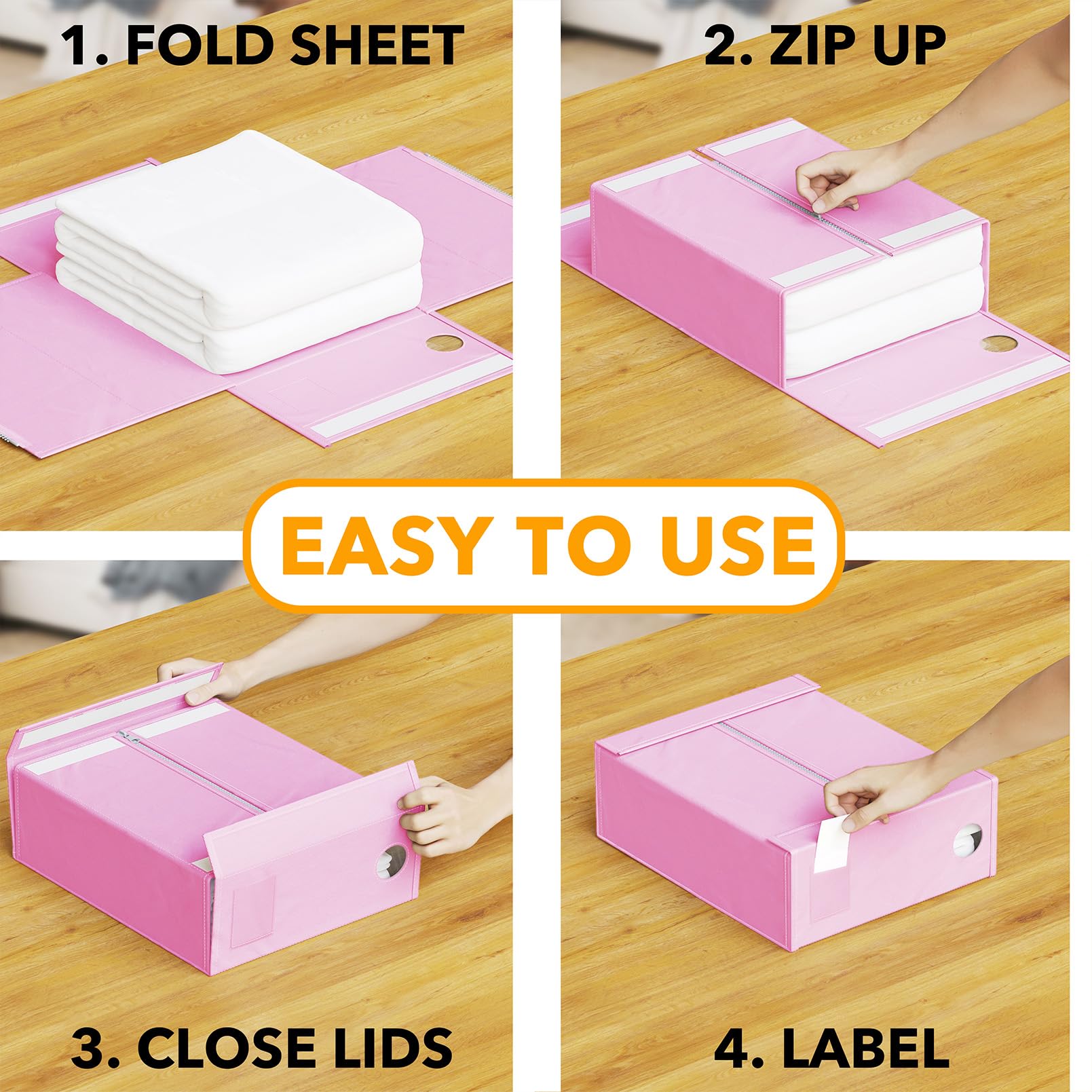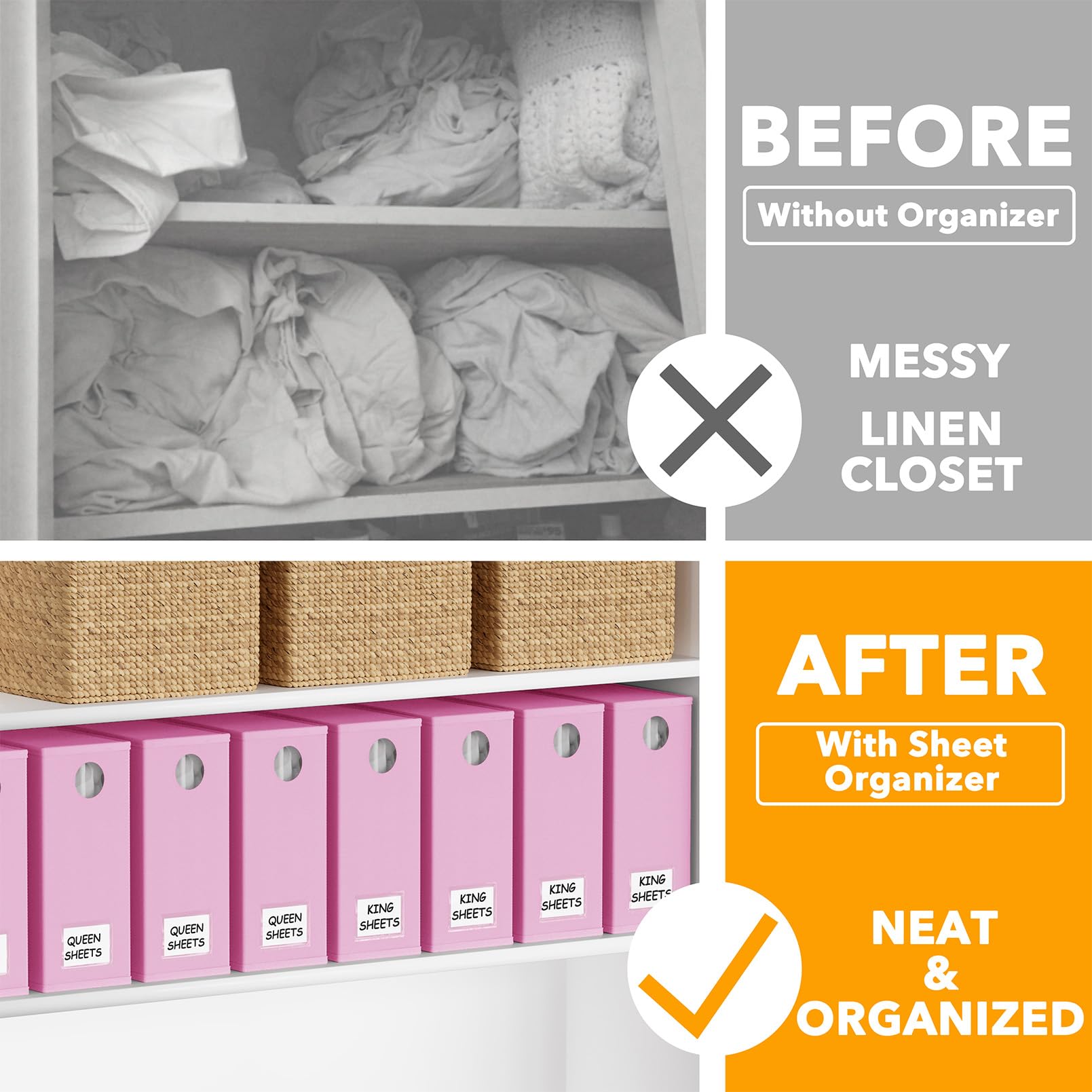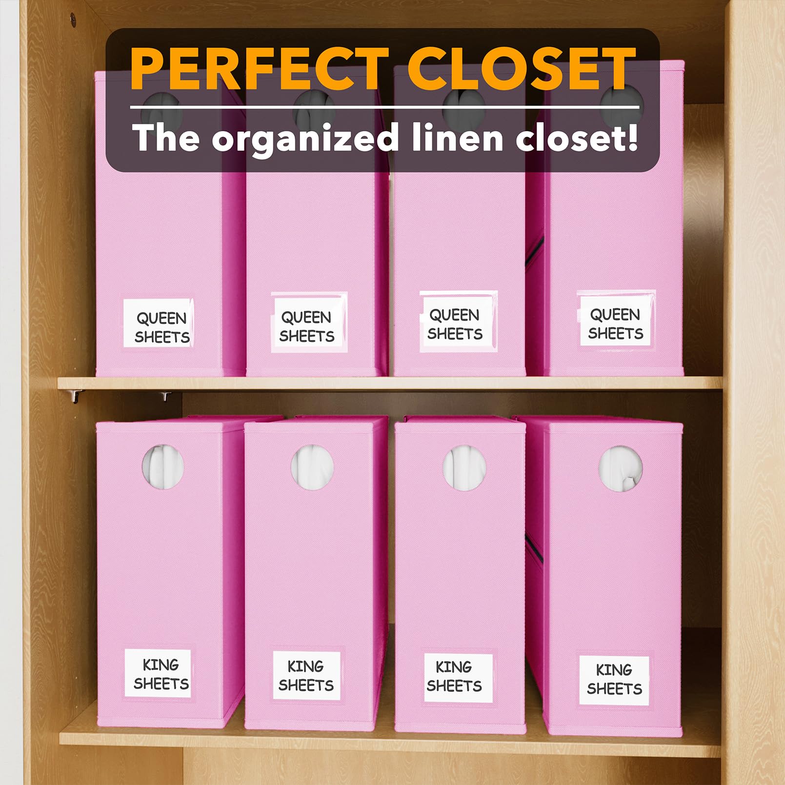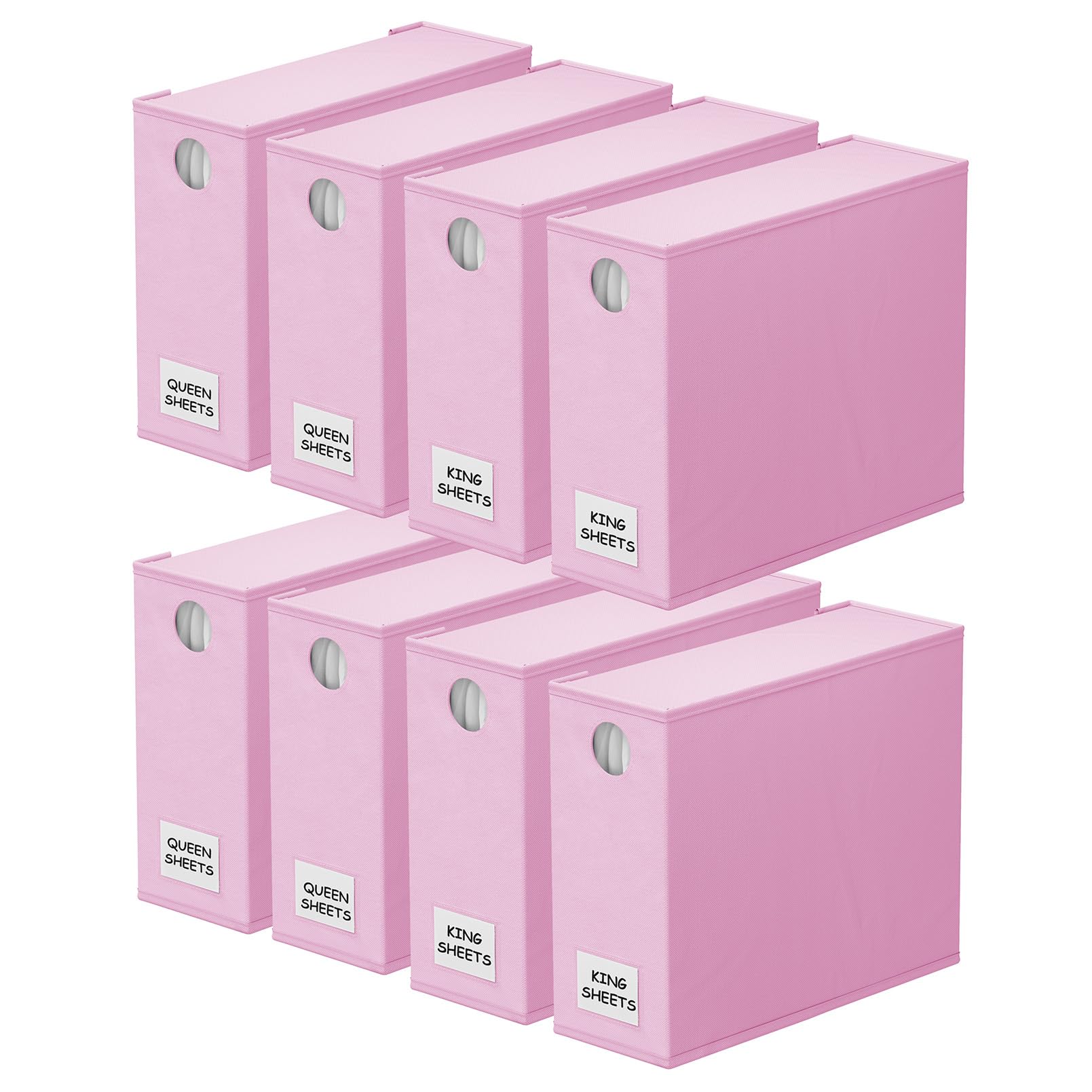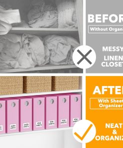 Organizadores y Almacenamiento para Sábanas SpaceAid 8 Pack, Organizador Plegable para Armario de Ropa de Cama, Carpeta de Juego de Sábanas con Ventana XL (Queen & King Size) Contenedor de Ropa de Cama en Rosa. Este conjunto de 8 Organizadores de Sábanas te ayudará a mantener tu armario de ropa de cama organizado y hermoso. Cada organizador de almacenamiento tiene un tamaño de 5″ de ancho, 15″ de profundidad y 12.8″ de alto, lo que los hace perfectos para sábanas Queen y King. El diseño de ventana circular frontal te permite ver claramente el color de la ropa de cama dentro de cada organizador sin tener que abrirlo. Además, las tarjetas de etiqueta incluidas te permiten identificar fácilmente el contenido de cada organizador, ahorrándote tiempo en la búsqueda de las sábanas que necesitas. La construcción robusta de cada cubo organizador garantiza que sea duradero y lo suficientemente resistente para contener un juego completo de sábanas Queen o King, una funda nórdica y dos fundas de almohada. Estos organizadores de sábanas son fáciles de doblar y usar, lo que los hace ideales para mantener tu armario de ropa de cama perfectamente ordenado y organizado.