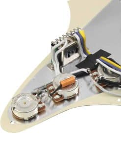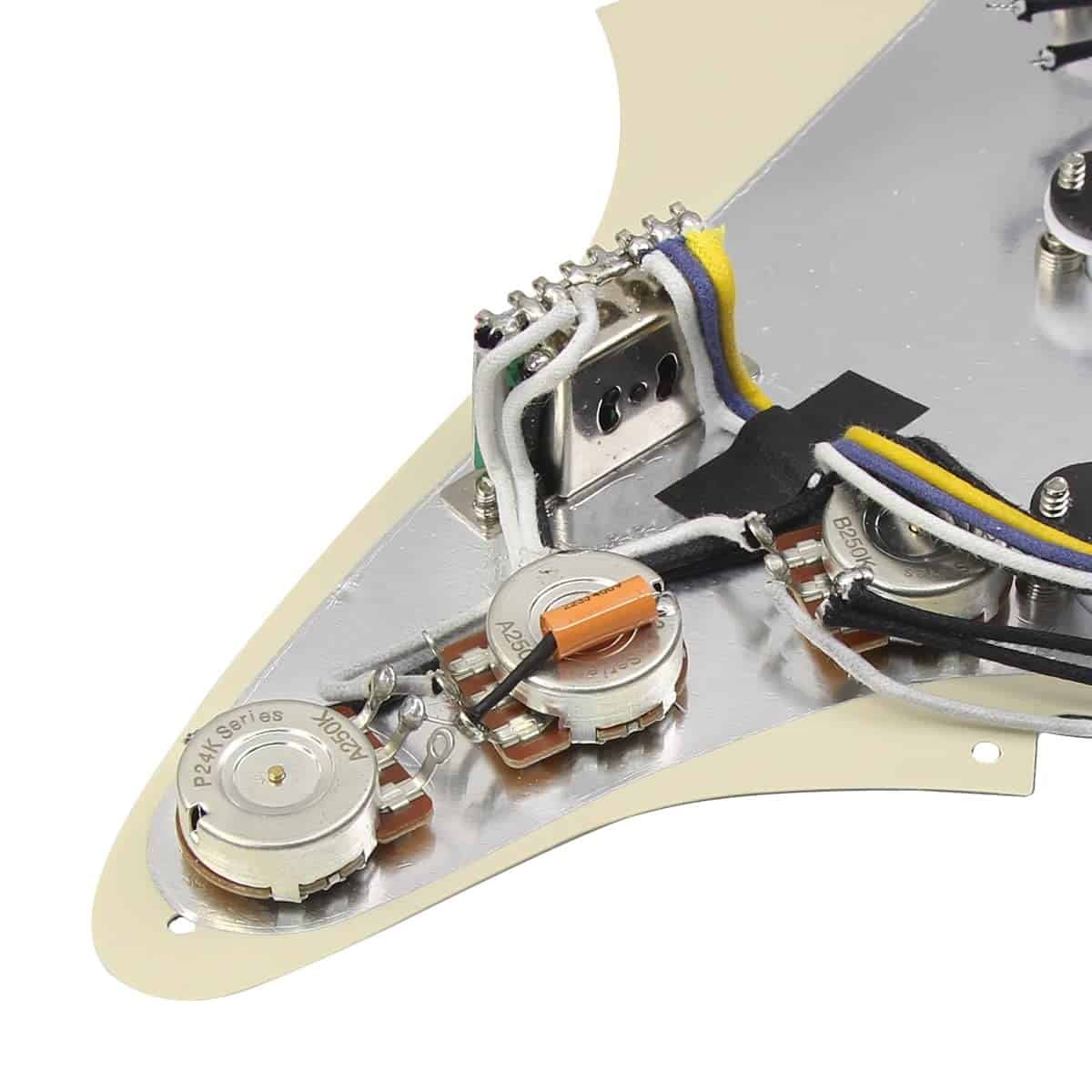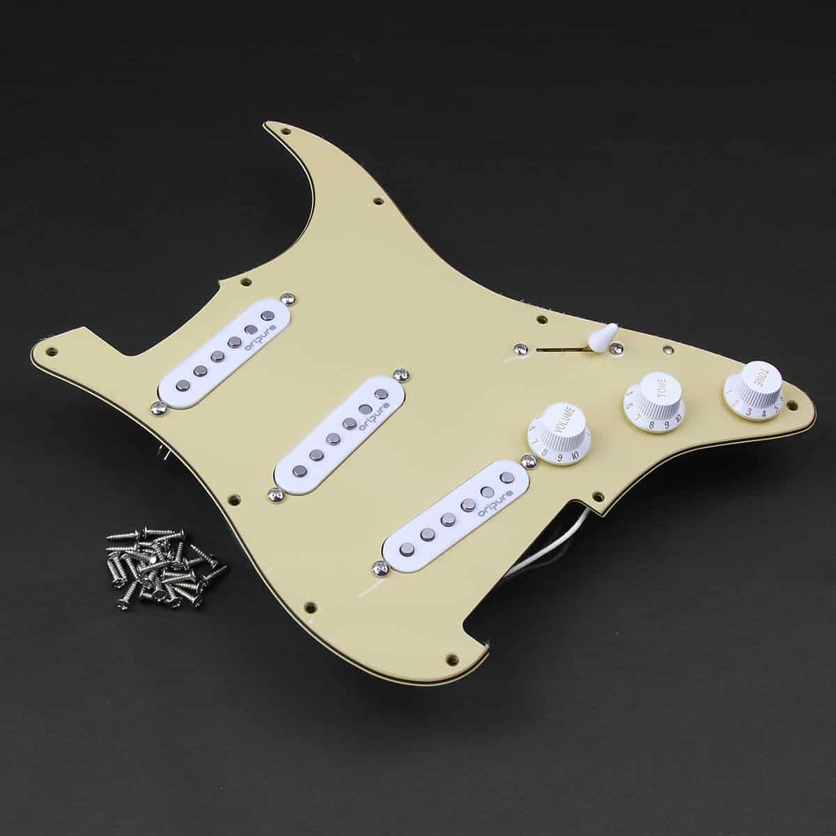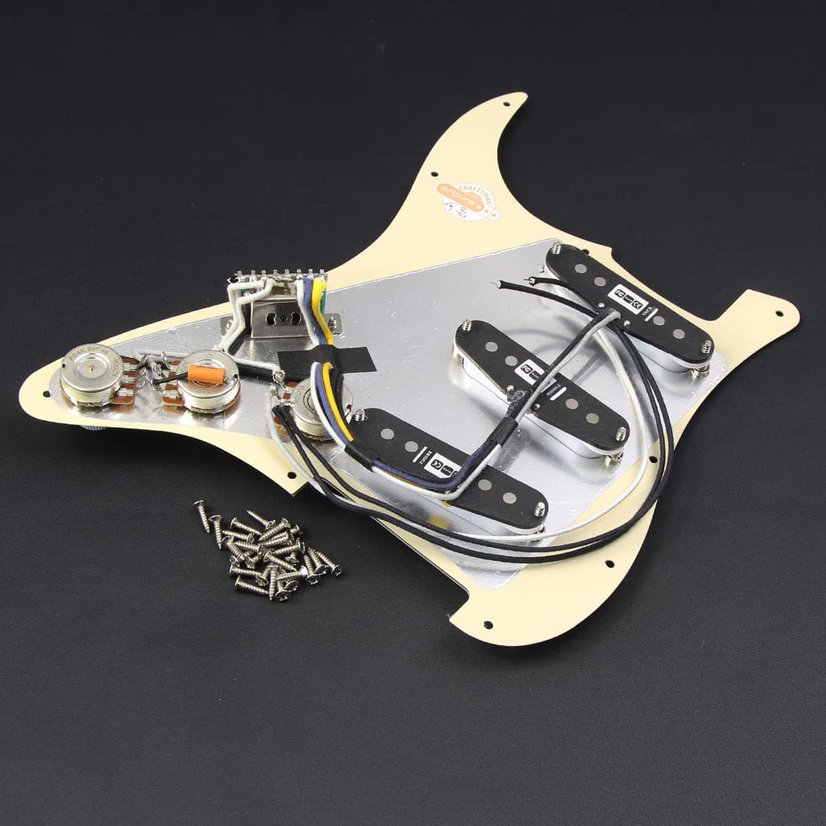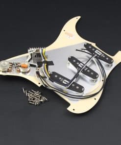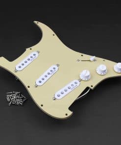 Set de pickguard preconectado para guitarra eléctrica estilo Fender Stratocaster estándar. El pickguard está hecho de material de PVC de 3 capas en colores crema/negro/crema, con 11 agujeros para tornillos en el lado y 3 agujeros para pastillas single coil. Las pastillas son de tipo Alnico 5 con bobina de fibra vulcanizada; espaciado de polos: 50/50/52mm (N/M/B); Resistencia: N-5.8K, M-5.9K, B-6.9K. Viene con cables de tela trenzada de 44 AWG, perillas de control 2T1V, 2 potenciómetros de tono A250k y 1 potenciómetro de volumen B250k. Conmutador de 5 vías y condensador MKP 223J 400V. Incluye set completo de pastillas, switch, perillas y circuito preconectado, solo tienes que soldar el jack de entrada y ¡listo para tocar!