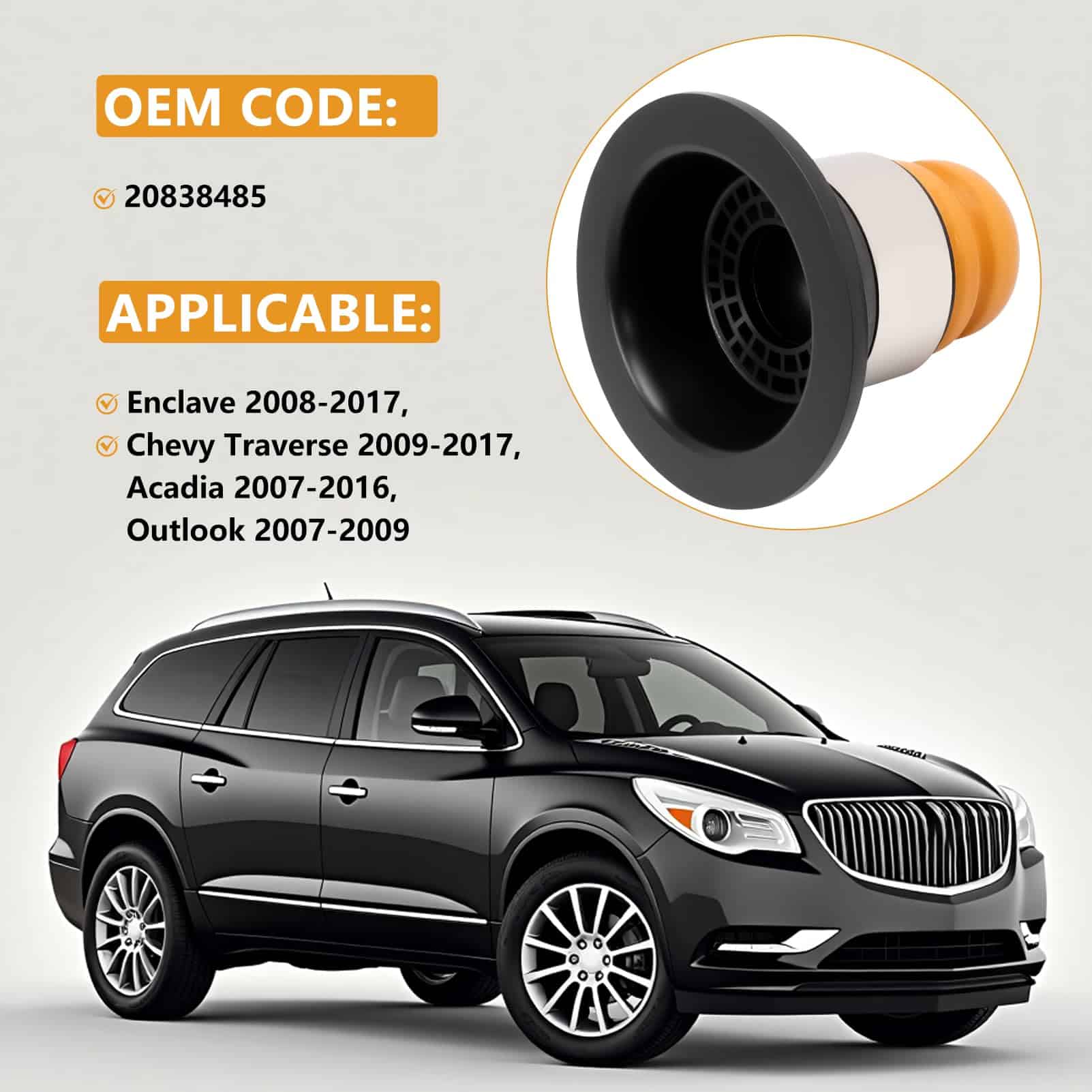 1. PRECISO AJUSTE Compatible con Enclave 2008-2017, Traverse 2009-2017, Acadia 2007-2016, Outlook 2007-2009. OE: 20838485. 2. ABSORCIÓN PROGRESIVA DE CHOQUES A diferencia de los parachoques OEM frágiles que se agrietan con el tiempo, nuestra uretano microcelular proporciona un control de compresión de 3 etapas: Absorción suave del impacto inicial evita la vibración de la cabina + Cojín de densidad media mantiene el contacto de la llanta + Protección firme contra el impacto inferior protege los amortiguadores de daños. 3. GUARDIÁN ANTI-FUGAS Soporta ciclos de compresión durante la operación del automóvil. Reduce las cargas de impacto en los amortiguadores a través de un sistema de amortiguación dual (parachoques + aro de acero) para evitar tocar fondo y provocar fugas de aceite. 4. ENCHUFAR Y LISTO Cuenta con diseño OEM encastrado. Fácil de instalar: simplemente comprimir el resorte > quitar el parachoques roto > insertar el nuevo kit en la ubicación original. 5. PROTECCIÓN COMPLETA 2X Cada kit contiene 2 parachoques + 2 anillos. El núcleo de nailon evita la deformación del anillo.