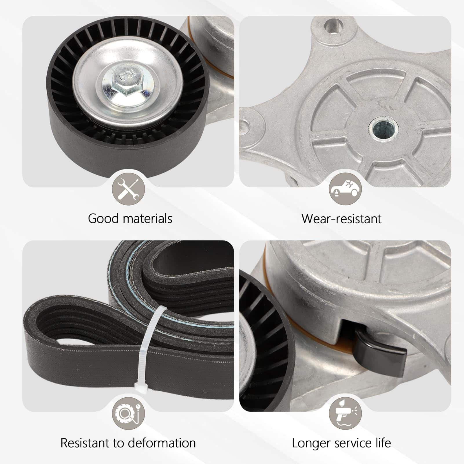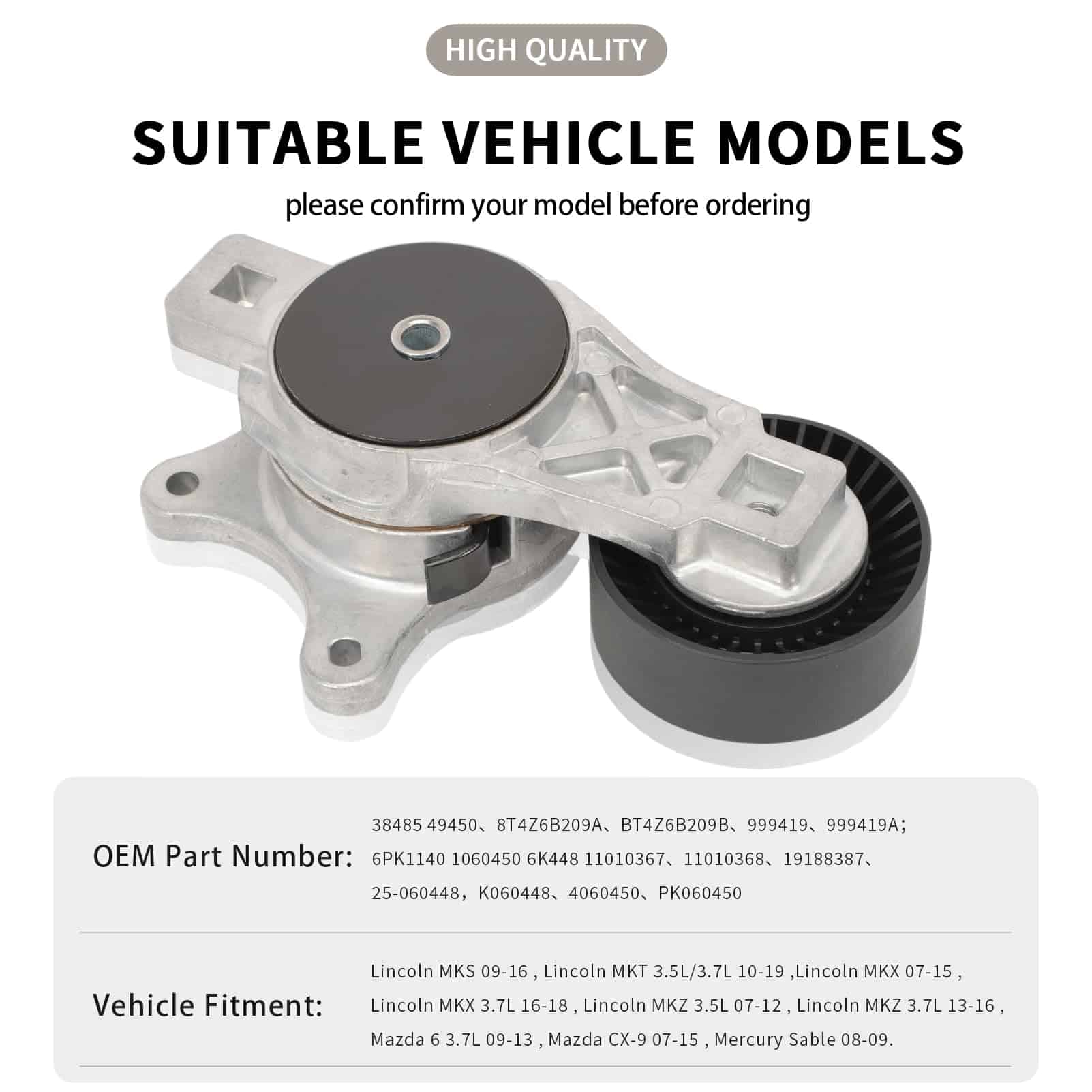 1. Número de OE: Tensor de correa de transmisión: 38485, 49450, 8T4Z6B209A, BT4Z6B209B, 999419, 999419A, Correa: 6PK1140, 1060450, 6K448, 11010367, 11010368, 19188387, 25-060448, K060448, 4060450, PK060450.