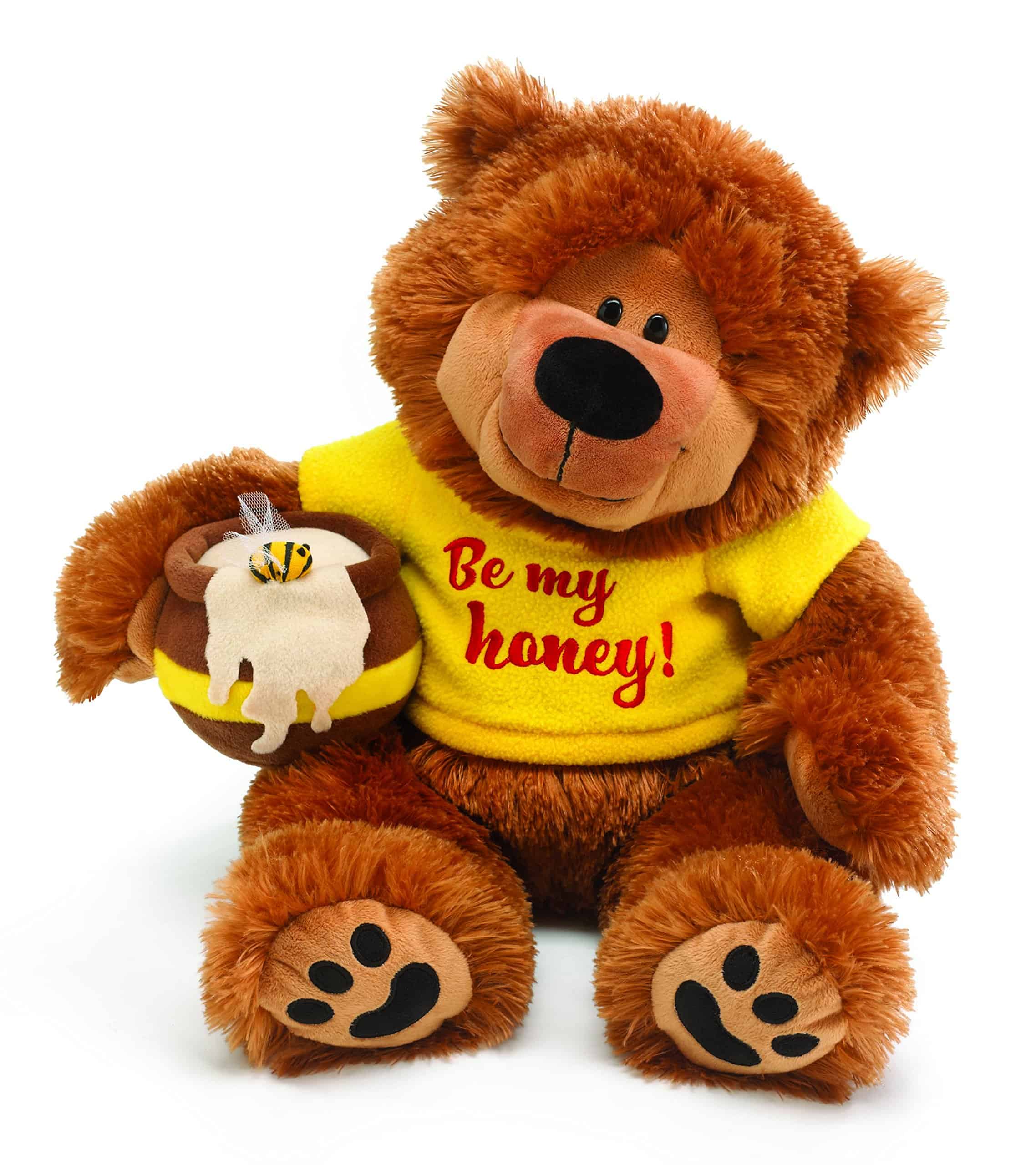 Oso de peluche marrón con camiseta amarilla. Mensaje «Be My Honey» en la camiseta en color rojo y sosteniendo un tarro de miel con una abeja amarilla. Lazo de cinta fácil de atar.