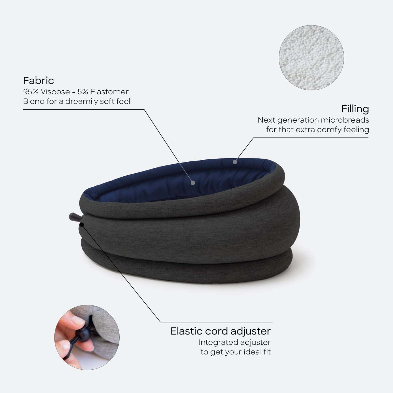 2. AJUSTE BLOQUEADOR DE LUZ Diseñado para ajustarse cómodamente alrededor de tu cabeza, bloquea eficazmente la luz, proporcionando un apoyo cómodo en cualquier superficie. Ideal para dormir sin interrupciones durante los viajes o siestas rápidas mientras viajas.