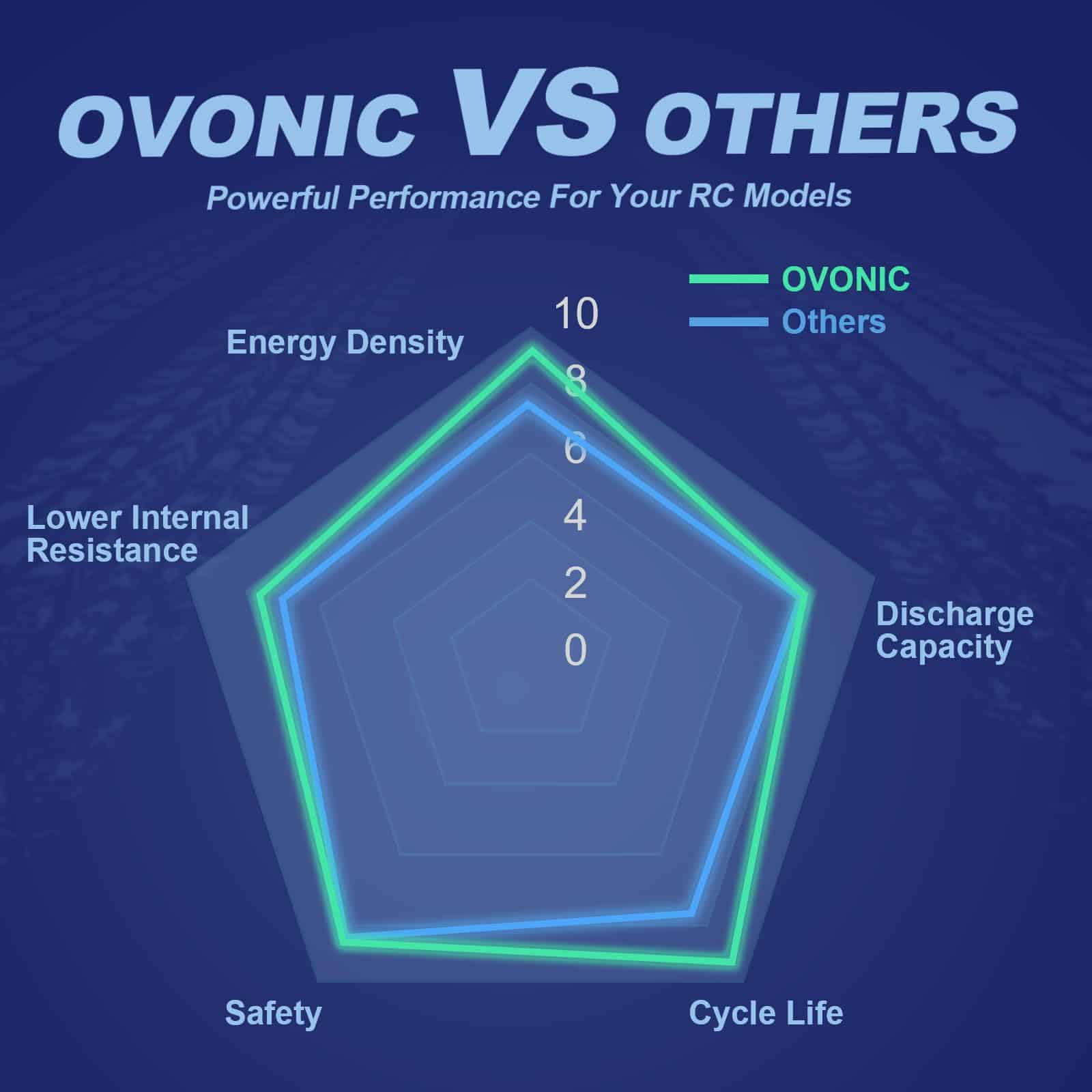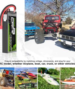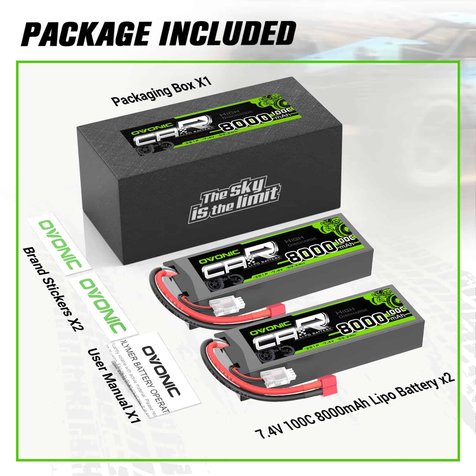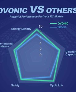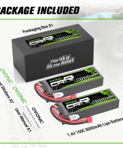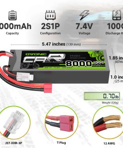 1. Parámetro – Material: polímero de litio, Voltaje: 7.4V, Celda: 2S, Capacidad: 8000mAh, Descarga: 100C, Conector de carga: JST-XHR-3P, Conector de descarga: Conector Deans, Carcasa: dura. 2. Especificación – Batería Lipo OVONIC 8000mAh 7.4V Dimensiones (3mm): 138.87 47.13 25.38 mm / 5.47 1.86 0.99 pulgadas (L A H), Peso aproximado (5g): 320 g / 0.7 lb. 3. Múltiples Ventajas – Certificación de calidad internacional ISO (más segura), materiales premium (LiCoO2), vida útil del ciclo más larga (350+ veces), tiempo de funcionamiento más largo (+12%), tiempo de carga más rápido (-6%), peso más ligero (-5%), resistencia más baja (-4%). 4. Fuerte Compatibilidad – Adecuada para varios vehículos RC, incluyendo autos, camiones, aviones, barcos y drones. Por seguridad, por favor use el cargador exclusivo de OVONIC para cargar su batería. Para más información, por favor busque «OVONIC Mate 1» y «OVONIC X1» en nuestra tienda. 5. Paquete – 2 x Batería Lipo de 2S OVONIC, 2 x Pegatinas de marca, Manual de usuario. Por favor lea el manual del usuario cuidadosamente antes de usarlo, si tiene algún problema, contáctenos directamente y le responderemos en un plazo de 24 horas.