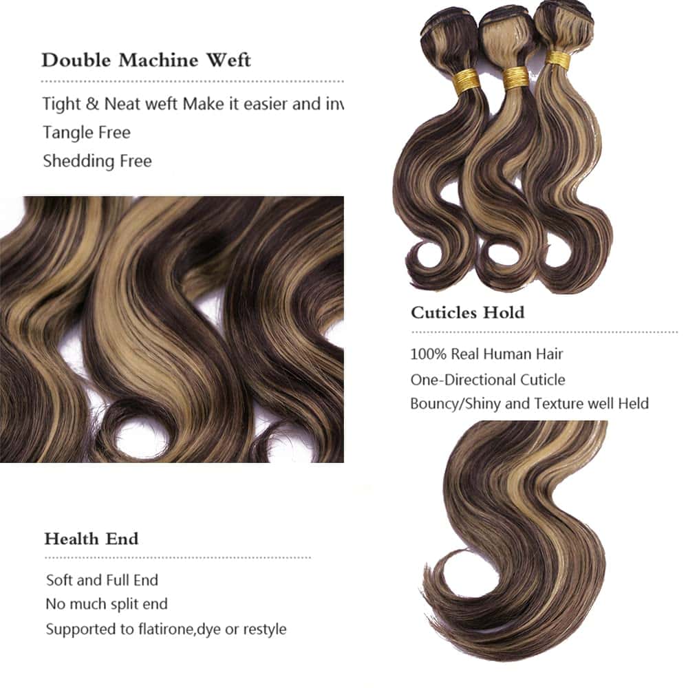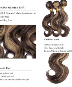 Textura del Cabello: Onda del Cuerpo – Extensiones de Cabello Humano.Material: Extensiones de Cabello Humano Brasileño Sin Procesar.Tipo de Cabello Humano: Tejido de Cabello Humano Remy Brasileño.Color: Color Ombre en Dos Tonos Marrón y Rubio.Peso Unitario: 3 Mechones de 95-100 gramos por pieza.Trama del Cabello: Doble Trama a Máquina.No se Puede Permanente: ¡No, por favor ten cuidado de no exceder los 125F! ¡De lo contrario dañará el cabello!Olor del Cabello: Puede tener un aroma a champú local, pero desaparecerá después de lavarlo con agua, no te preocupes.¿Cómo Cuidar el Cabello?1. Lava el cabello regularmente.2. Desenreda suavemente el cabello antes de lavarlo. No lo frotes ni lo retuerzas.3. Agrega champú suave al agua fría y agita el cabello hasta que esté limpio. Enjuaga bien.4. Absorbe el exceso de agua con una toalla y deja que el cabello se seque de forma natural. No lo expongas al sol.5. Peina el cabello suavemente con un peine de dientes anchos o con tus dedos.6. Cepilla el cabello más recto en un movimiento hacia abajo con las puntas. Preguntas Frecuentes:Q1: ¿Se Caerá el Cabello?A1: Para el cabello nuevo, es normal que algunas hebras se caigan al principio, al igual que nuestro propio cabello. El cabello tiene doble trama de máquina para evitar la caída. La caída del cabello puede ser causada por muchas cosas. El daño por calor de los secadores, rizadores y alisadores, así como la coloración, resultará en rotura.Q2: Política de Devolución/ReembolsoA2: Puedes devolverlo si a ti o a tu familia no les gusta nuestro cabello. Pero no rompas el paquete.