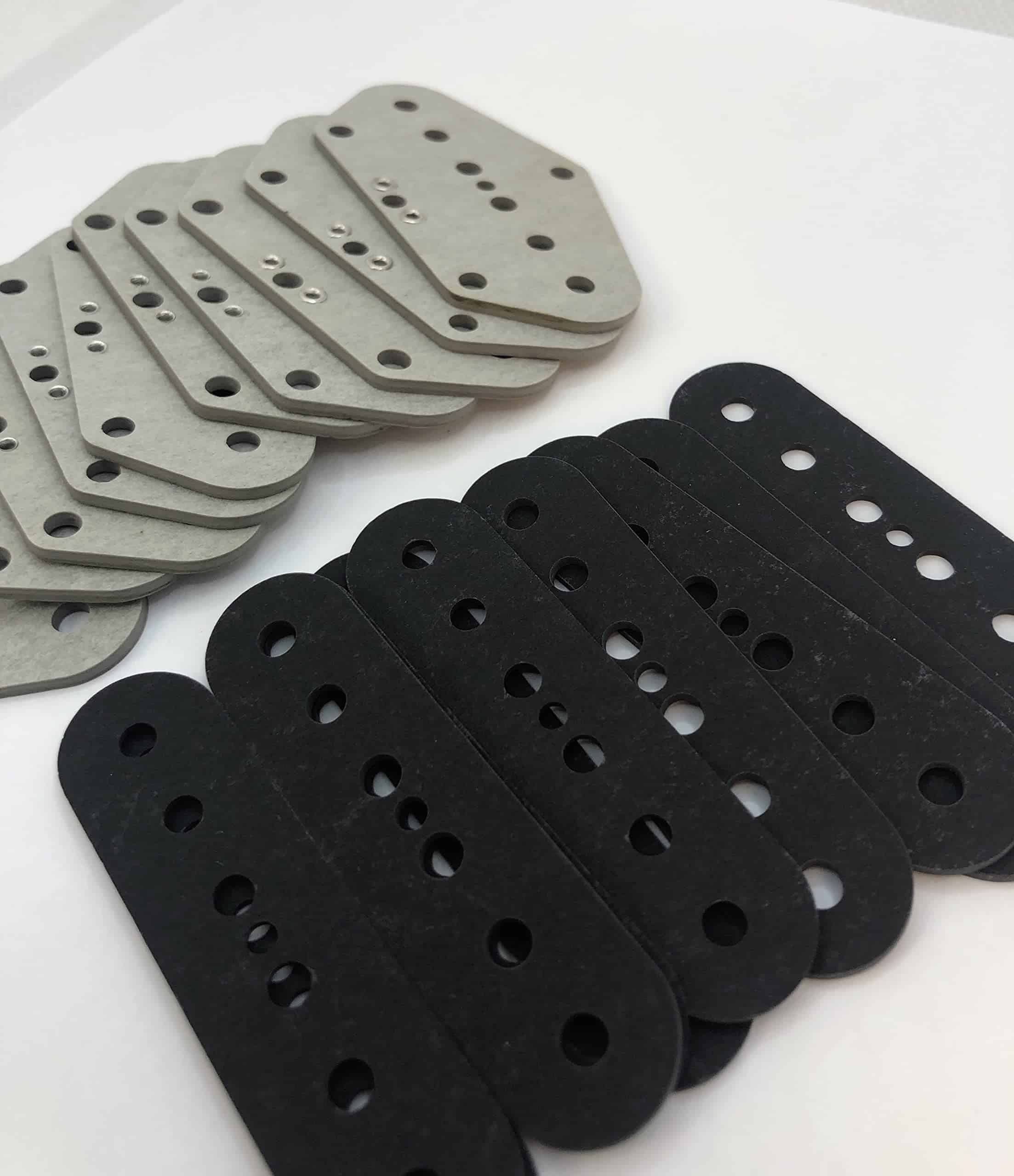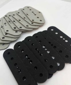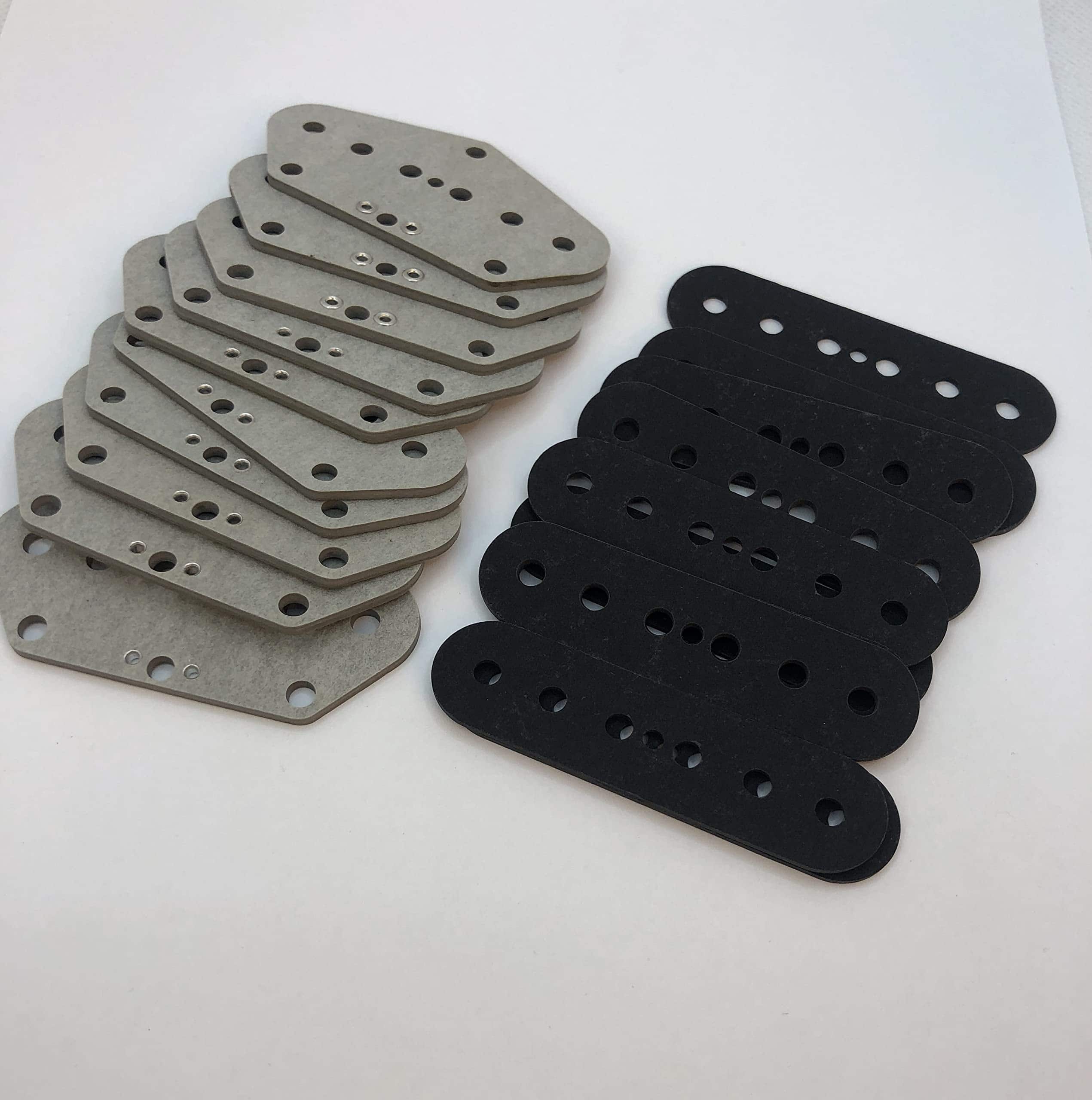Pack de 10 para construir 10 pastillas de puente Telecaster. Parte inferior gris, parte superior negra. Ojales instalados y cortados con láser en EE. UU. para imanes de diámetro .187″.