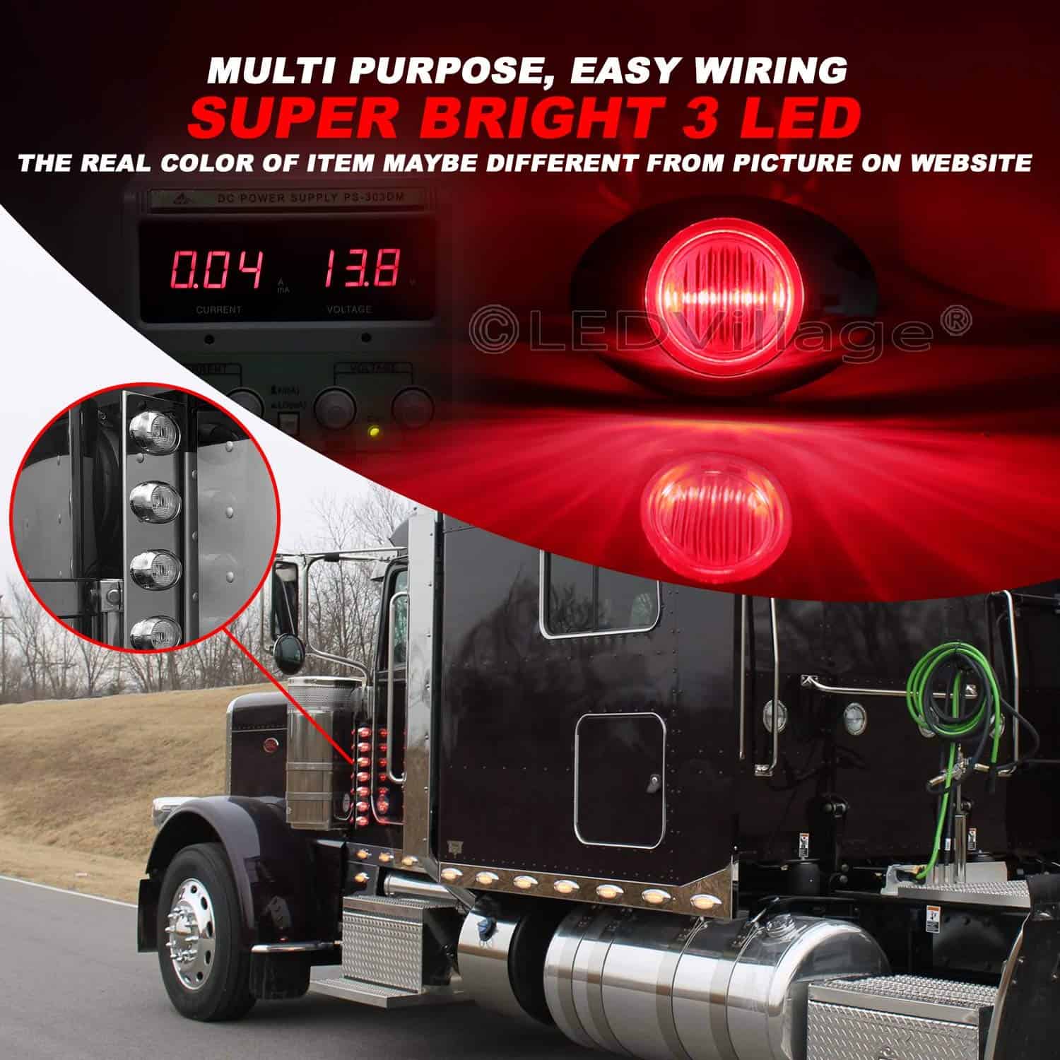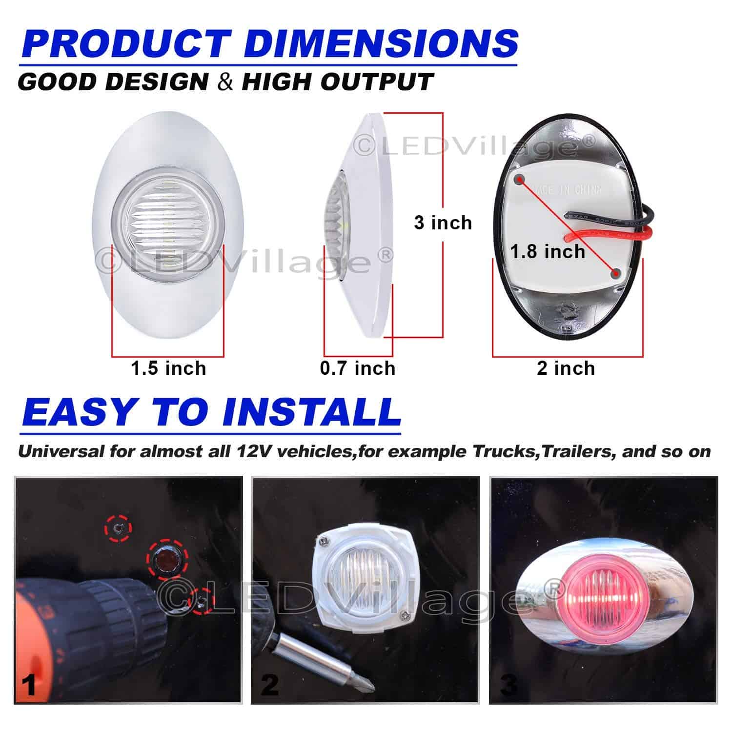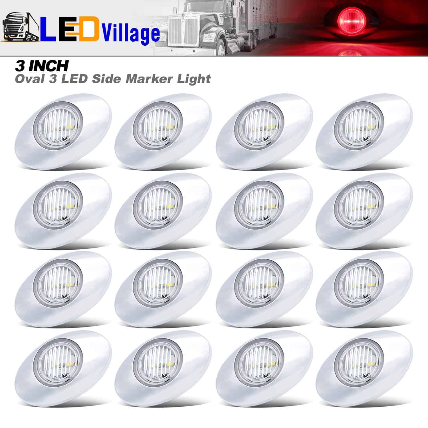 (Pack de 16) 3 Luces de Marcador Lateral LED Rojo Ovaladas Ledvillage 3 LED 12V DC Características: 100% Nuevo Responde más rápido que la luz tradicional Mejora impermeable, a prueba de golpes y vibraciones Proporciona garantía de 1 año Larga vida útil de 50,000 horas Especificaciones: Marca: Ledvillage Número de LED: 3 LED Color de la luz: Rojo Color de la lente: Transparente Voltaje de funcionamiento: 12V DC Distancia entre agujeros: 1.2 pulgadas Material de la lente: PC Material de la carcasa: Bisel cromado Dimensiones sin cromo: 1.7 x 1.7 x 0.7 (L x A x H) Dimensiones con cromo: 3 x 2 x 0.7 (L x A x H) Aplicaciones: Luz de freno, Luz de marcador lateral, Luz de remolque, Luz de RV, Luz exterior, Luz de marcha, Luz de techo/cabina/panel, Etc. Paquete incluye: 16 x Luz de Marcador Lateral Roja Ovalada de 3 Pulgadas 3 LED 16 x Bisel cromado 32 x Tornillos