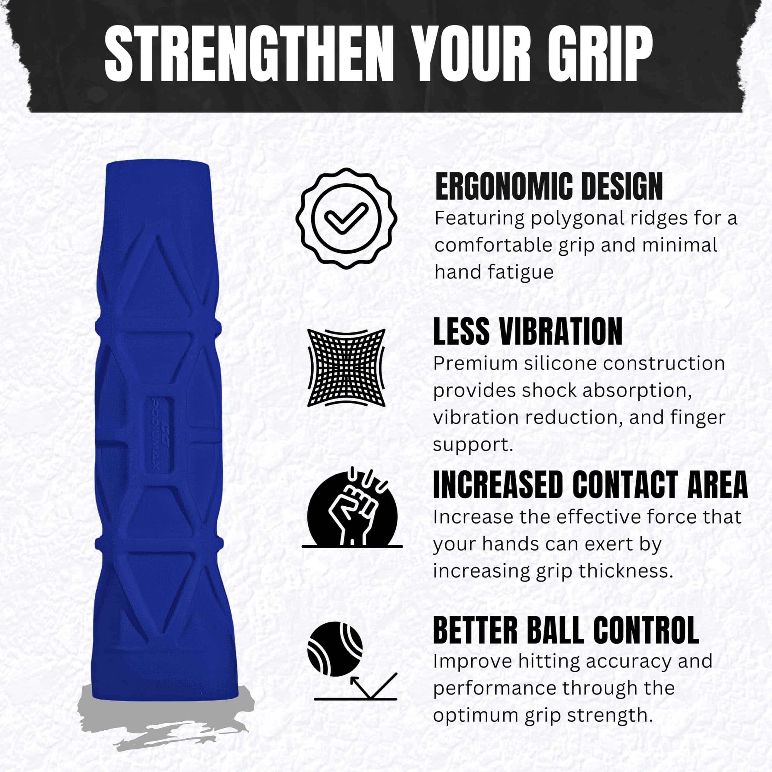 1. Diseño Ergonómico-Los agarres para palas de pickleball PodiuMax están diseñados ergonómicamente con crestas poligonales y grosor moderado, ofreciendo una sensación cómoda con una fatiga mínima en las manos, permitiéndote jugar durante períodos más largos sin molestias.