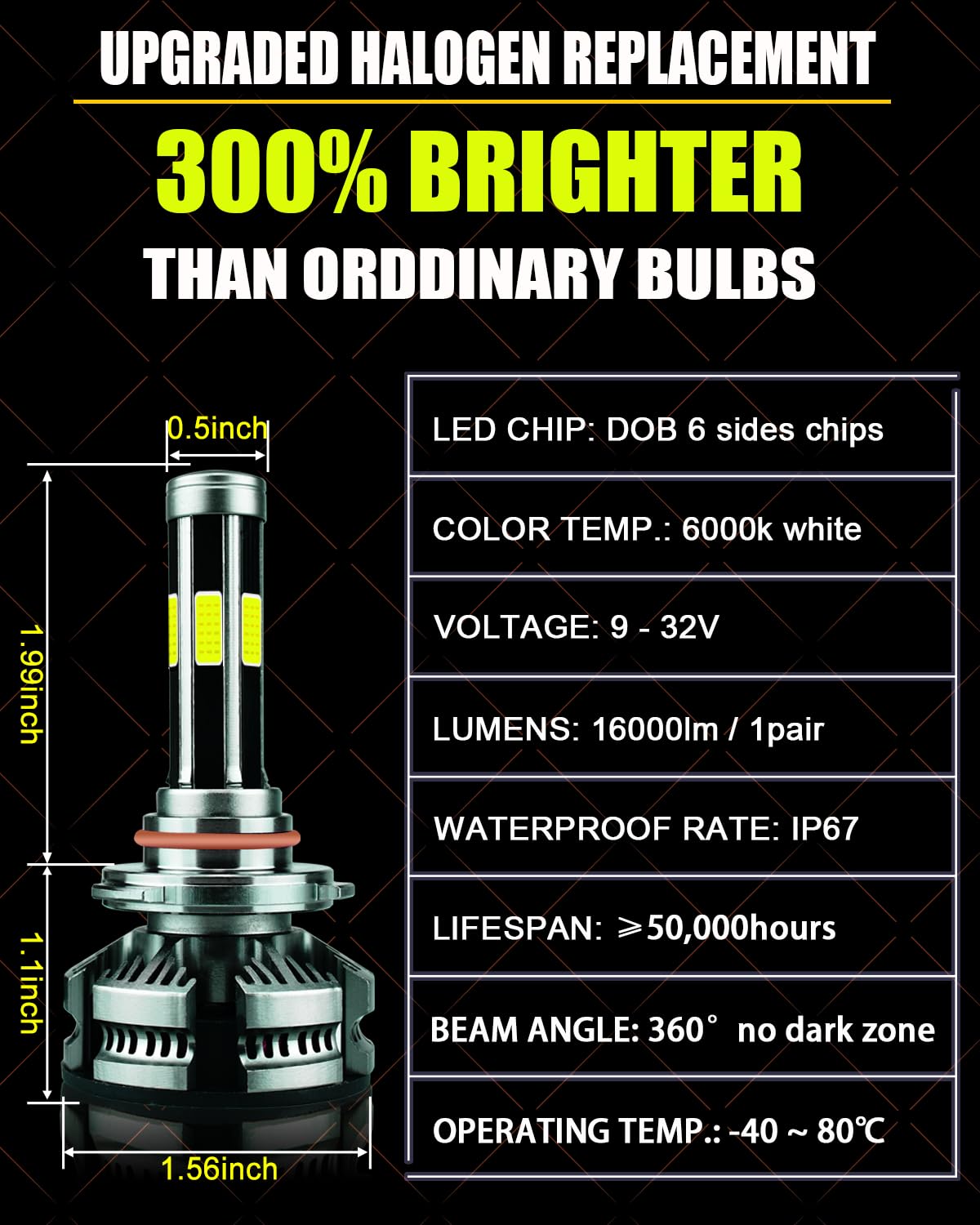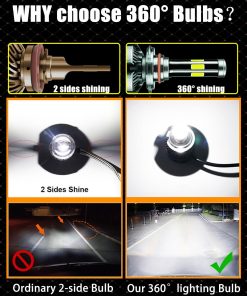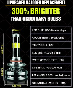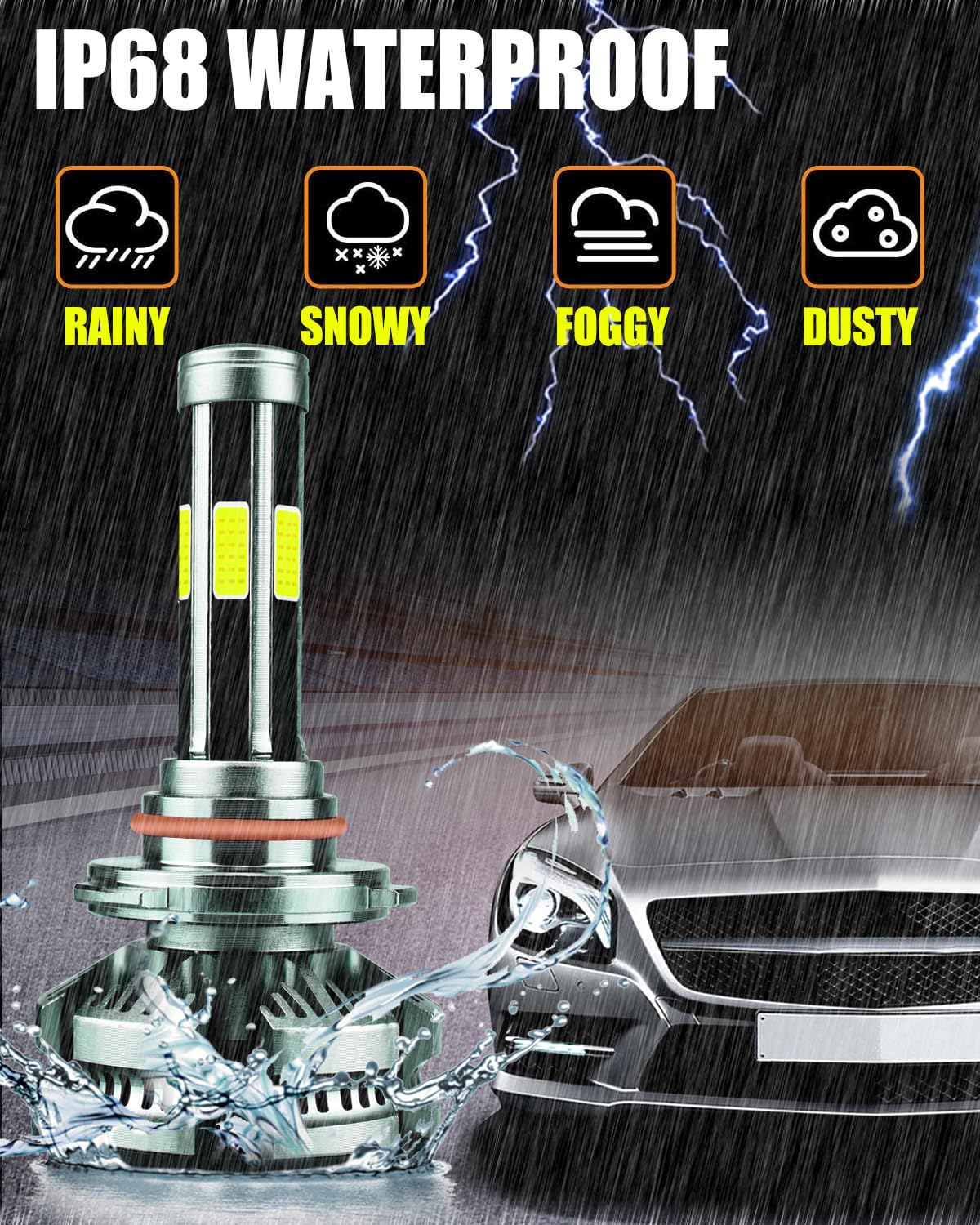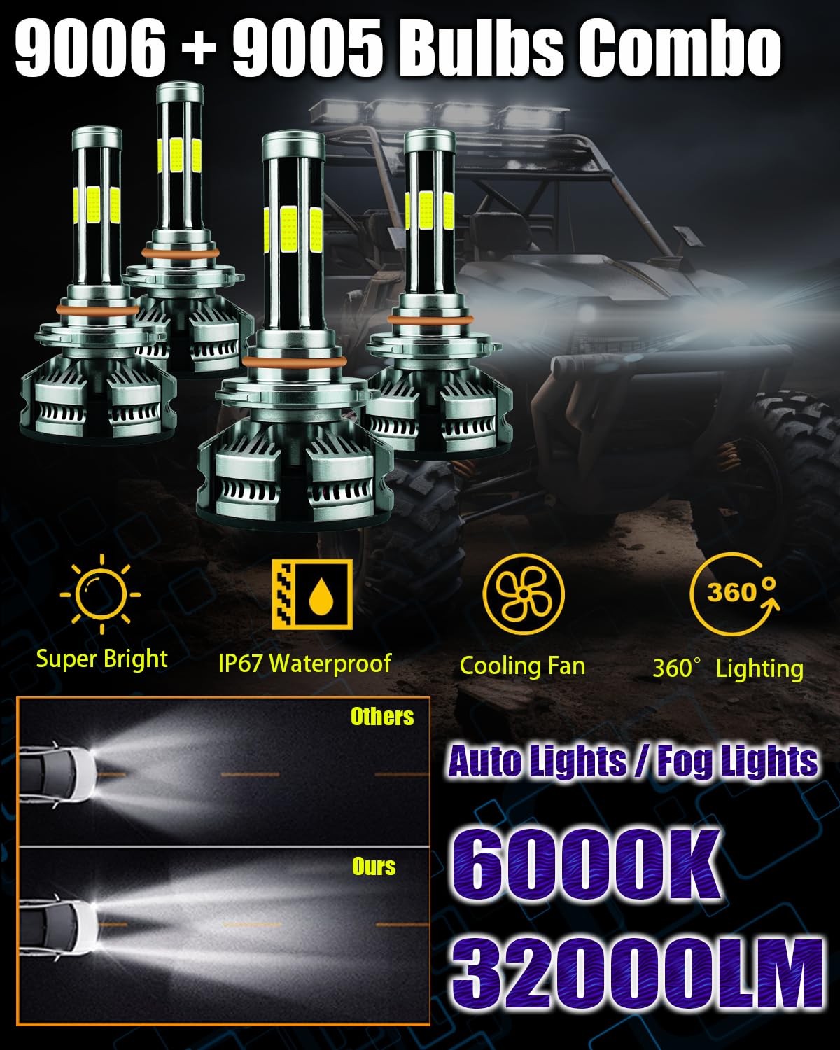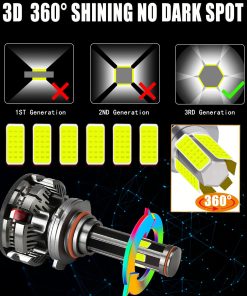 Este kit combo de bombillas 9005+9006 con chips DOB de 6 lados, iluminación de 360 grados sin ninguna zona oscura, no necesita ajustar el ángulo de iluminación. Adopta una clasificación IP68 a prueba de agua, incluso puede funcionar normalmente bajo condiciones adversas, como días lluviosos y con niebla.