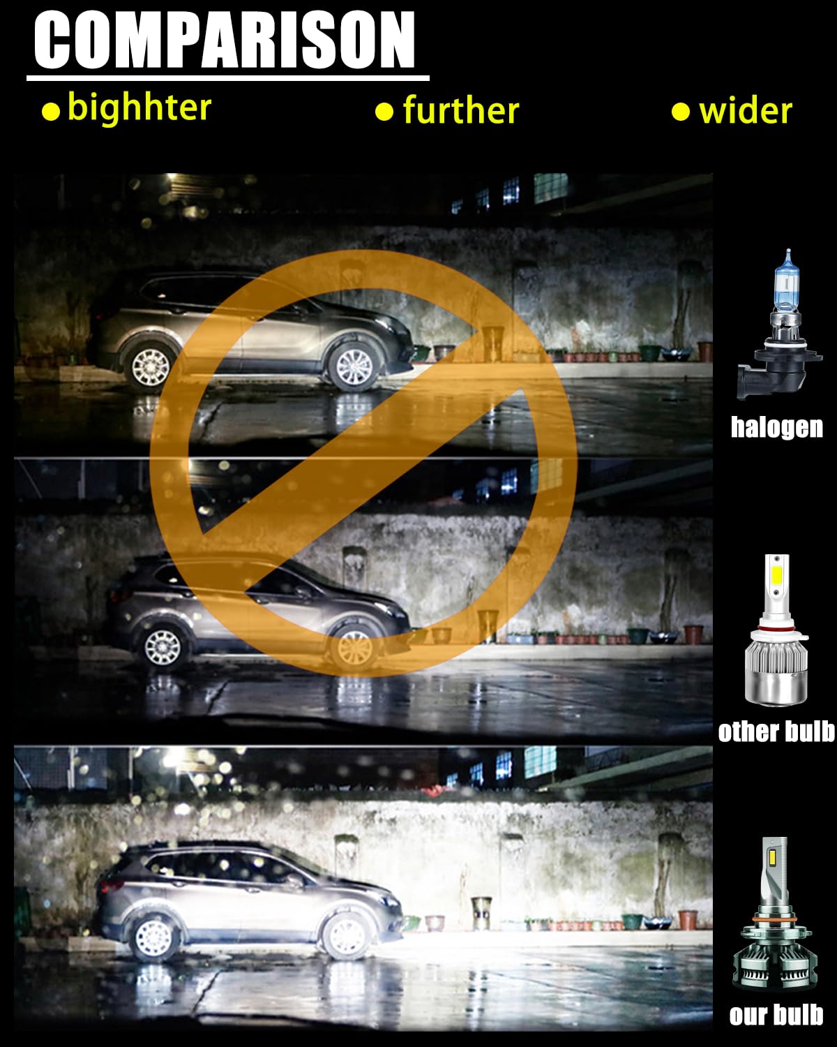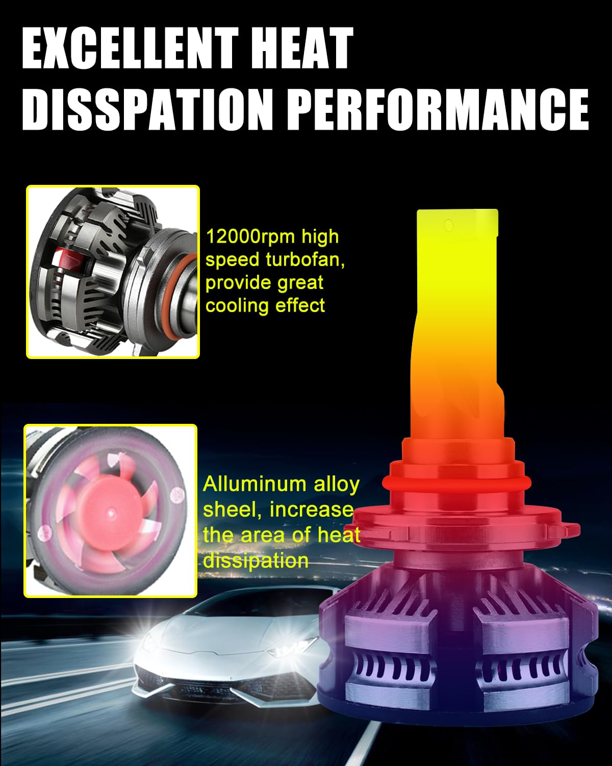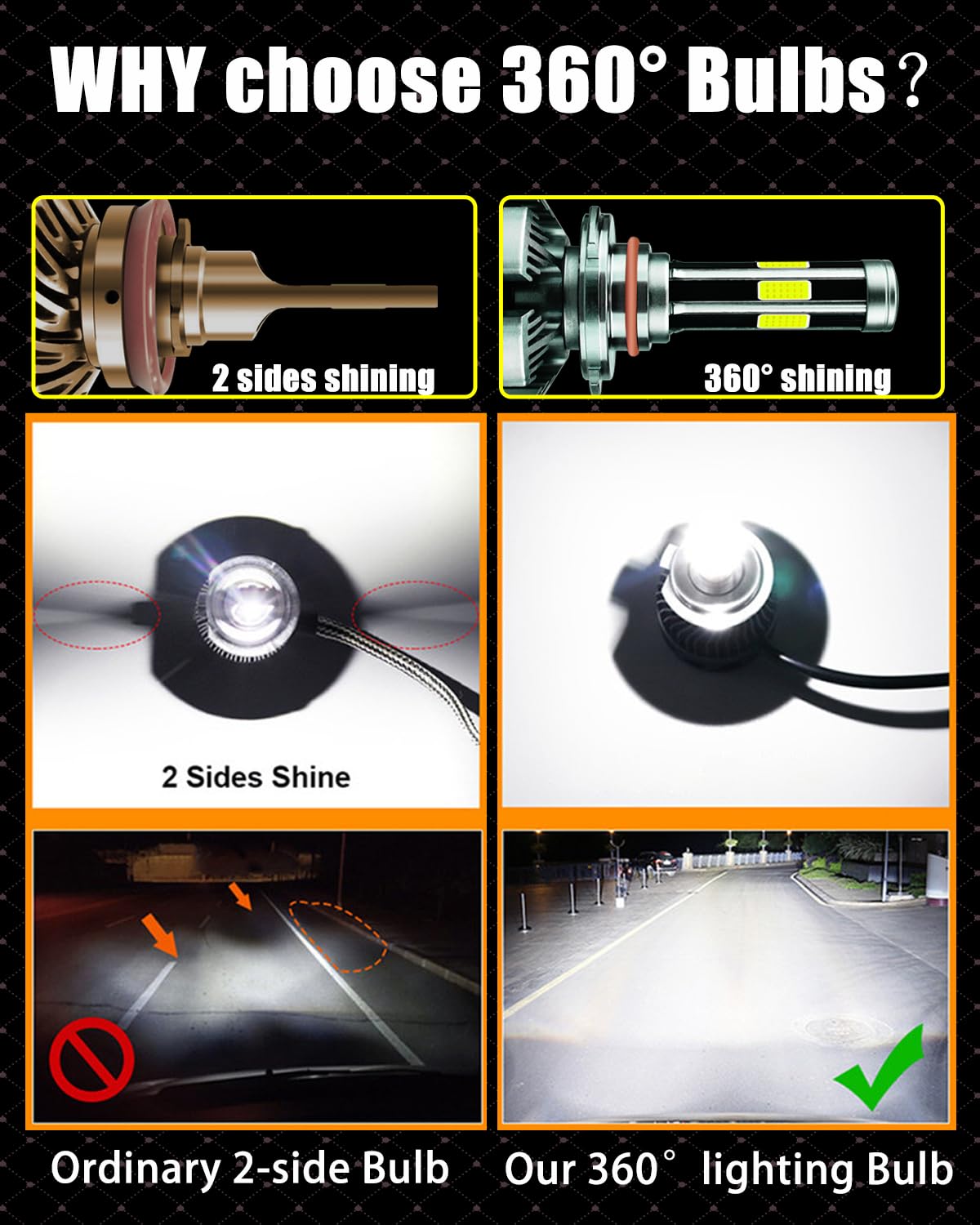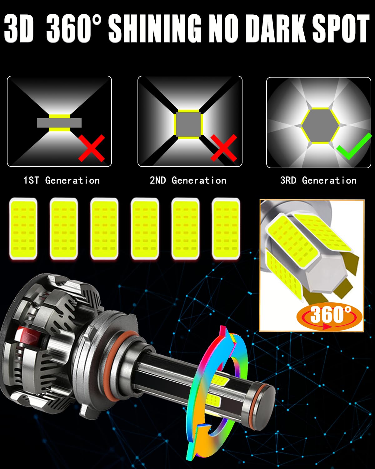 Este kit combo de bombillas 9005+9006 con chips DOB de 6 lados, iluminación de 360 grados sin ninguna zona oscura, no necesita ajustar el ángulo de iluminación. Adopta una clasificación IP68 a prueba de agua, incluso puede funcionar normalmente bajo condiciones adversas, como días lluviosos y con niebla.