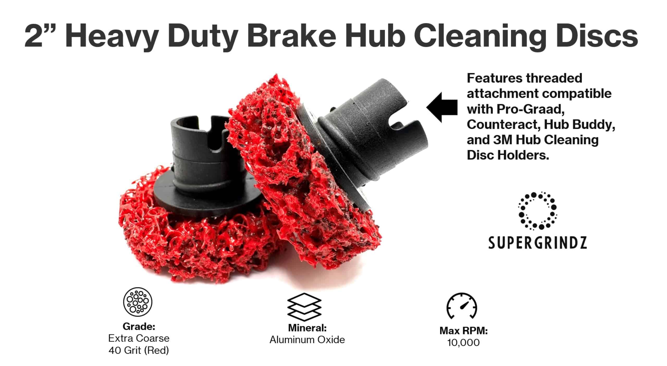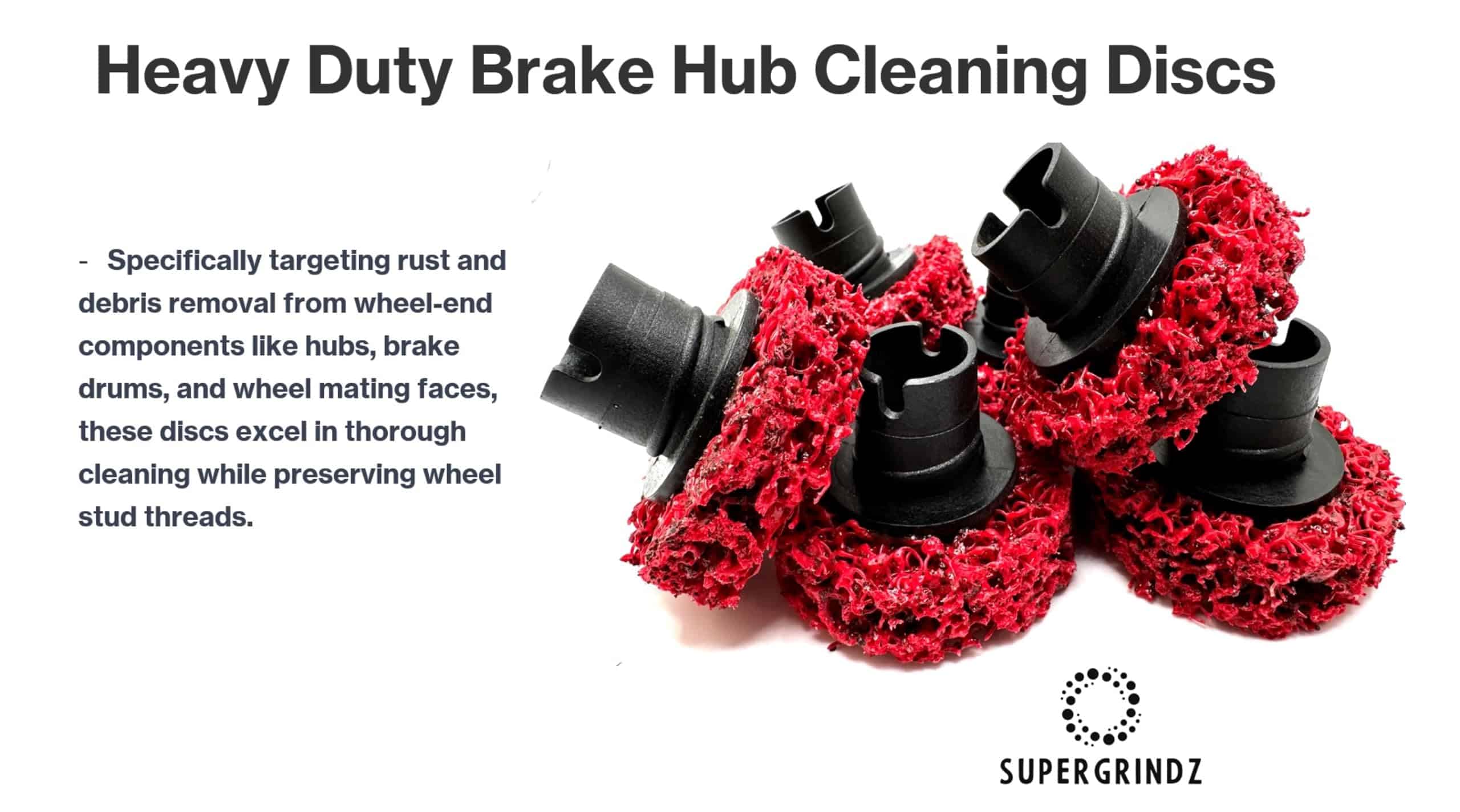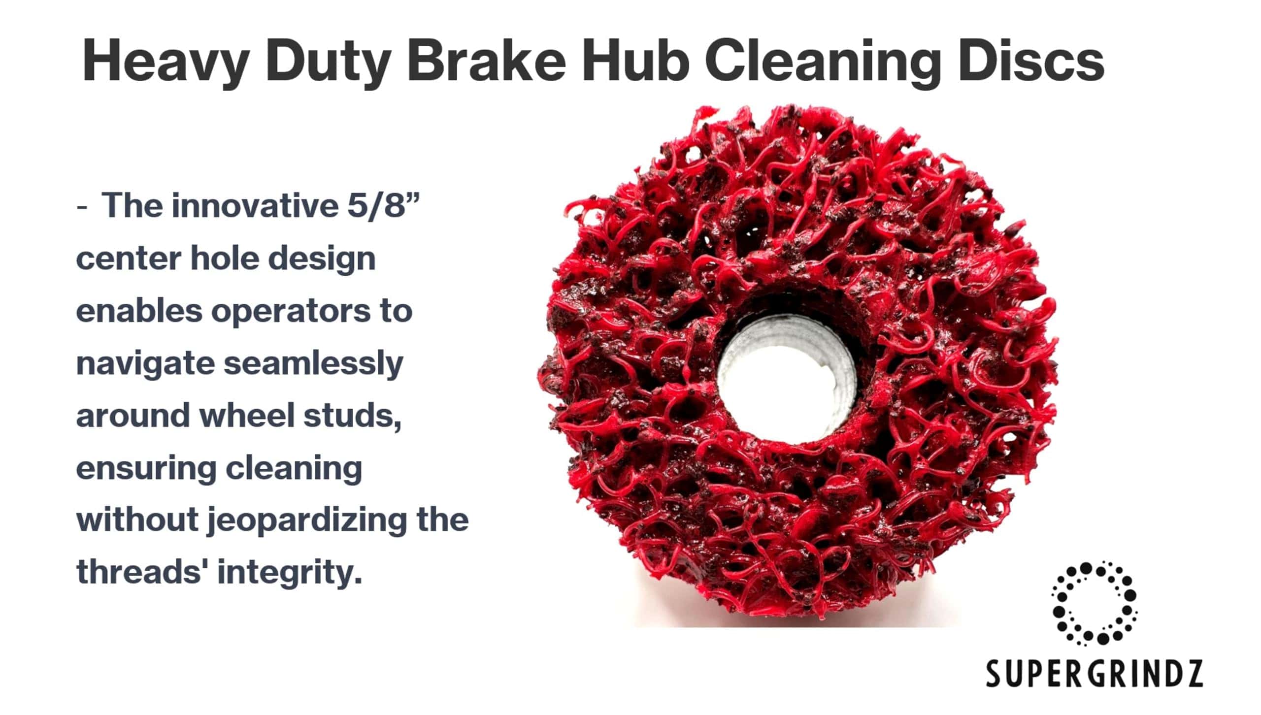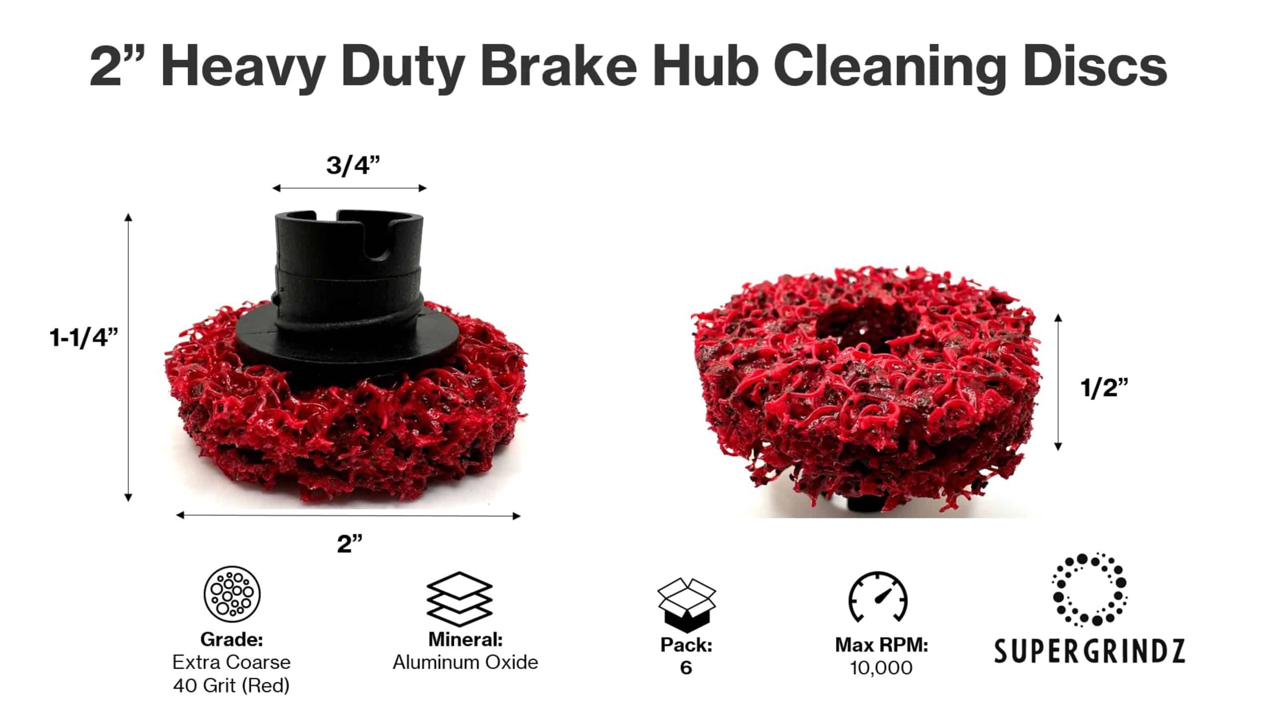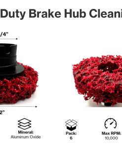 Los discos de limpieza de cubo de freno pesado SuperGrindz están diseñados para eliminar el óxido y la corrosión de los cubos de freno. El disco cuenta con un mineral de óxido de aluminio en una red de nylon no tejida reingenierada para una alta conformabilidad, alta resistencia y baja fragmentación. Paquete de 6 almohadillas de repuesto. Los discos de limpieza de cubo de freno SuperGrindz están diseñados específicamente para eliminar todo el óxido y los desechos de todas las superficies de montaje de la rueda. Está diseñado para limpiar alrededor de un perno de rueda, el cubo, el tambor de freno y las caras de montaje de la rueda. Es importante tener en cuenta que el disco no está diseñado para limpiar los hilos del perno de la rueda en sí, sino todo lo demás alrededor de él. Cuando se monta en el soporte, el agujero central en el disco permite al operador deslizarse sobre y alrededor de los pernos de la rueda para limpiar eficazmente la superficie alrededor del perno de la rueda, todo sin dañar los hilos del perno de la rueda. Para garantizar que se logre el par adecuado, es necesario limpiar todas las superficies roscadas y de montaje de un extremo de la rueda a fondo para garantizar que se logre la fuerza de sujeción adecuada, proporcionando a su vez el par adecuado. Diseñado para usarse con aplicaciones de Automóviles, SUV, Camioneta Ligera, Remolque de Utilidad, UTV y ATV. NOTA: Para obtener el mejor rendimiento, opere a bajas velocidades por debajo de 10,000 RPM, y solo en dirección hacia adelante (en sentido horario).