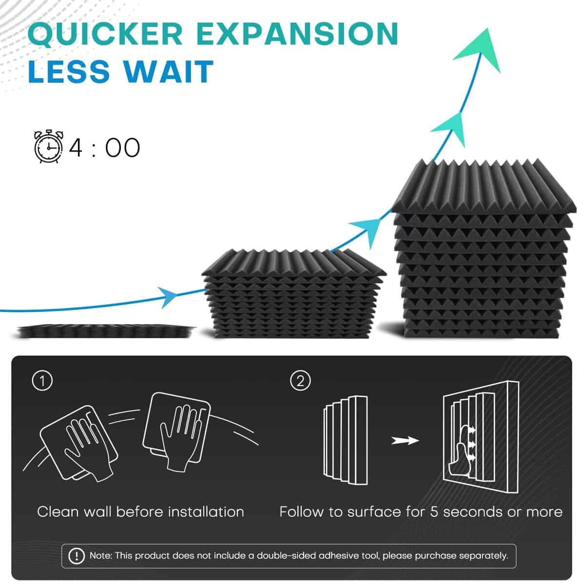 5. INSTALACIÓN SIN ESFUERZO Nuestro panel absorbente de sonido está fabricado con espuma acústica suave y de calidad profesional, diseñada para flexibilidad y facilidad de instalación. Tenga en cuenta: este producto no incluye adhesivo. Para una instalación perfecta, combínelo con nuestro adhesivo cuadrado (buscar B0CFV11LVN) para transformar su espacio en un oasis de tranquilidad.