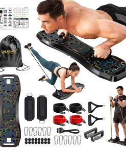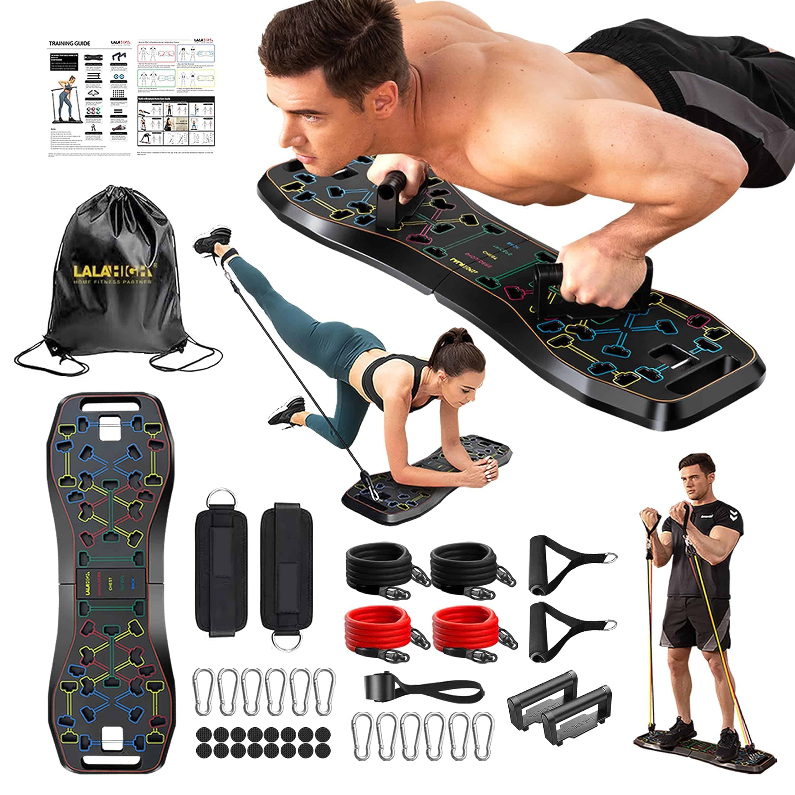 2. Materiales de Alta Calidad y Diseño Antideslizante: La tabla de flexiones está hecha de plástico ABS duradero, capaz de soportar altas cargas. Los mangos cuentan con un diseño antideslizante y materiales, reduciendo la presión en las muñecas, codos y articulaciones para una experiencia de entrenamiento más cómoda. Las bandas de resistencia y la barra de Pilates también están hechas de materiales de alta calidad, garantizando seguridad y durabilidad durante su uso. 3. Entrenamiento Multifuncional: La tabla de entrenamiento multifuncional cuenta con un diseño y guía actualizados codificada por colores. Dirigiéndose a diferentes grupos musculares (pecho, hombros, abdominales, bíceps, espalda), la tabla de flexiones LALAHIGH combinada con las bandas de resistencia con barra, barra de Pilates y polea ofrece varias posiciones de entrenamiento, permitiendo más ángulos de flexiones y variaciones de ejercicio. 4. Portátil y Fácil de Guardar: la tabla de flexiones en el set es ligera y se puede doblar 180 grados. Ya sea usada en casa, en la oficina o en el gimnasio, este equipamiento de entrenamiento en casa mantiene la estabilidad en cualquier superficie del piso. Es el equipo de gimnasio en casa ideal para hombres y mujeres, fácil de guardar y transportar. 5. El Regalo y El Servicio: Este kit de gimnasio en casa es estéticamente atractivo y de alta calidad, haciéndolo un regalo ideal para amigos o cualquiera que busque hacer ejercicio.