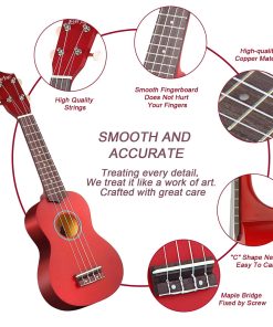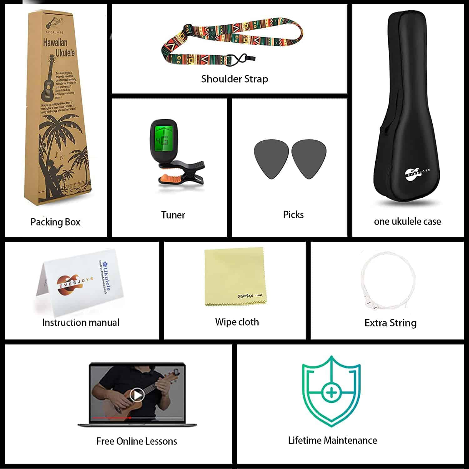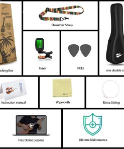 ¡Ahora finalmente puedes aprender a tocar el instrumento musical más exótico y melódico fácilmente! El ukelele, originalmente diseñado en Hawai, ha ganado una increíble popularidad durante los últimos 80 años debido a su increíble sonido, tamaño conveniente y proceso de aprendizaje extremadamente sencillo. ¡Ahora puedes hacer realidad tu sueño de toda la vida de aprender a tocar un instrumento musical con nuestro exclusivo set de inicio de ukelele! ¡El sonido del ukelele calmará tu alma! ¡Enséñate cómo tocar el ukelele con el kit de inicio definitivo de EVERJOYS! La artesanía de calidad superior, los materiales premium y la construcción duradera de nuestro ukelele soprano de 21″ seguramente te impresionarán! ¡Diviértete y aprende música al mismo tiempo! Nuestro ukelele de 21″ arcoíris presenta cuerdas coloridas, con cada color representando una nota diferente, simplificando así el proceso de aprendizaje. Además, el útil Cancionero te ofrecerá la ayuda necesaria para practicar y perfeccionar tus habilidades