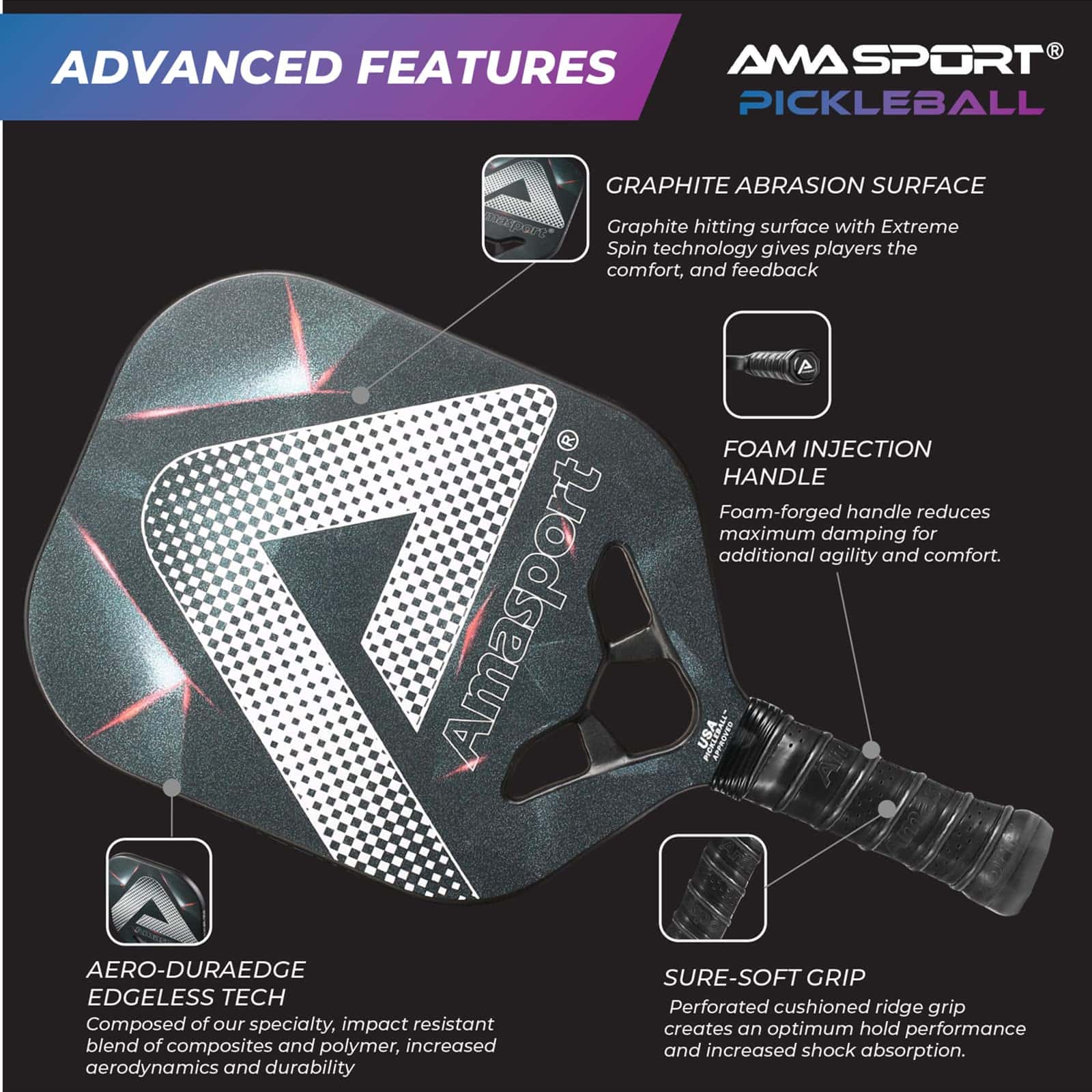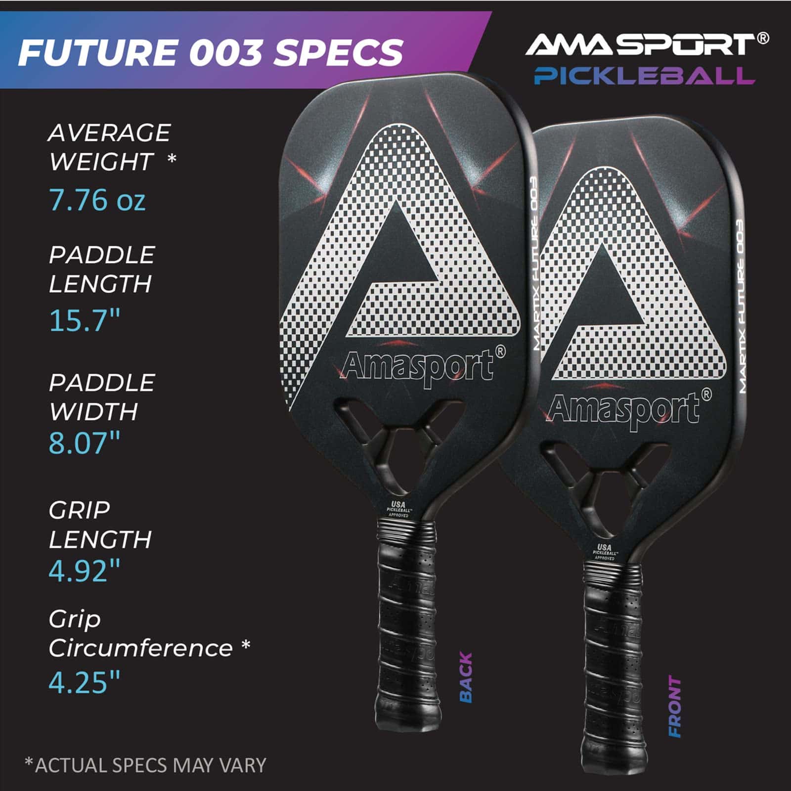 1. Forma de Pala Estándar con Mango Estándar: La Serie Matrix Future presenta el punto dulce más grande de todas las formas de palas AMA Sport, la serie Future ofrece potencia amplificada y consistencia confiable. Su forma tradicional y área de superficie extra grande se combina con un mango forjado en carbono para ofrecer a los jugadores un control definitivo en la cancha.