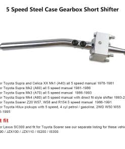 Nota: No apto para vehículos equipados con un soporte de trípode / palanca de cambios remota. Si tiene un Supra MK4 o un vehículo que haya sido instalado con W55 / W57 / W58 / R154, se recomienda encarecidamente que revise debajo del automóvil para ver qué palanca de cambios. Si su palanca de cambios está montada directamente en la transmisión, la palanca de cambios encajará. Si instala la palanca de cambios en el marco en la parte trasera de la caja de cambios, tendrá una palanquería remota / trípode. La palanca de cambios no encajará