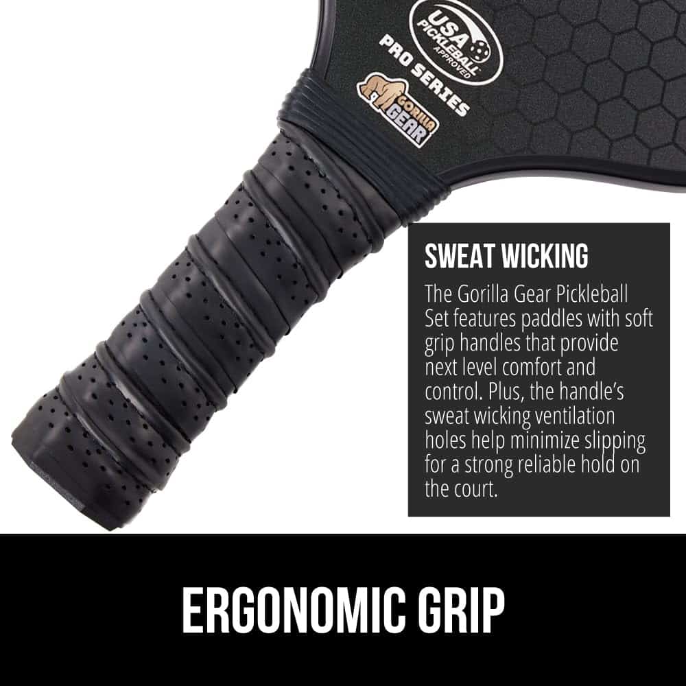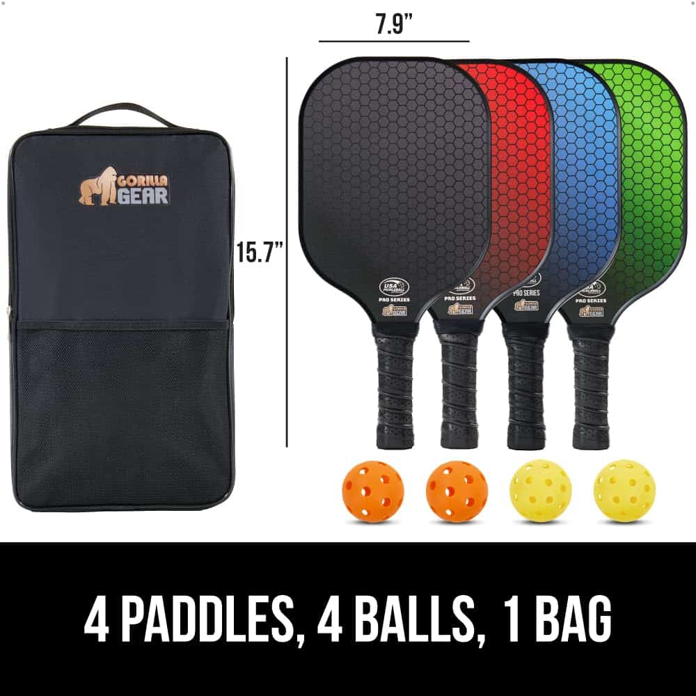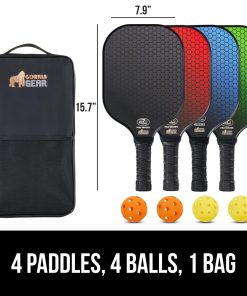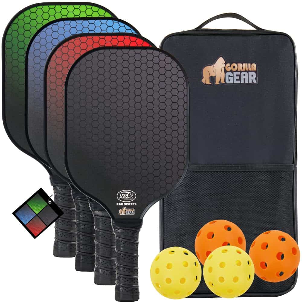 1. ENCUENTRO DE POTENCIA Y PRECISIÓN, SET DE 9 PIEZAS: aumenta tu ventaja competitiva con el Set de Pickleball de Gorilla Gear; perfecto para jugadores de todos los niveles de experiencia, incluso para principiantes; funciona para jugadores diestros o zurdos; el set incluye 4 paletas potentes, 2 pelotas de interior, 2 pelotas de exterior y estuche de transporte.
