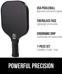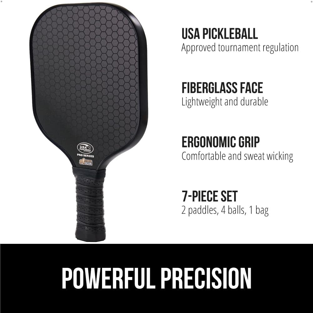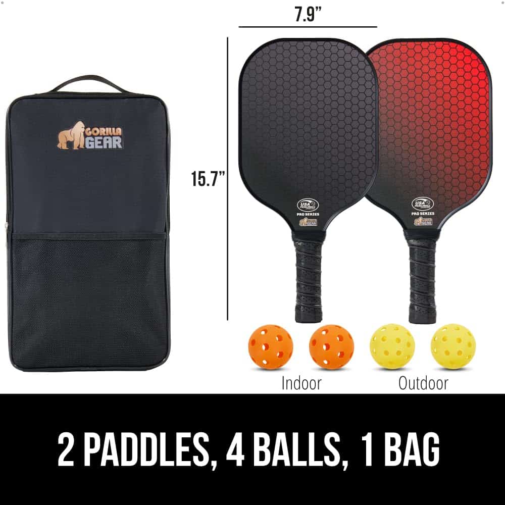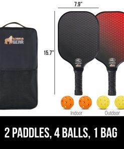 1. ¡PODER Y PRECISIÓN SE UNEN, SET DE 7 PIEZAS: aumente su ventaja competitiva con el Set de Pickleball Gorilla Gear; perfecto para jugadores de todos los niveles de experiencia, incluso ideal para principiantes; funciona para jugadores diestros o zurdos; el set incluye 2 paletas potentes, 2 pelotas de interior, 2 pelotas de exterior y estuche de transporte. 2. SERIE PRO, APROBADO POR USA PICKLEBALL: la paleta está aprobada por USA Pickleball para cumplir con los estándares del torneo; la cara de fibra de vidrio de la paleta es liviana para ayudar a reducir el tiempo de reacción y facilita el cambio entre el golpe de derecha e izquierda; bordes reforzados para mejorar la resistencia y uso duradero; núcleo de panal de polipropileno para mayor estabilidad. 3. ABSORBENTE DE CHOQUES PARA UN IMPACTO REDUCIDO: la paleta de regulación proporciona una experiencia de juego suave, equilibrada y controlada; el mango recubierto de PU ayuda a absorber los golpes; punto dulce extragrande para golpes más consistentes y óptimos. 4. MANGO CON AGARRE ERGONÓMICO CÓMODO: los agujeros de ventilación que absorben el sudor en el mango de las paletas ayudan a minimizar el deslizamiento y brindan a los jugadores un agarre sólido y cómodo para un control mejorado. 5. BOLSA DE TRANSPORTE FÁCIL CON BOLSILLOS EXTERIORES DE MALLA: el estuche de transporte cuenta con un bolsillo de malla exterior para las pelotas y una correa para el hombro conveniente; la paleta mide 15.7 pulgadas por 7.9 pulgadas y pesa 8 onzas.