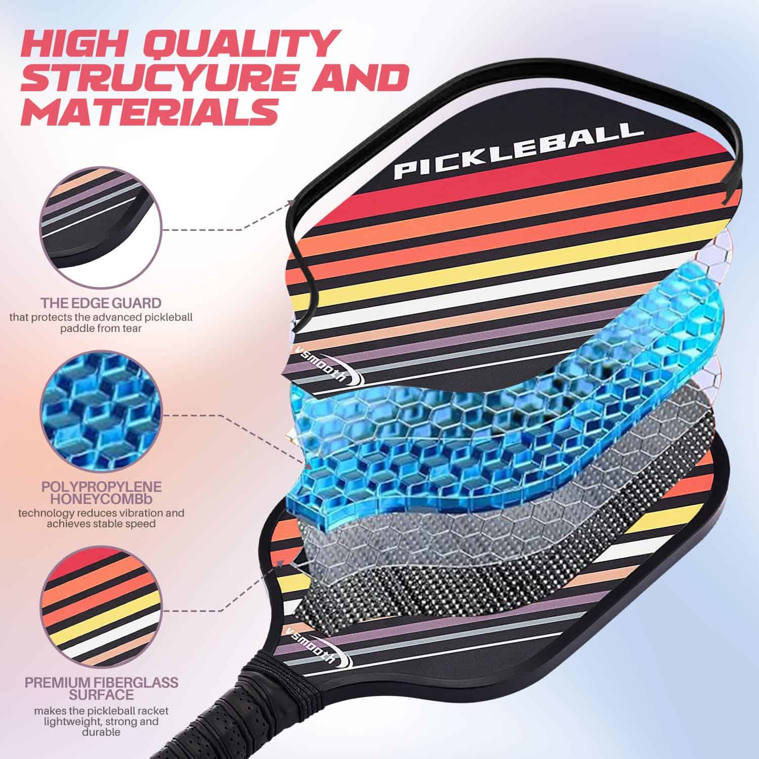 Con una superficie de fibra de vidrio de alta calidad y un núcleo de panal de polipropileno, la raqueta brinda un excelente rendimiento con una combinación de potencia y control. La resistencia en la superficie de fibra de vidrio y el control del núcleo de polipropileno hacen que esta raqueta sea ideal para jugadores que buscan un equipo de alto rendimiento.