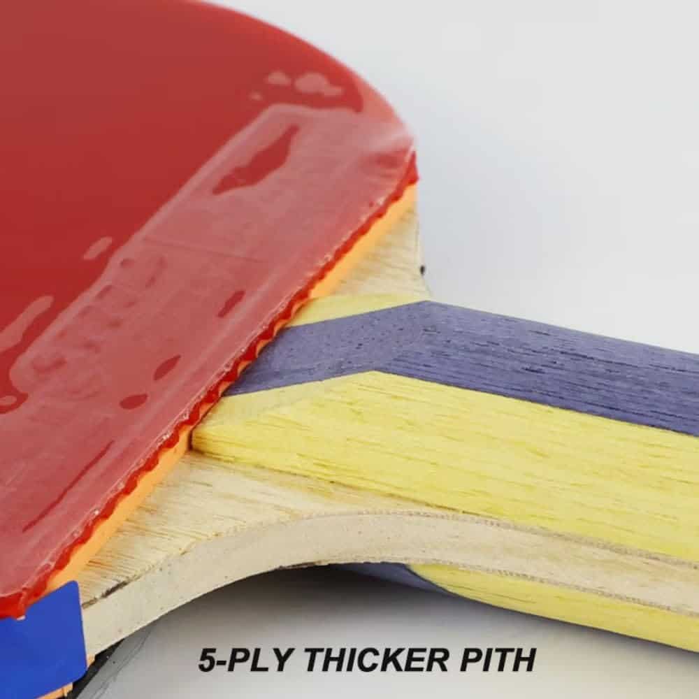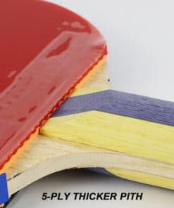 Equilibrio y Características: Medio, Rendimiento Integral de Ataque y Defensa, pith más grueso de 5 capas buena sensación en mano; Tipo de Control de Raqueta Controla al oponente Ataque y defensa libre, cambio fácil entre forehand y backhand Adecuado para jugadores de tenis de mesa todo terreno Hoja Profesional Todo Terreno con Núcleo Grueso Estructura de Madera Resistente Buena sensación en mano Gomas DHS Hurricane 3 Pimples-in para ambos lados, y viscoso elástico Hurricane 3, goma china clásica