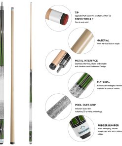 1. Estilo de diseño: Palo de billar – Cada longitud de taco de billar es de 58 pulgadas, Agarre impreso en 3D. La superficie del cuerpo del palo es plana y suave, terminada con una punta de 13mm – Cabeza de cuatro capas de cuero de vaca, los palos de billar son adecuados para jugadores de competición profesional. 2. Ampliamente utilizado: Este palo de billar tiene una sensación agradable al tacto, muy amigable para un agarre firme. El extremo tiene un tope de goma negra que no daña fácilmente el palo cuando lo colocas en posición vertical en el suelo. 3. Alta calidad: Estos palos de billar cuentan con tapers profesionales para un disparo preciso y recto, ¡como los palos más caros! ¡Incluso los jugadores avanzados quedan impresionados con la precisión y control que se ofrece, para que puedas estar seguro de obtener mucho por tu dinero! 4. Material premium: Los palos de billar están hechos de madera de arce, acabados con pintura mate. Presentan un diseño de palo de billar de dos piezas para un fácil transporte y almacenamiento. 5. Postventa sin preocupaciones: Nuestros palos de billar ofrecen una garantía de devolución de 30 días y devolución de dinero. Soporte de servicio al cliente las 24 horas, por favor contáctenos por mensaje de pedido.
